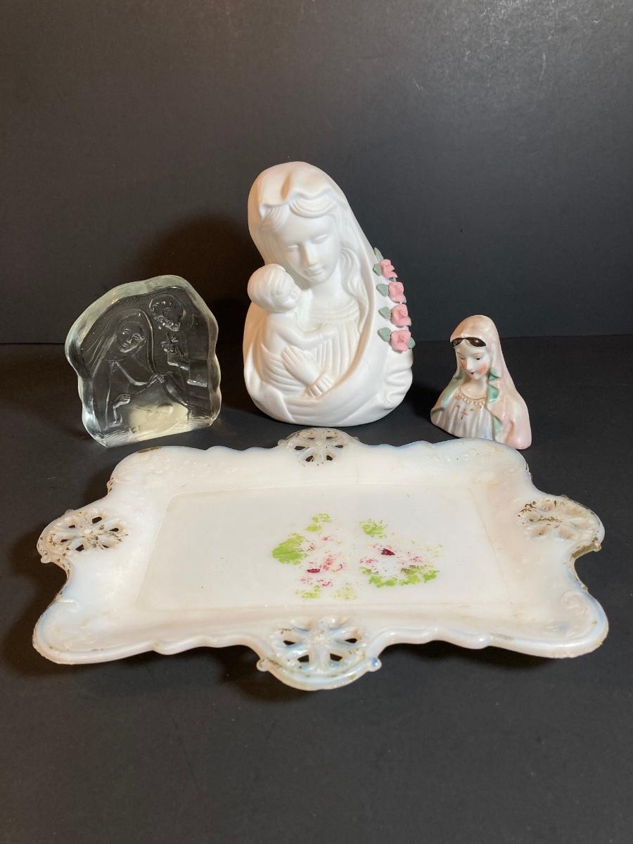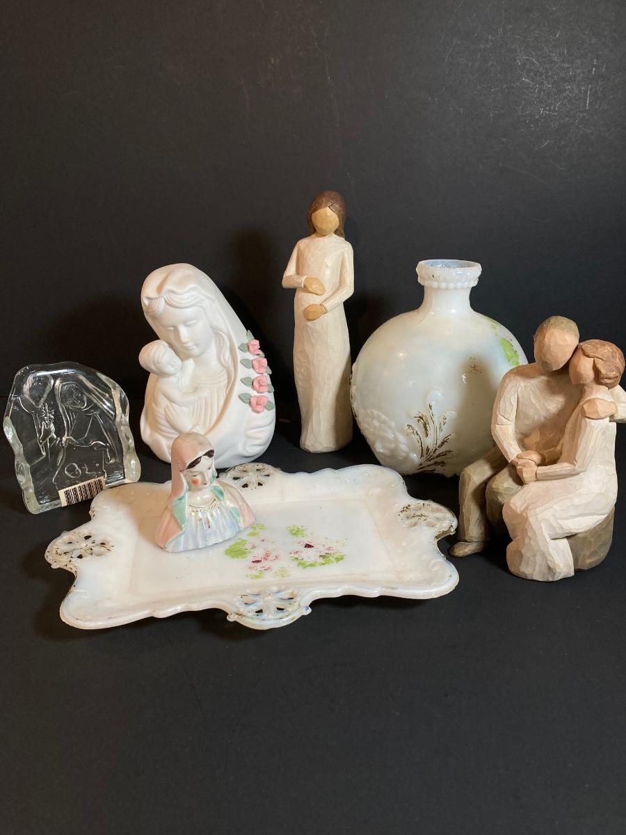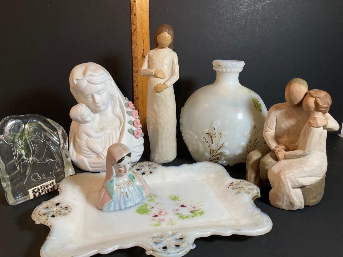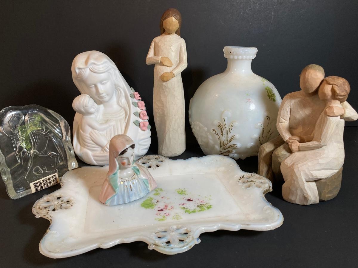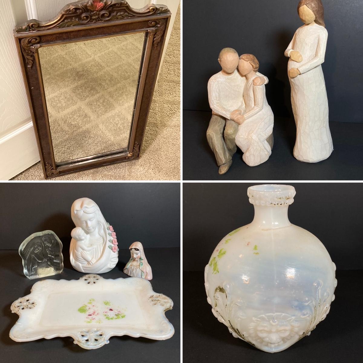 LOT 148L: Collection of Vintage Home Decor - Victorian Milk Glass, Carved Wood Wall Mirror, Willow Tree Figurines and More