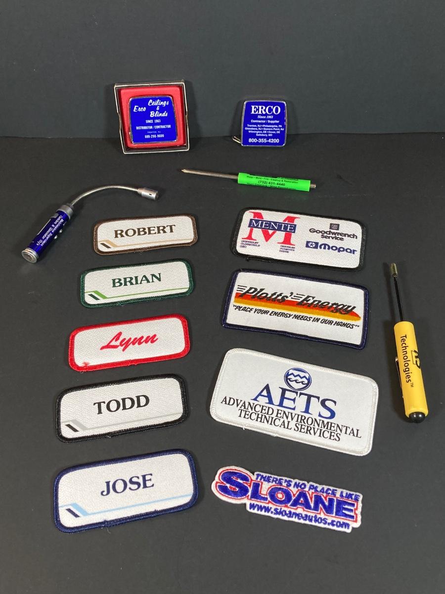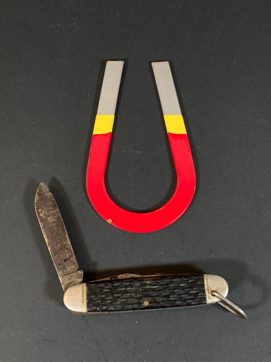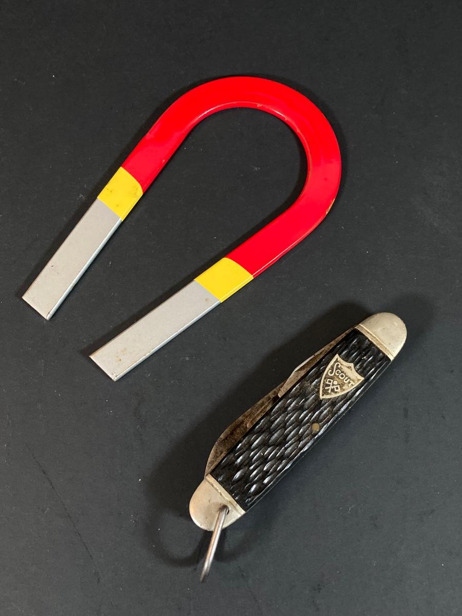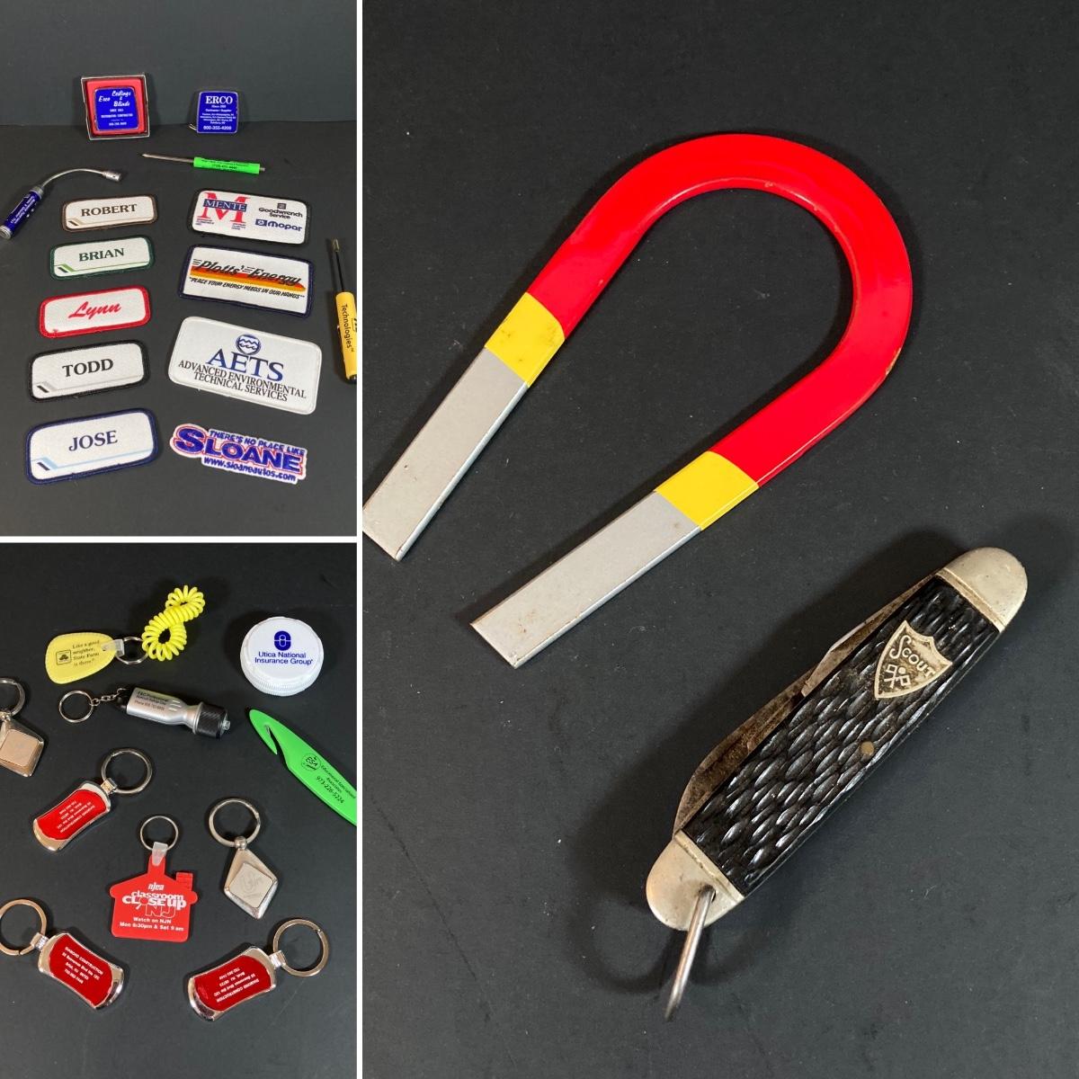 LOT 149L: Vintage Horse Shoe Magnet, Scout Folding Pocket Knife, Patches, Key Chains, Tools and More