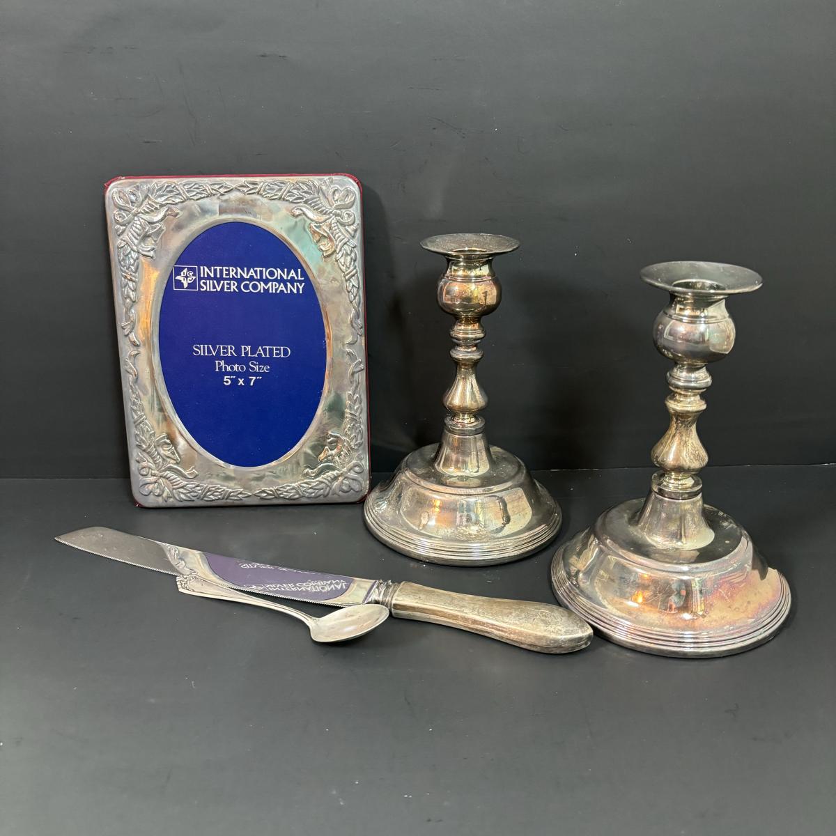 LOT 160: Sterling Silver Spoon, Knife w/Sterling Silver Handle, Party Lite Mosaic Ornament, Margaret Furlong Ornament, Silver Plated Photo Frame/Album, Candle Sticks & More
