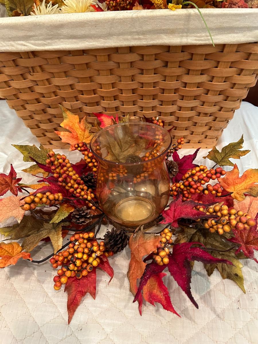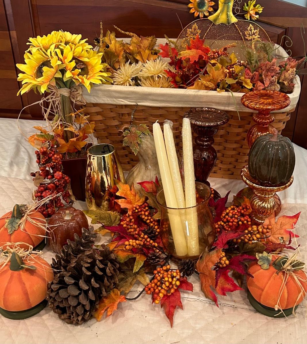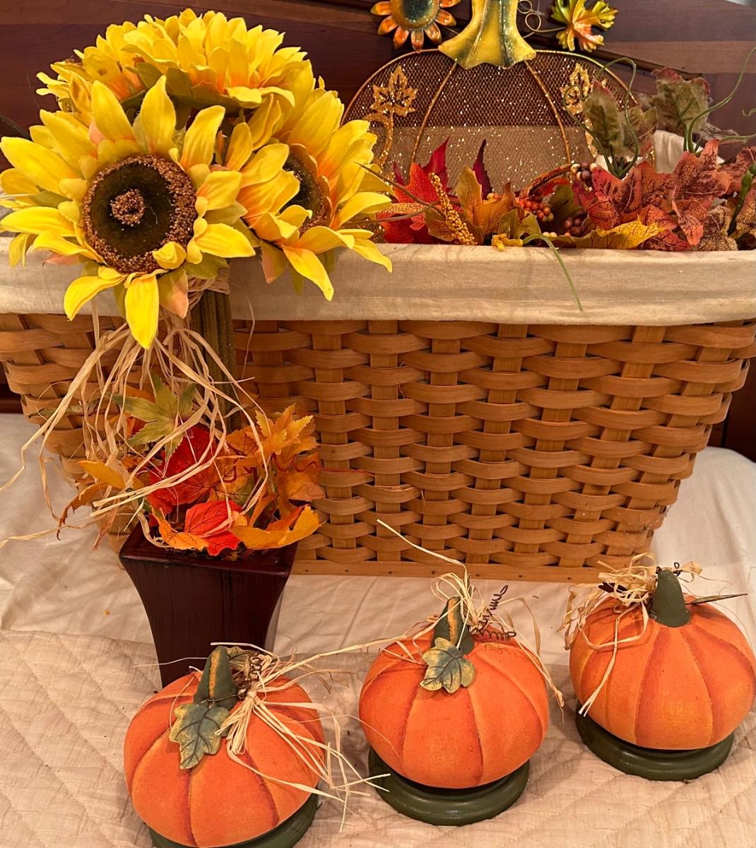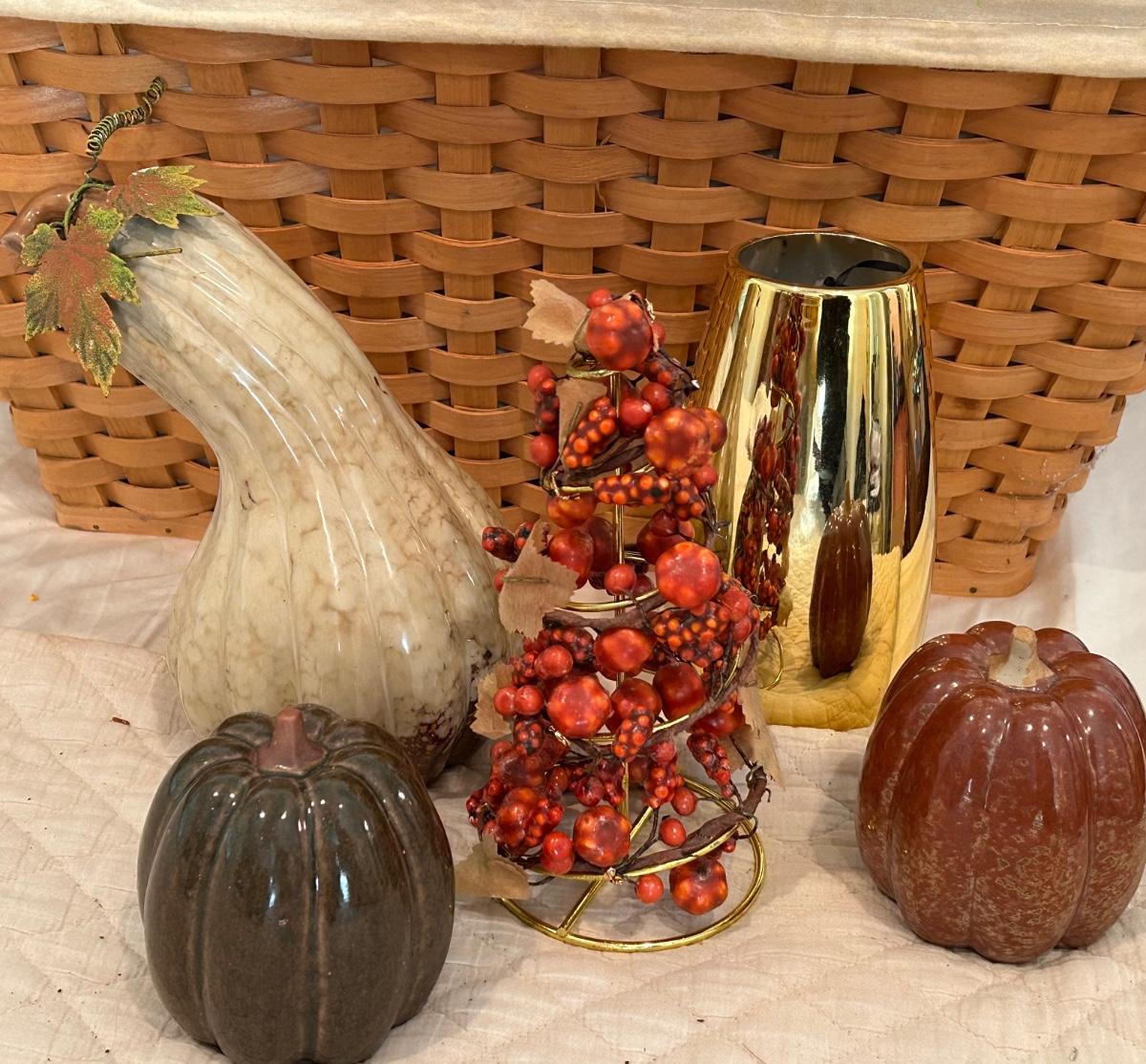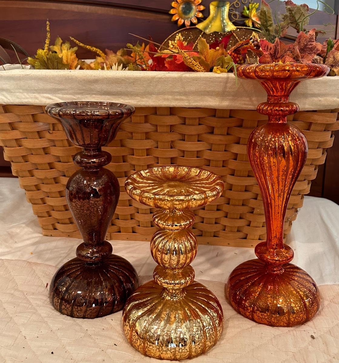 LOT 169: Basket of Fall: Mercury Glass Candle Stick Holders, Faux Pumpkins & Foliage