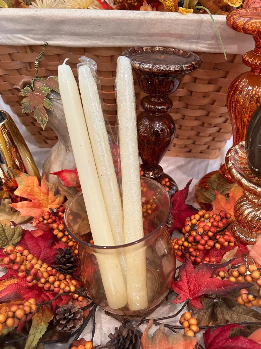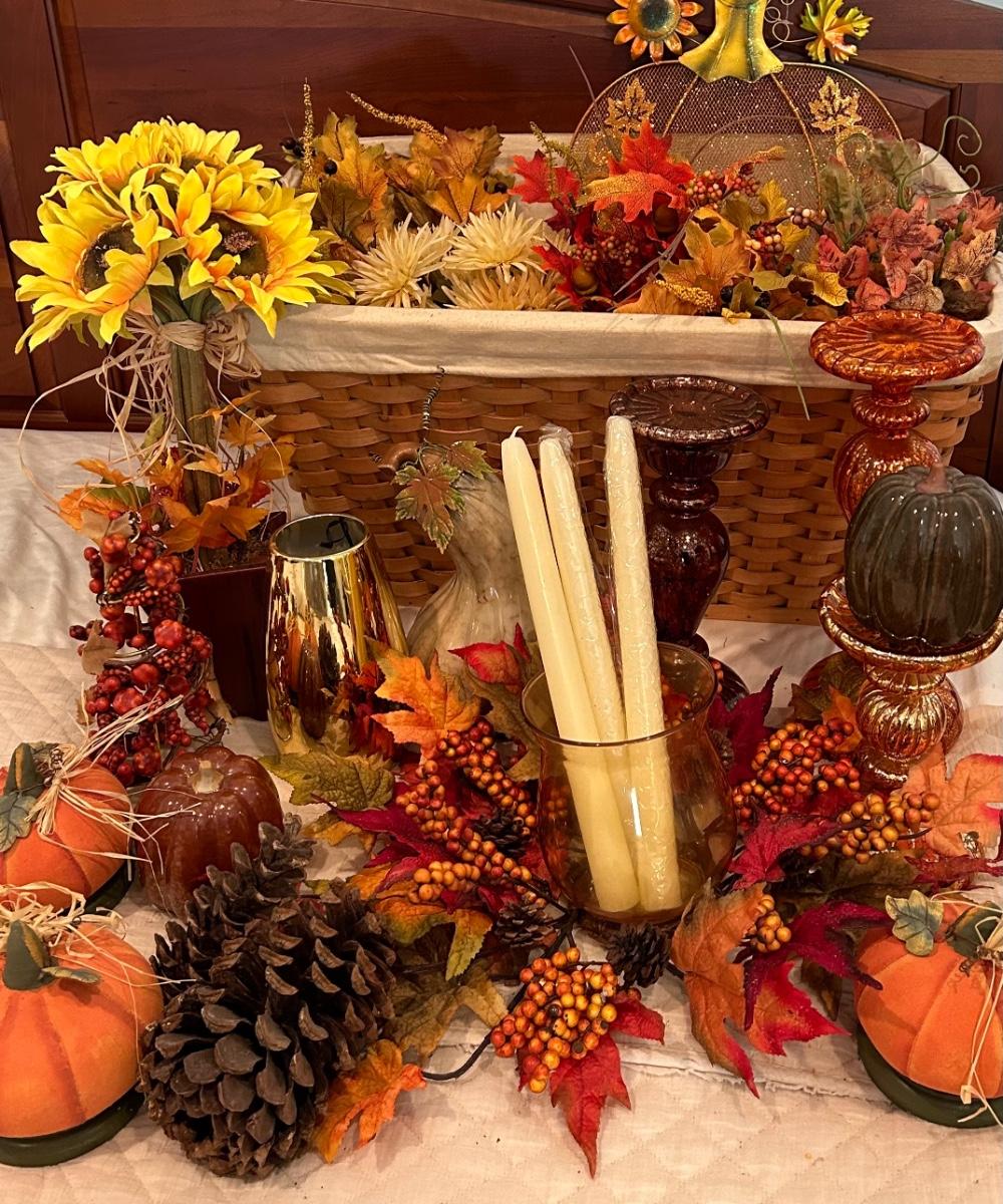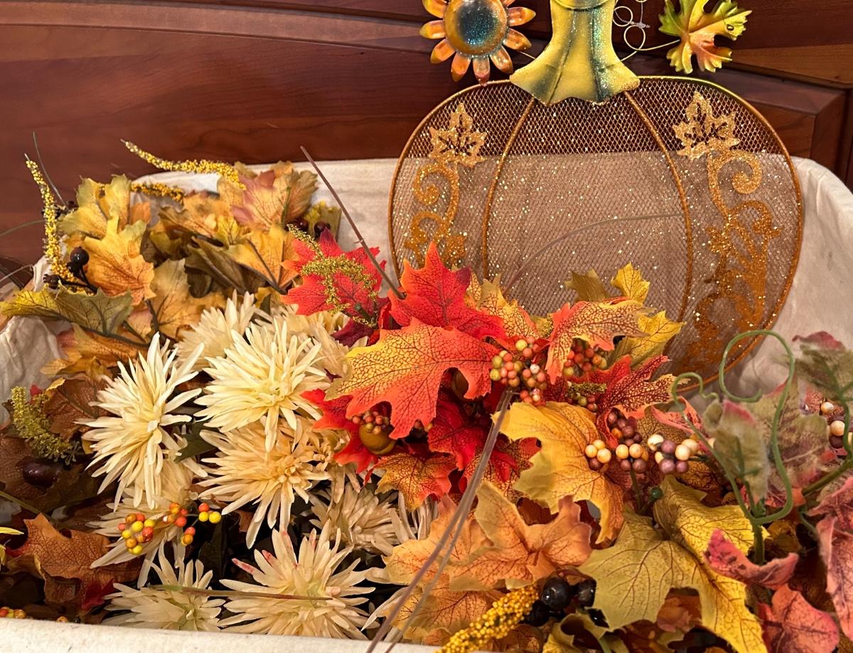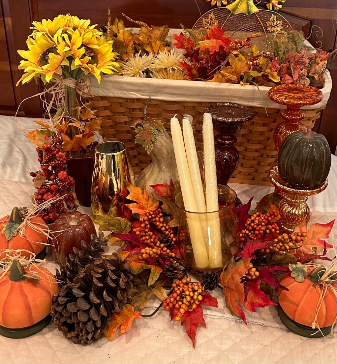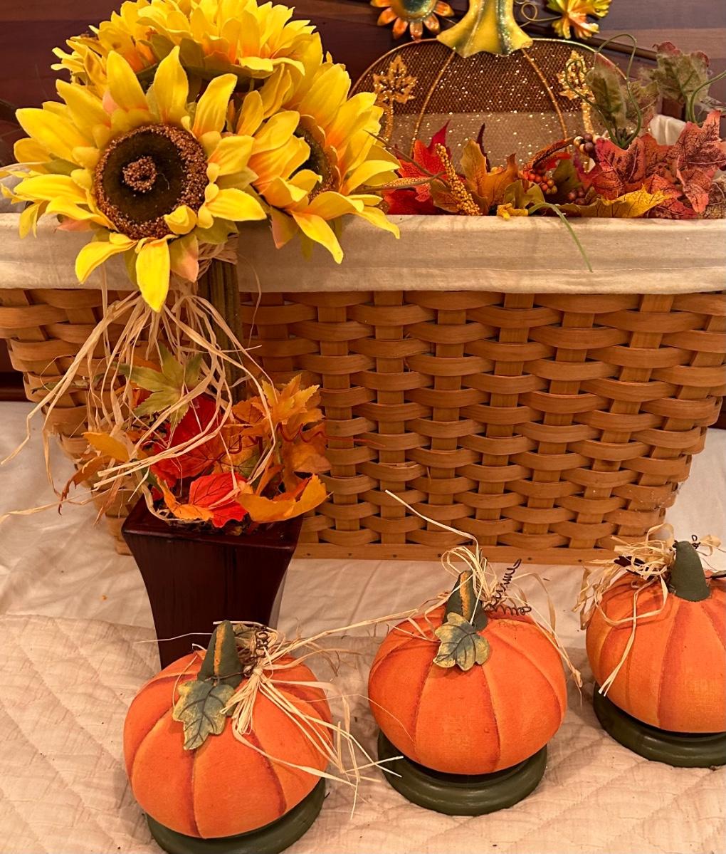 LOT 169: Basket of Fall: Mercury Glass Candle Stick Holders, Faux Pumpkins & Foliage