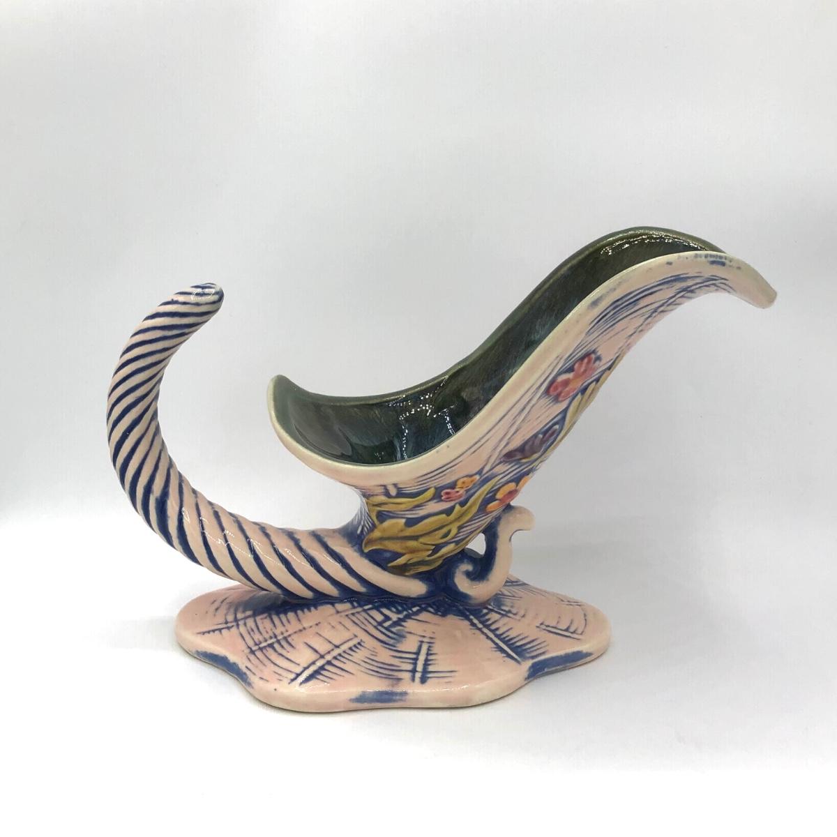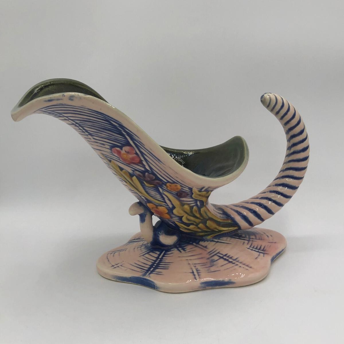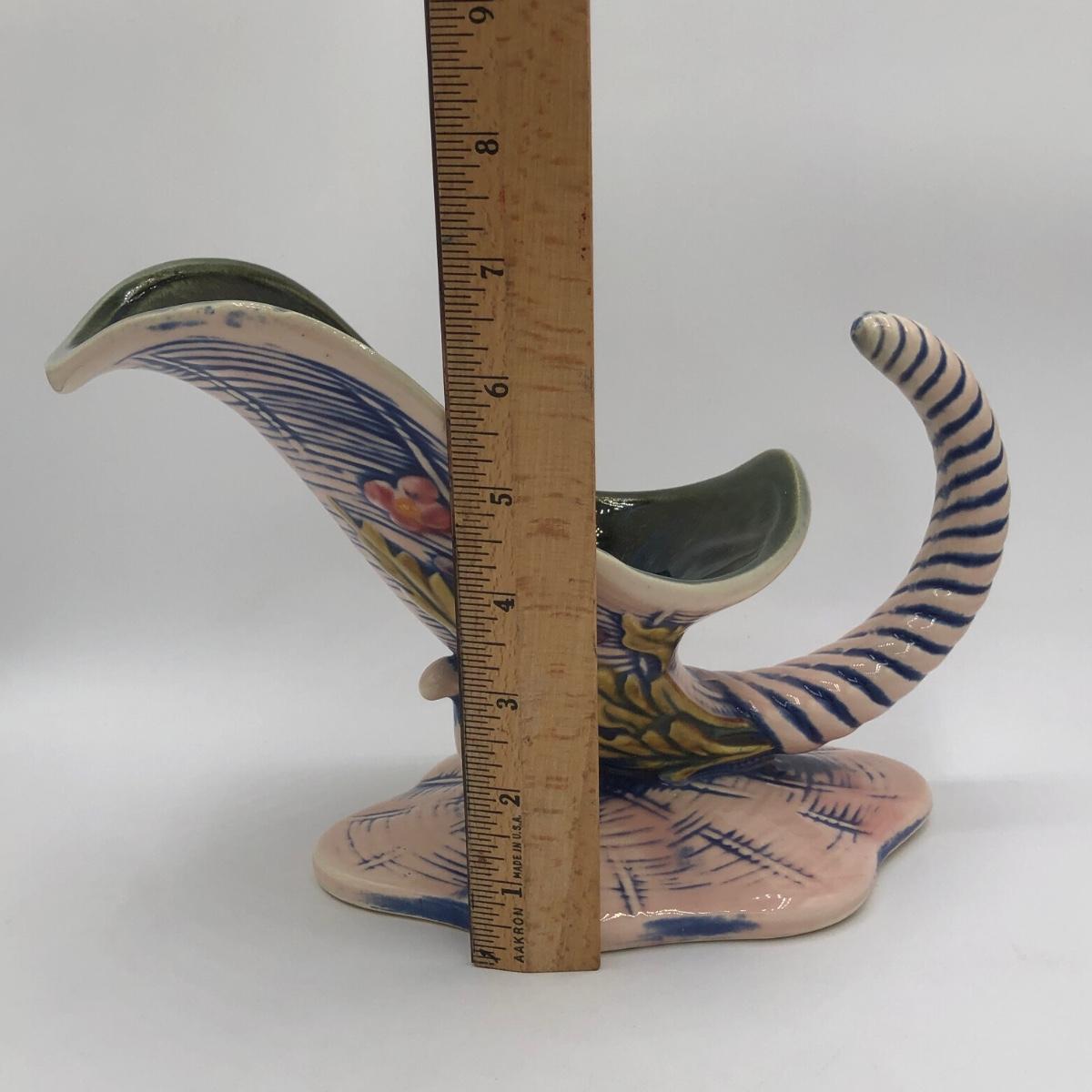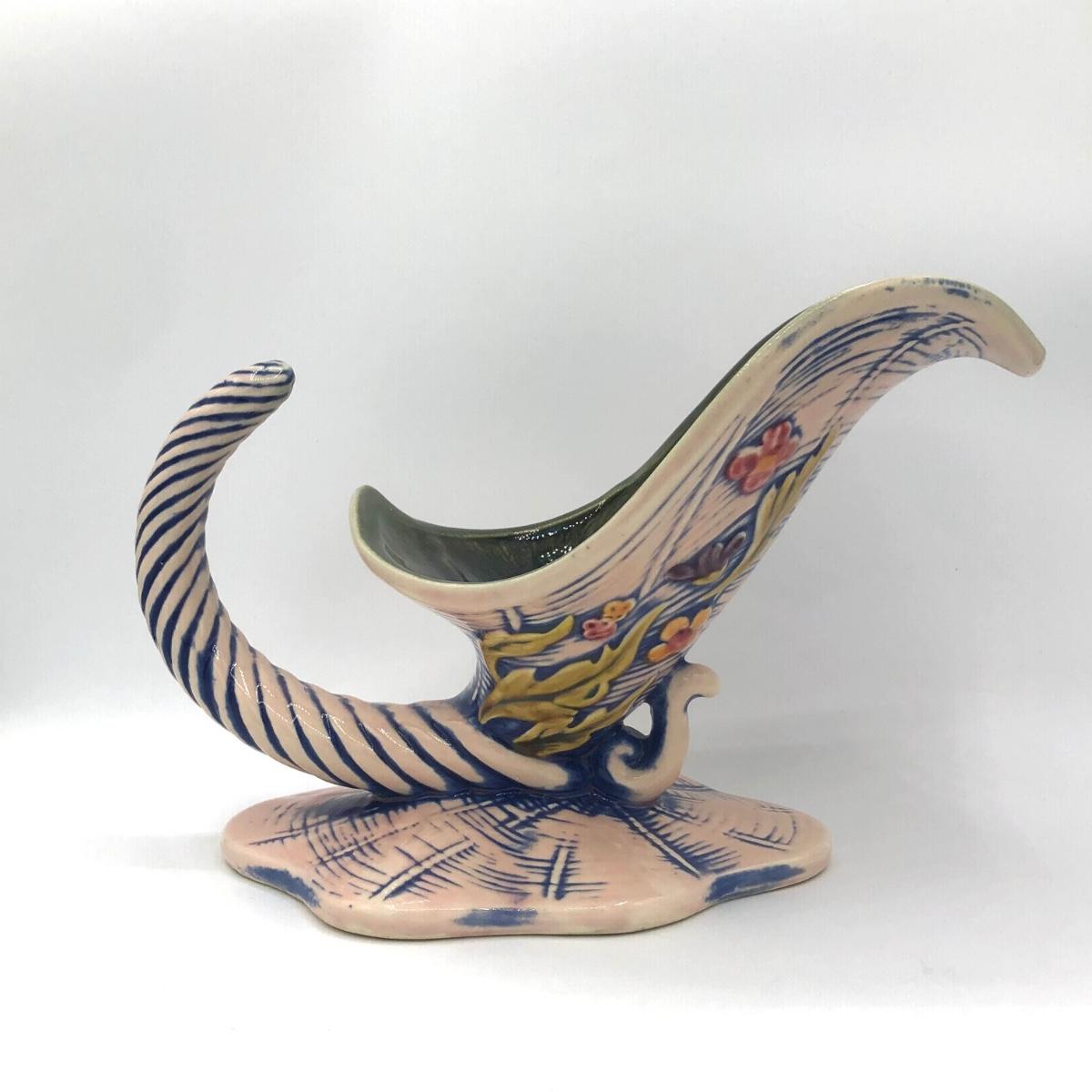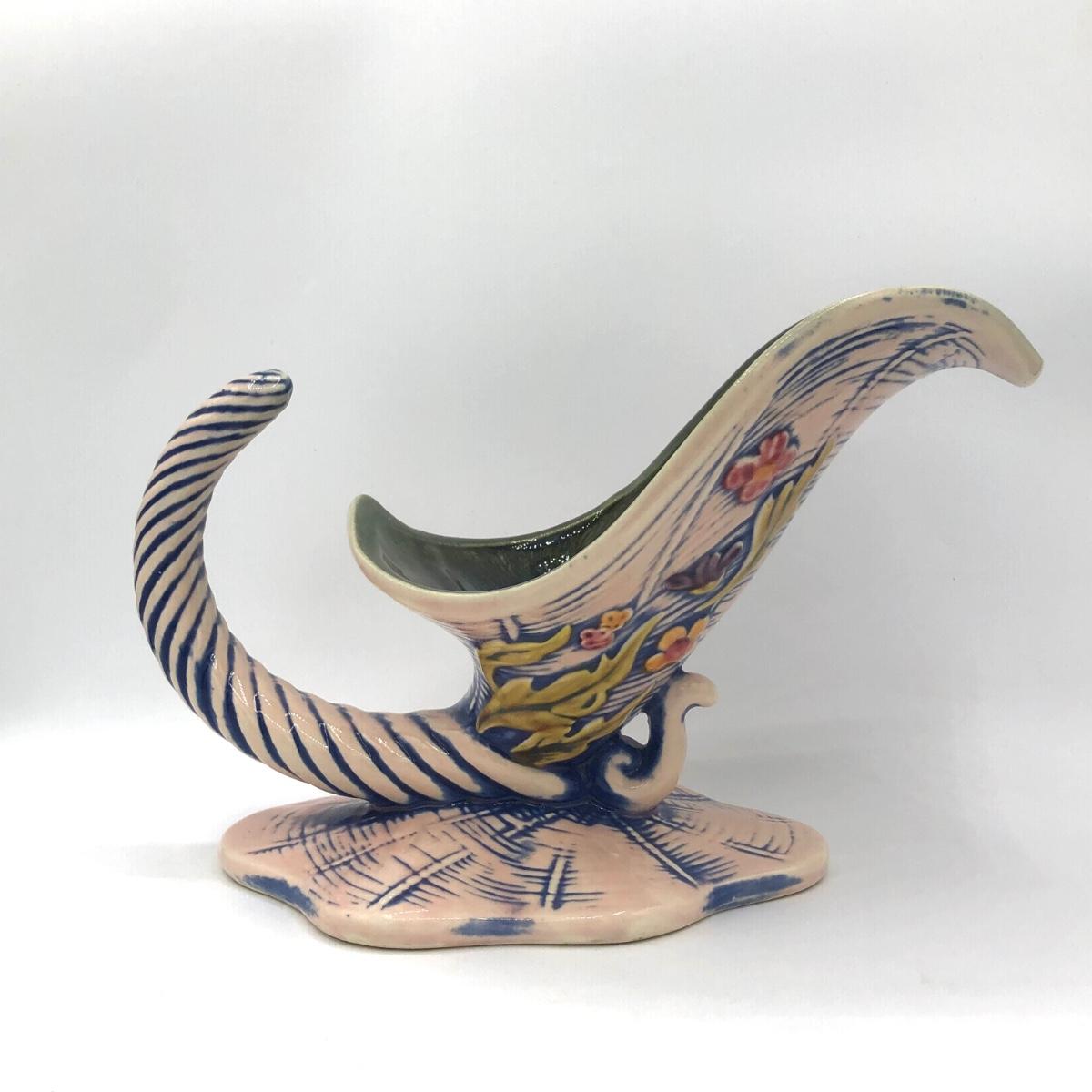 LOT 27L: Unique Pink & Green 1955 Hull USA Art Pottery Blossom Flight T6 Cornucopia Vase