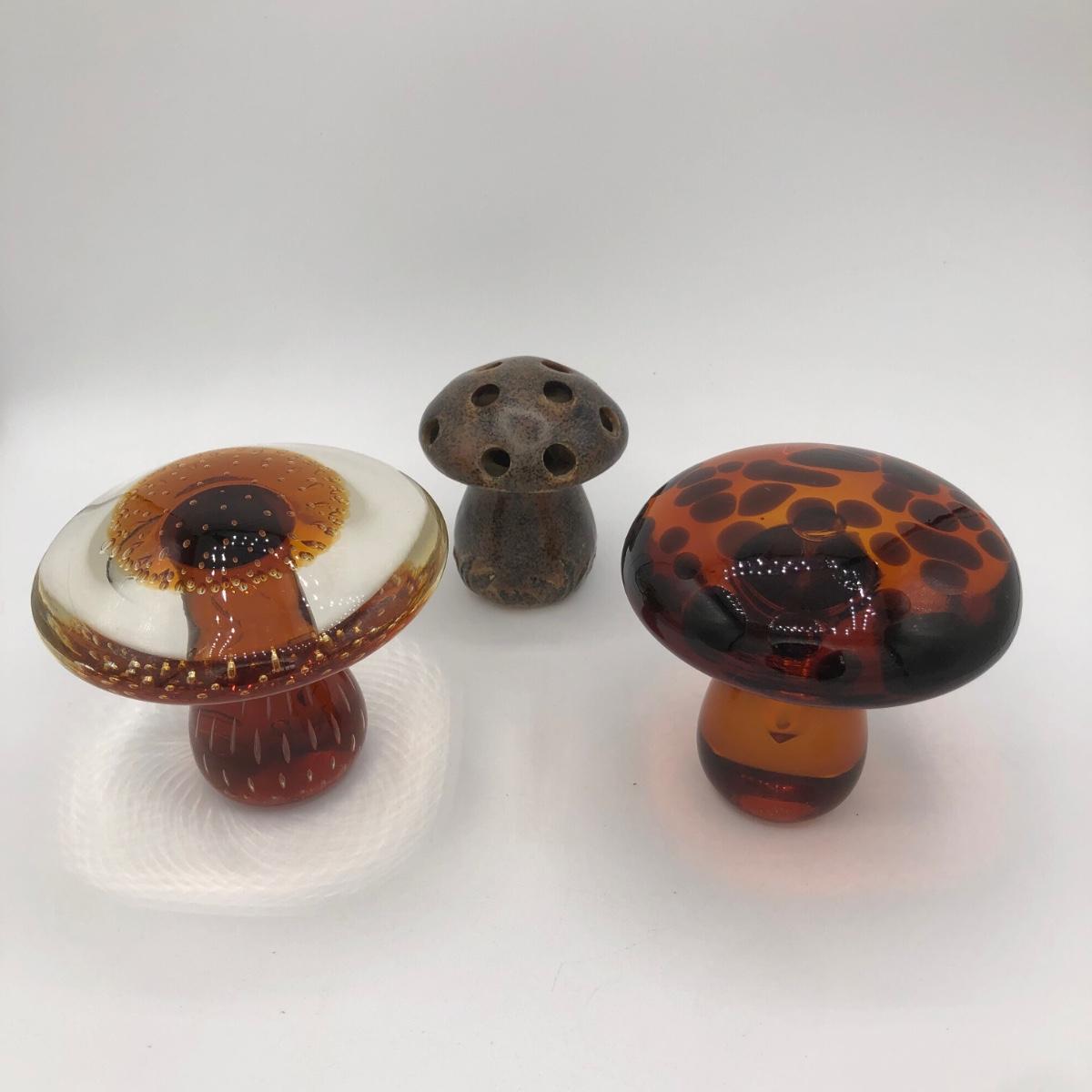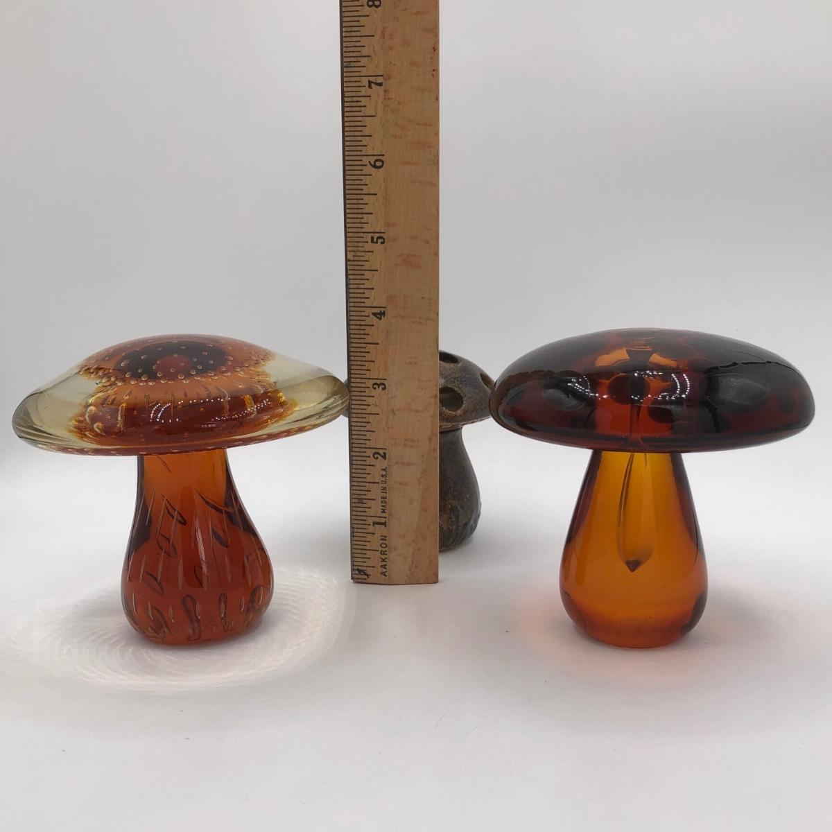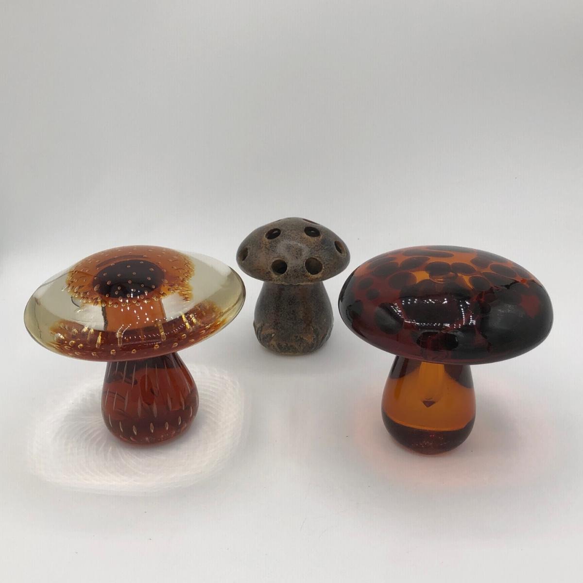 LOT 30L: Art Glass Mushroom Paperweights & Vintage OMC Ceramic Mushroom Flower Frog