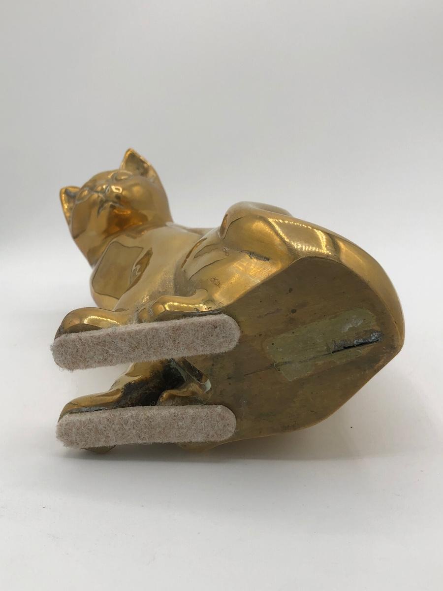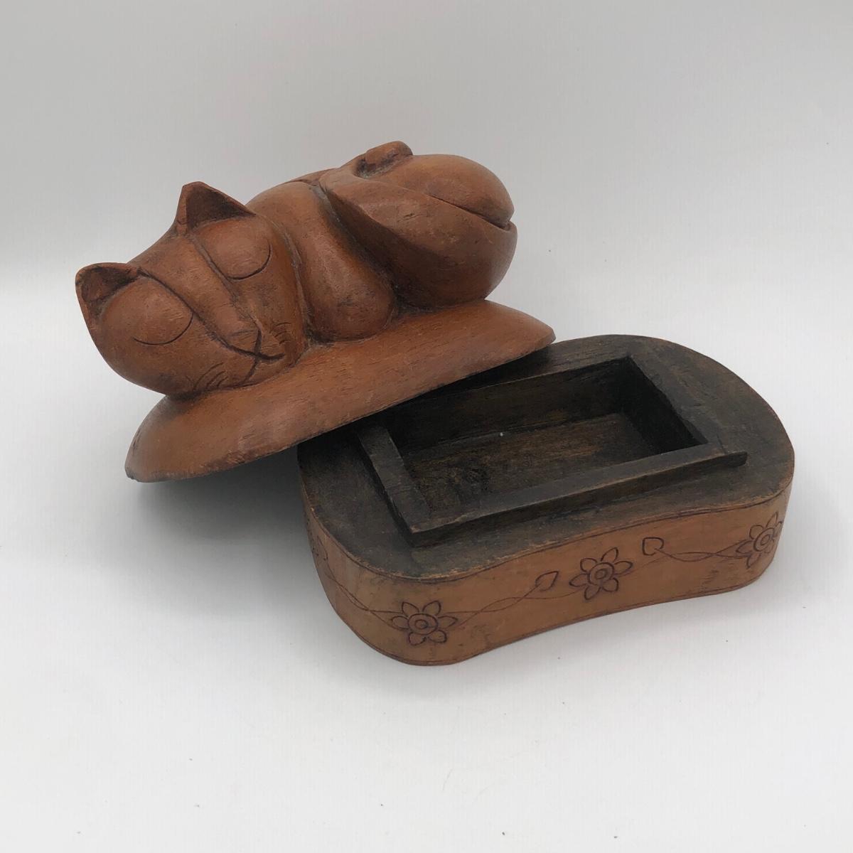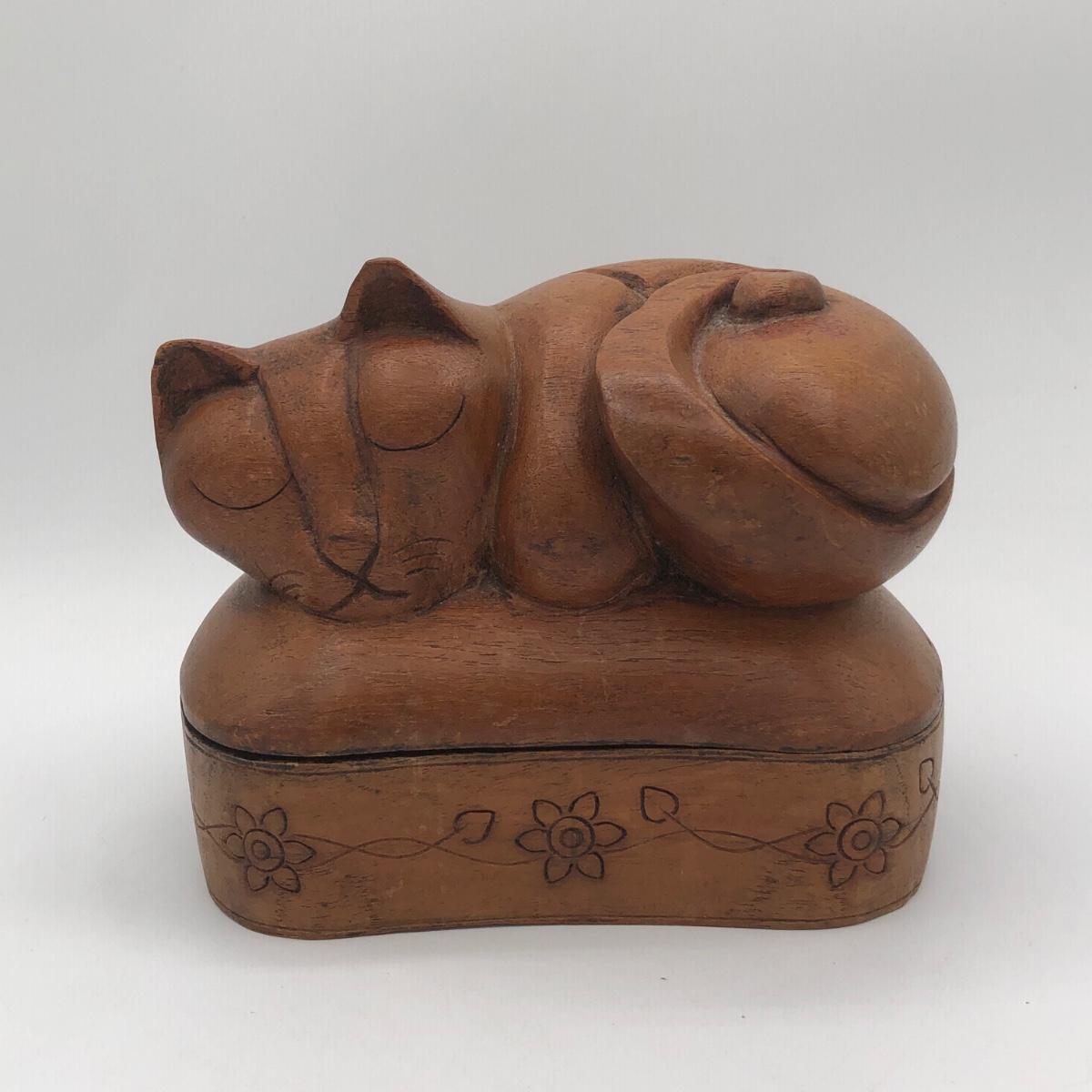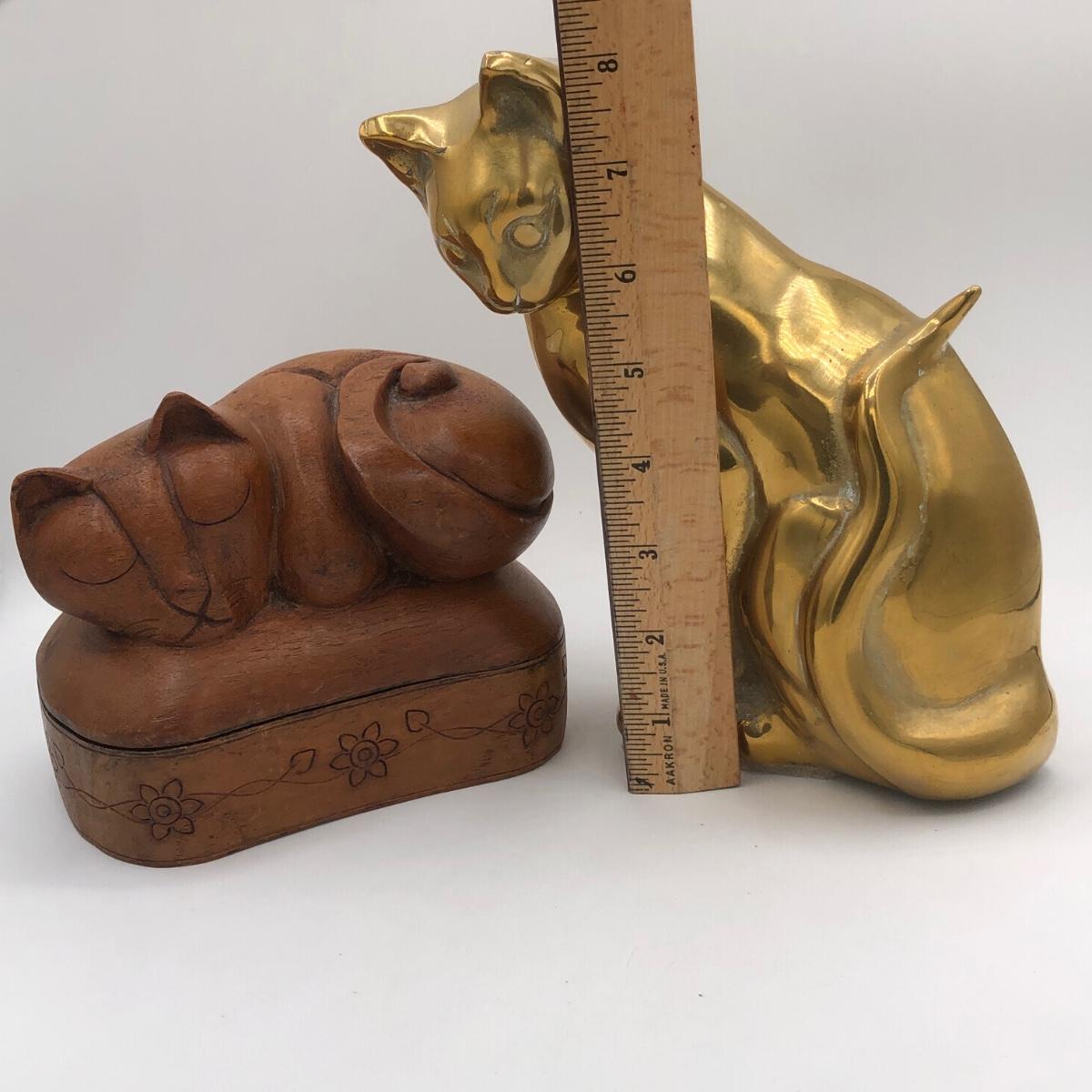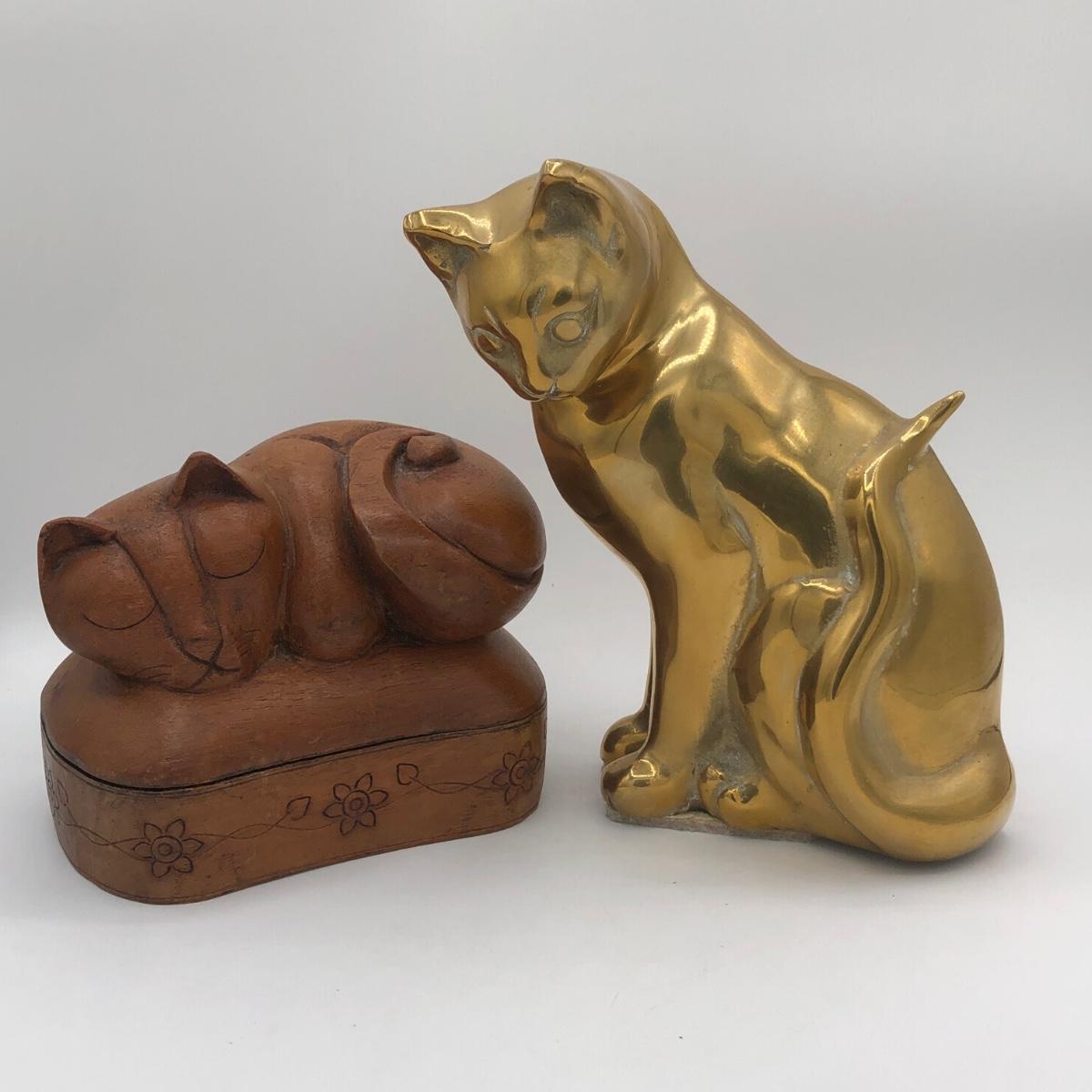 LOT 31L: Vintage Brass Cat Statue Door Stop & Sleeping Cat Wooden Trinket Box