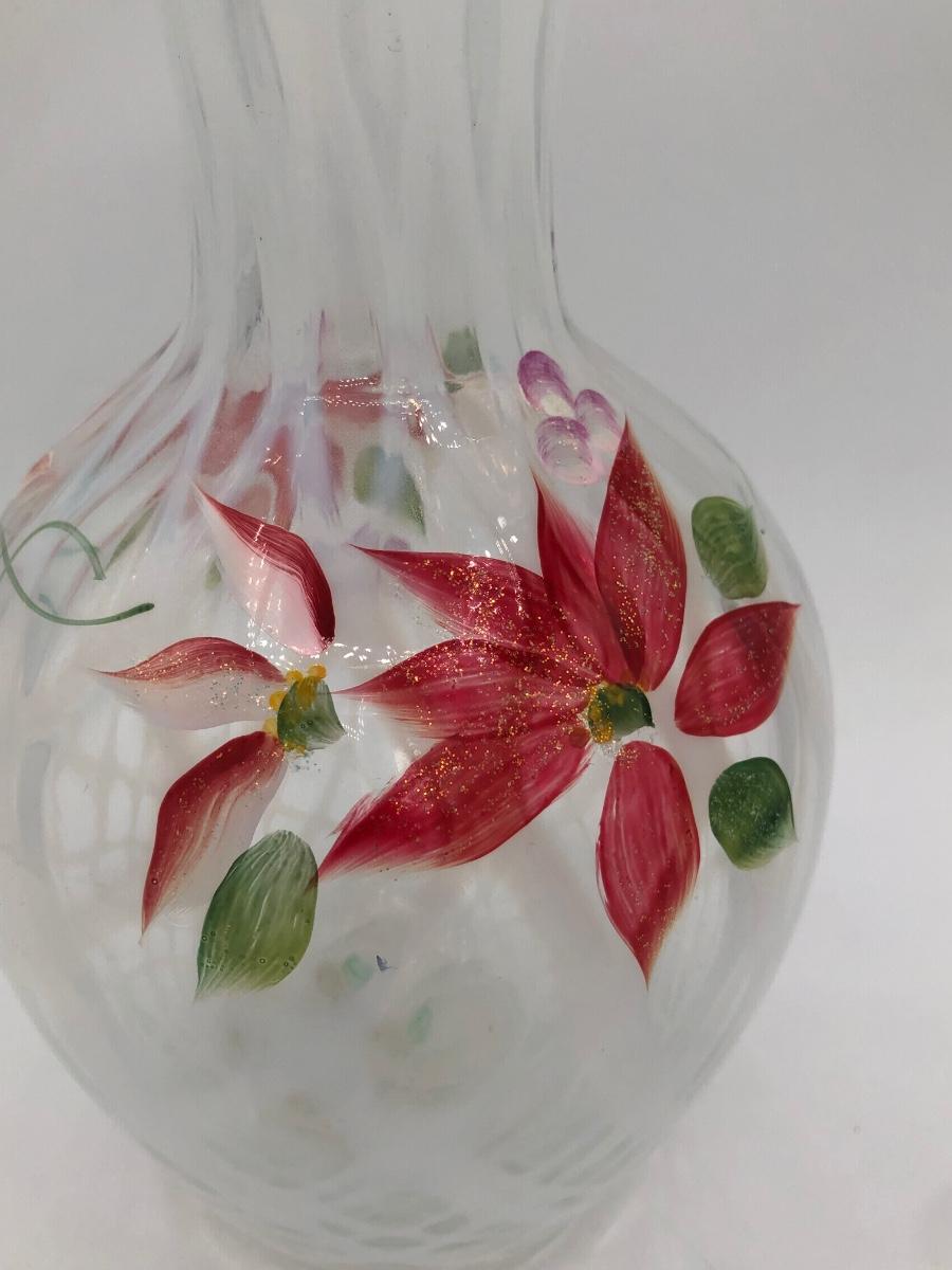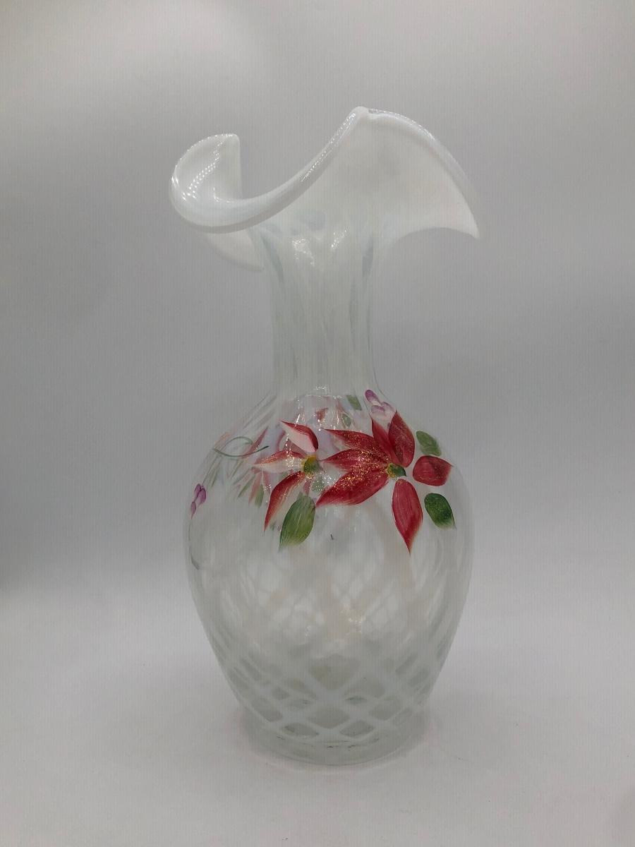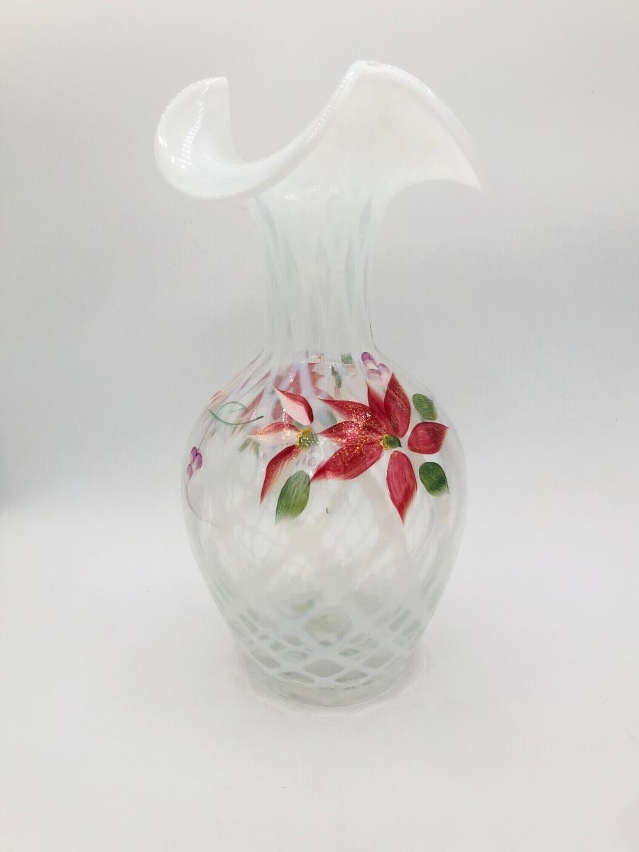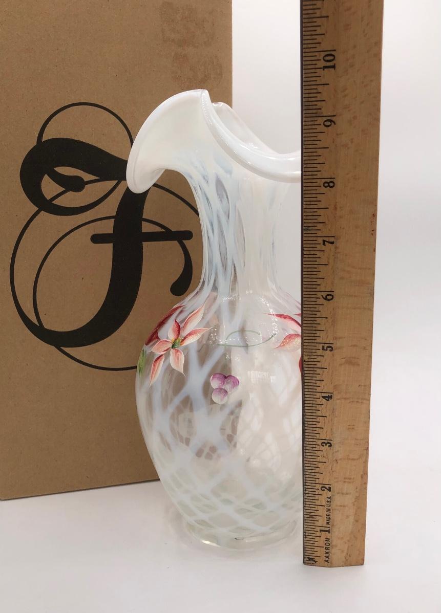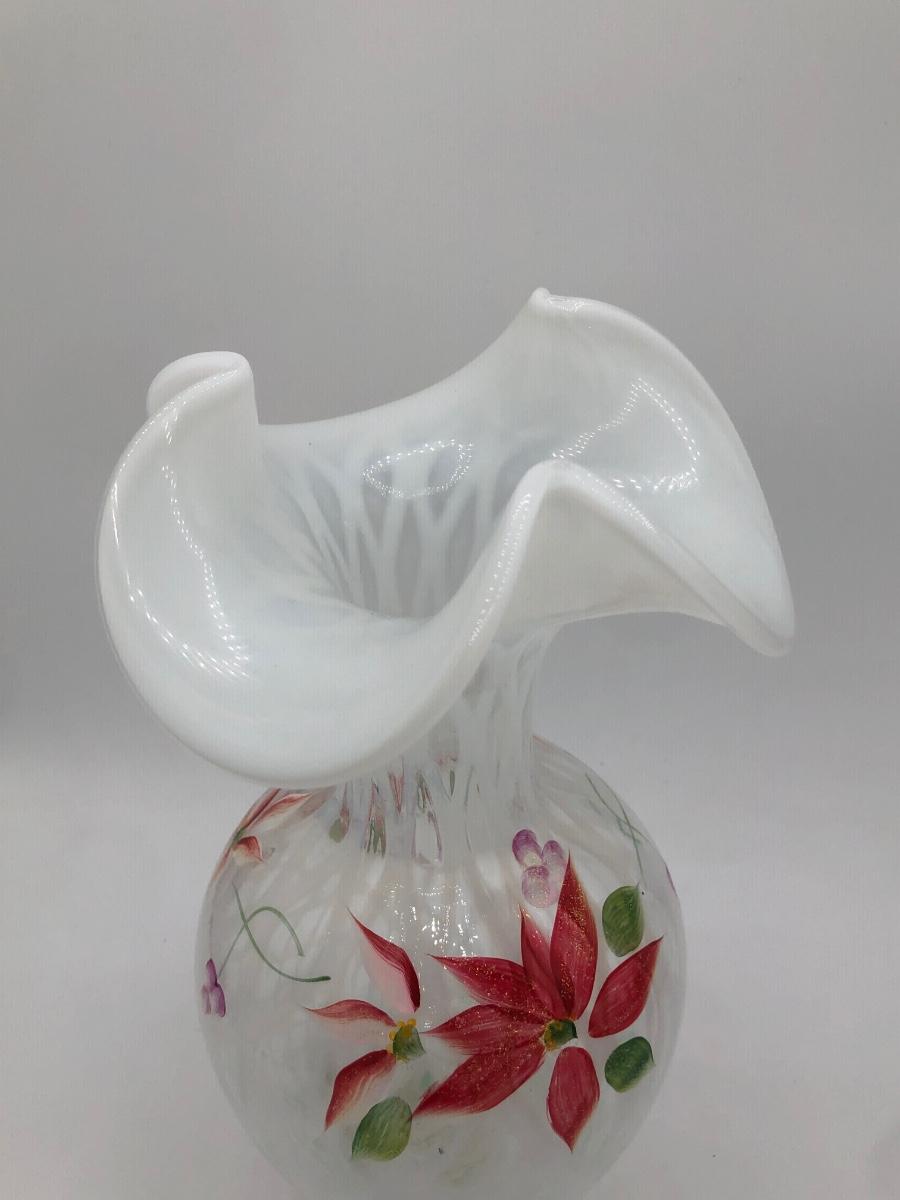 LOT 34L: Signed V Cline Fenton Hand Painted French Opalescent Poinsettia Vase w/ Original Box & Glass Pedestal Compote Dish