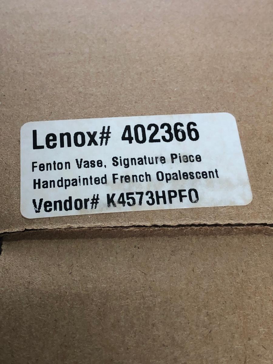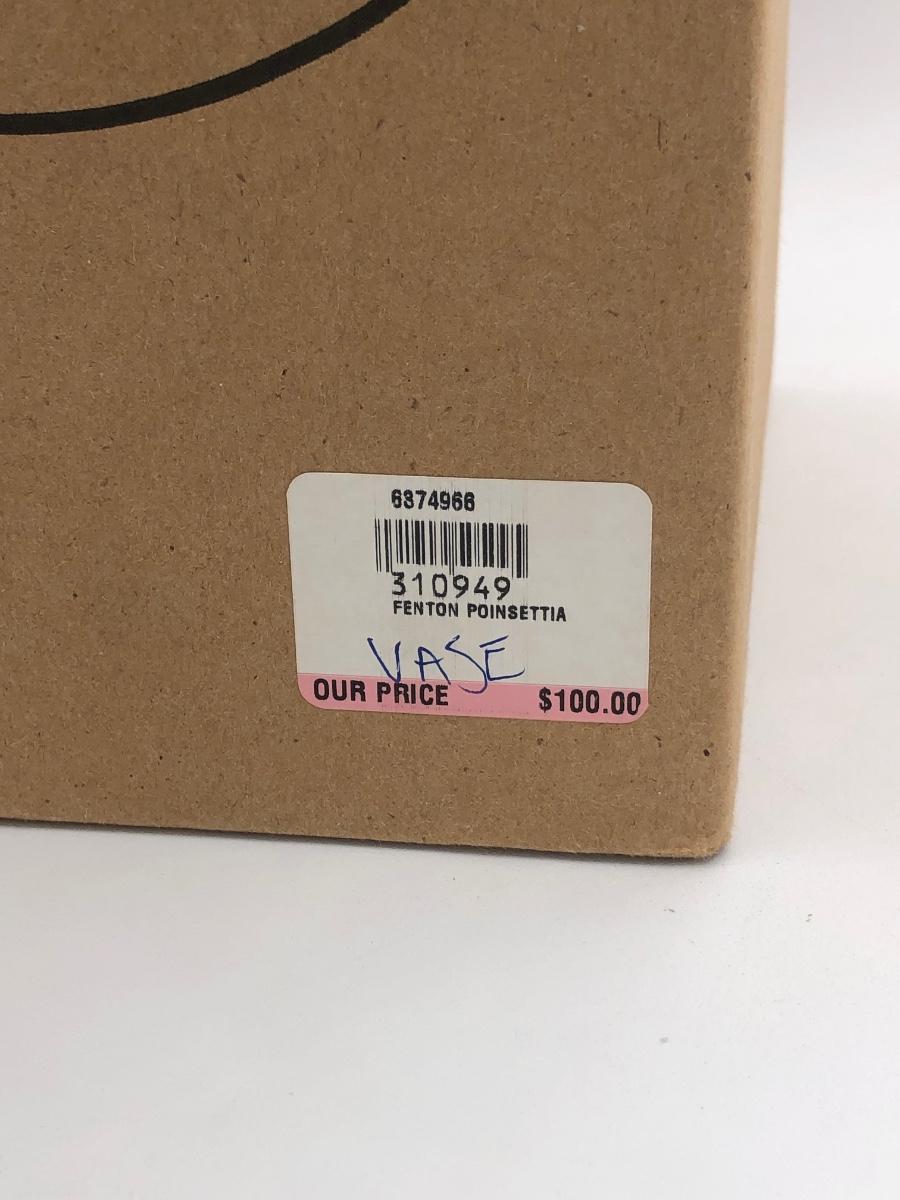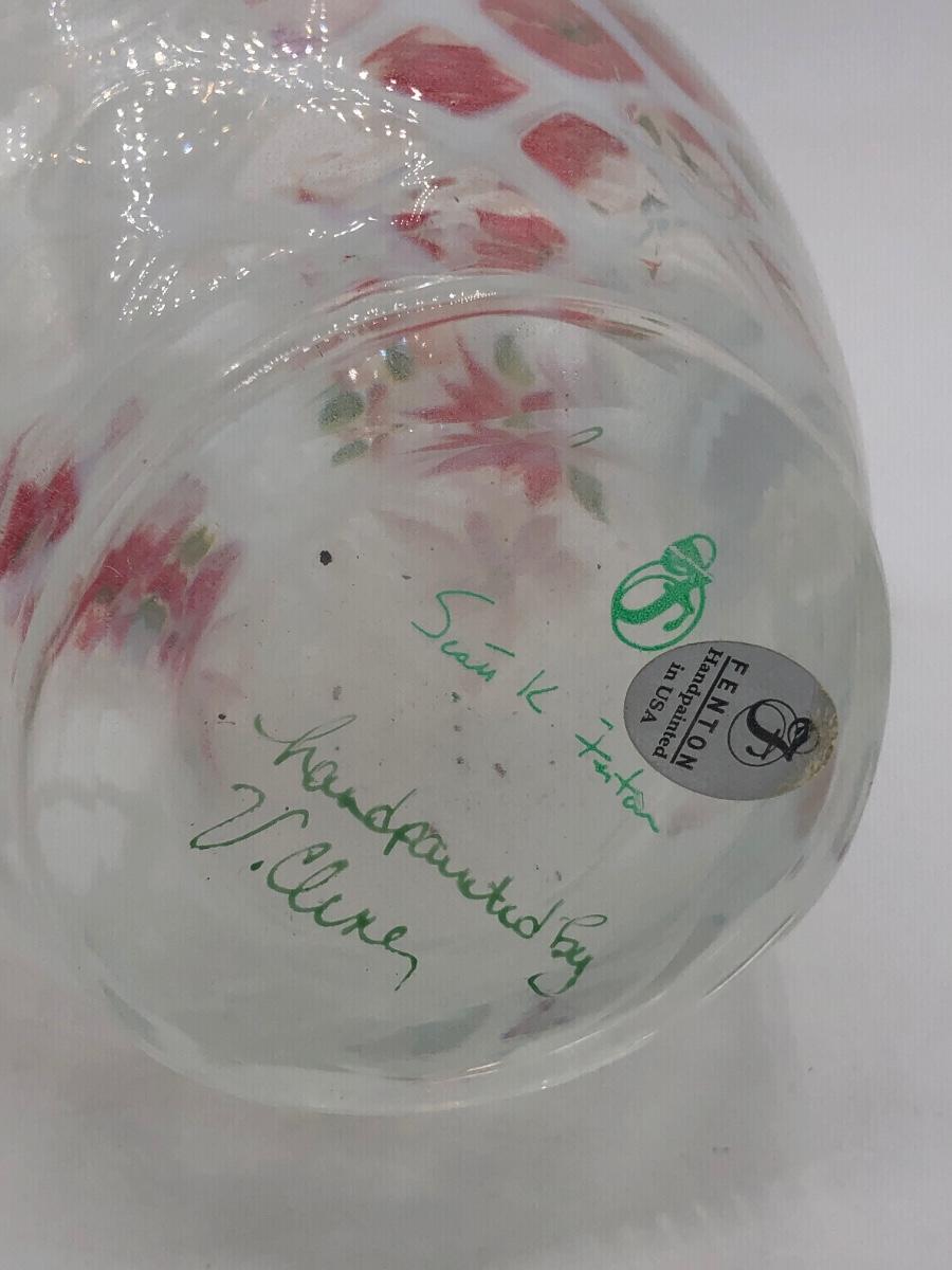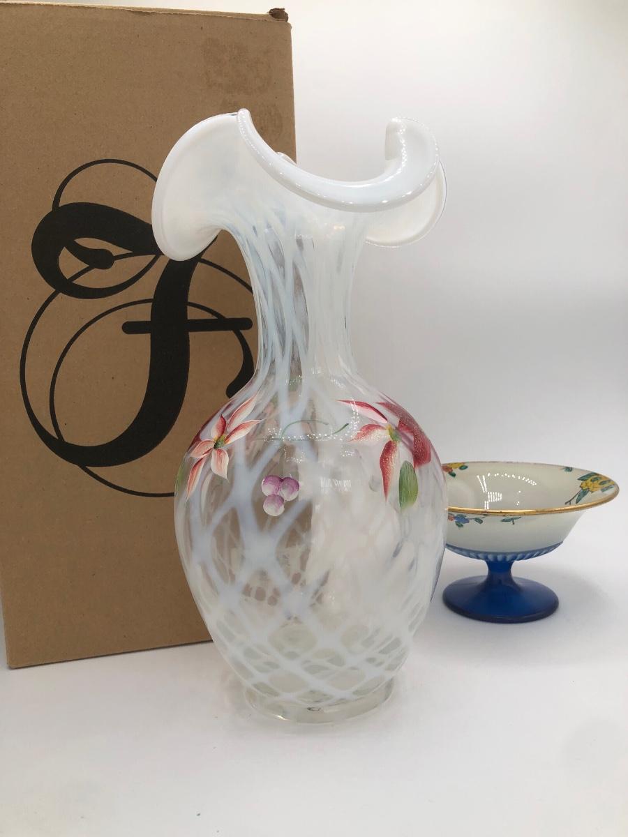 LOT 34L: Signed V Cline Fenton Hand Painted French Opalescent Poinsettia Vase w/ Original Box & Glass Pedestal Compote Dish