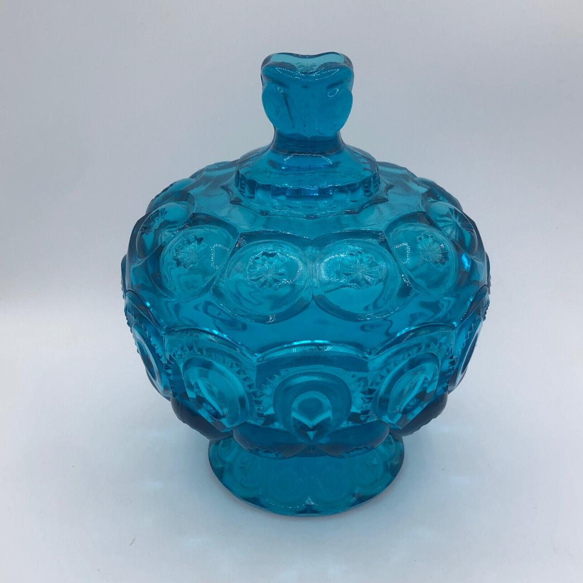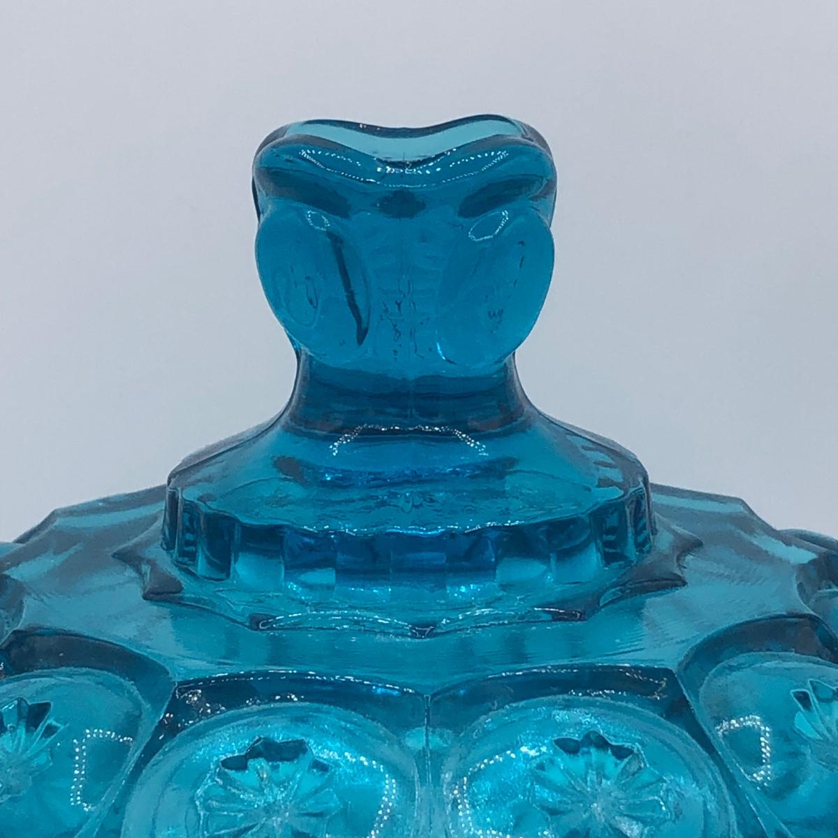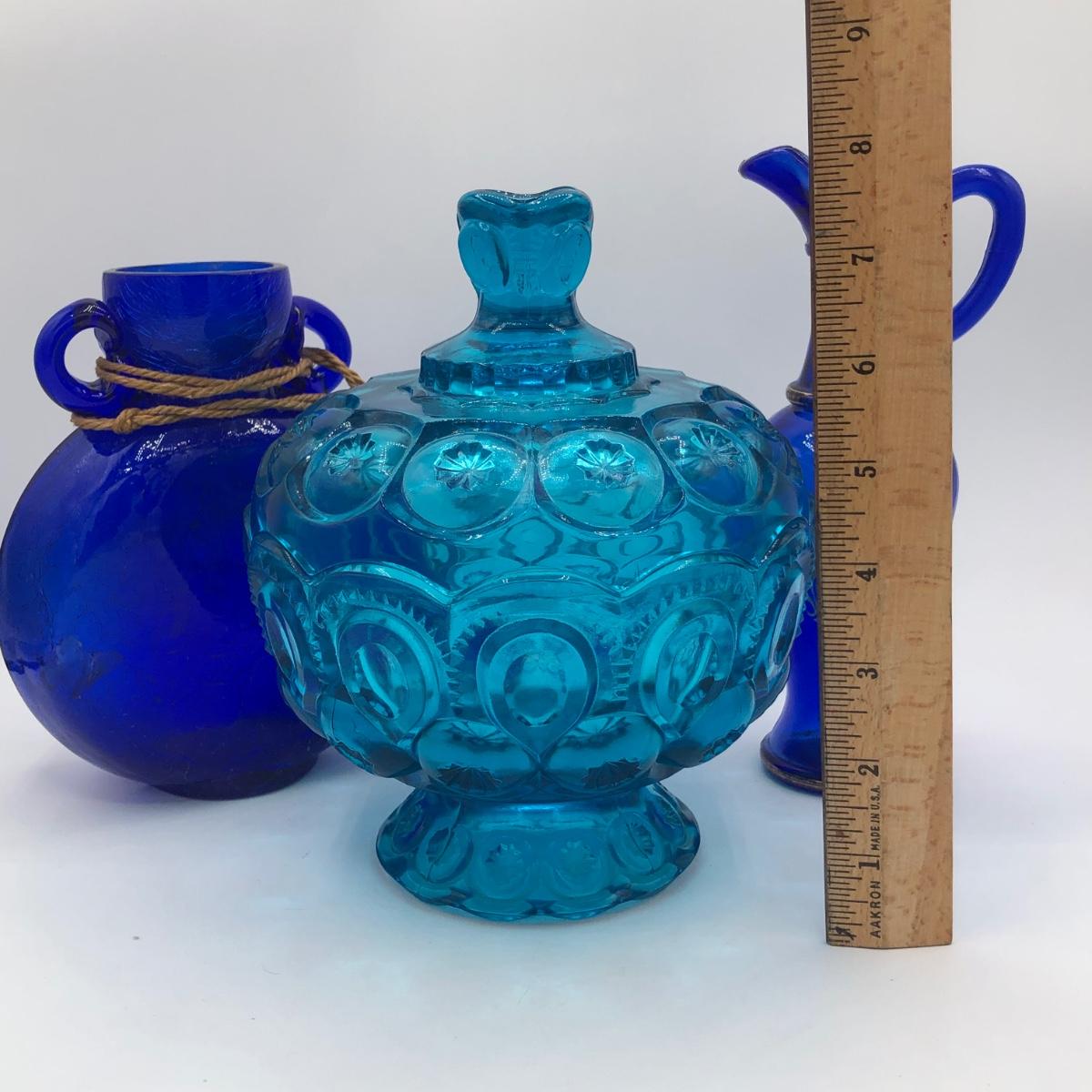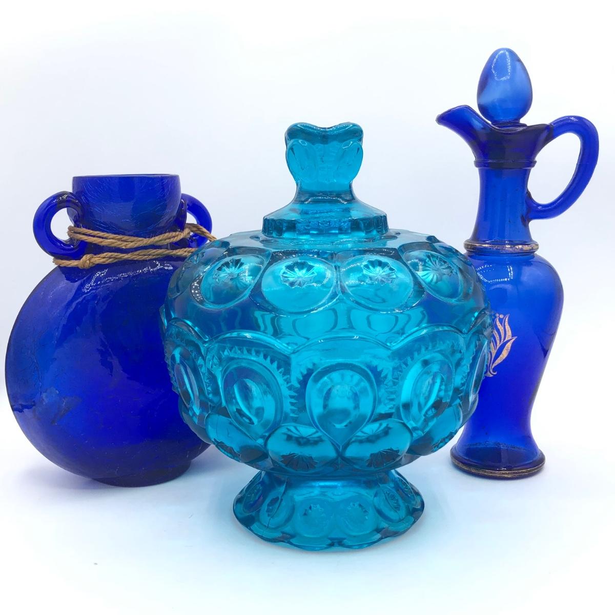 LOT 36L: Vintage L E Smith Blue Moon & Stars Candy Dish & Cobalt Blue Glass Bottles