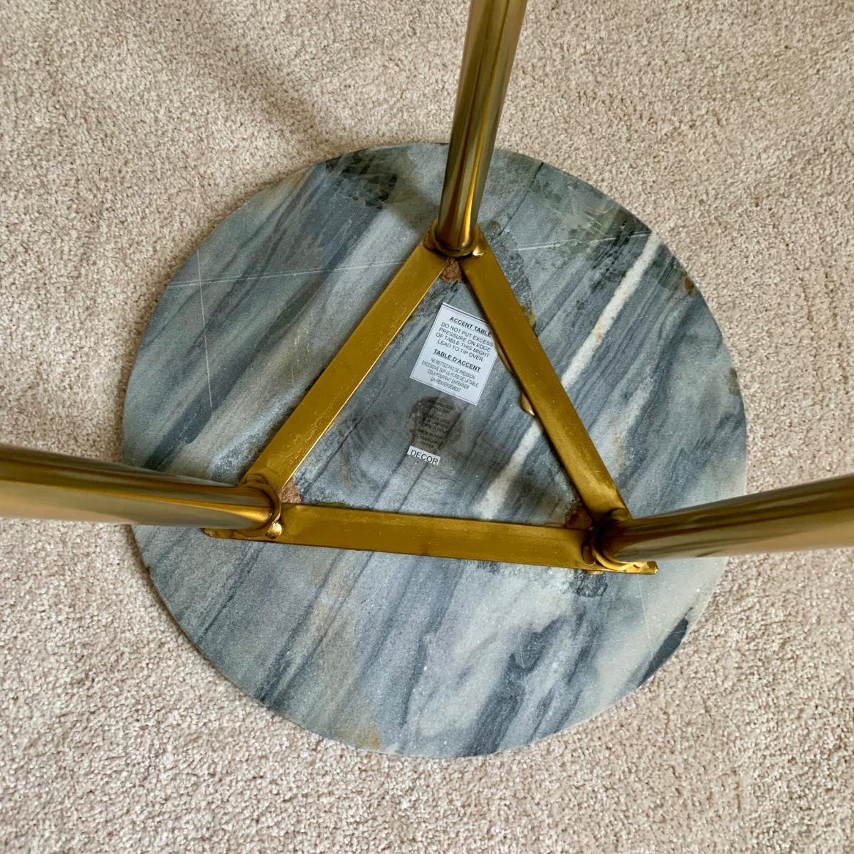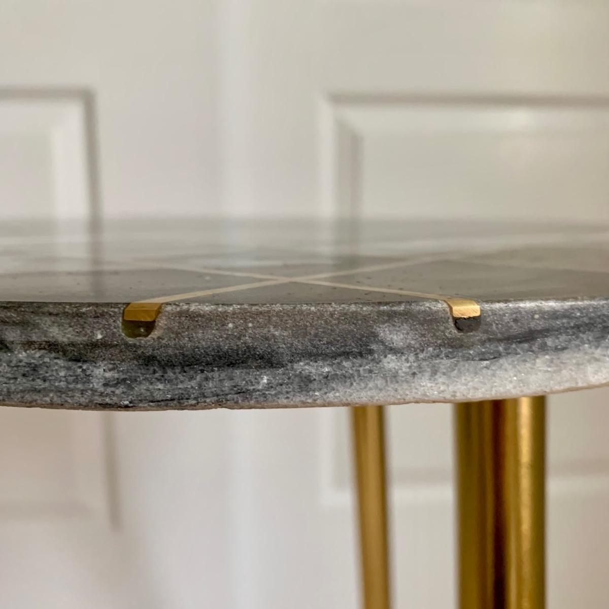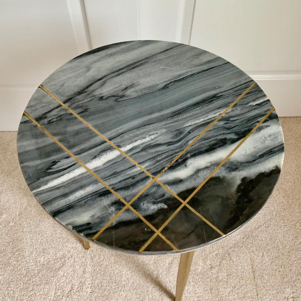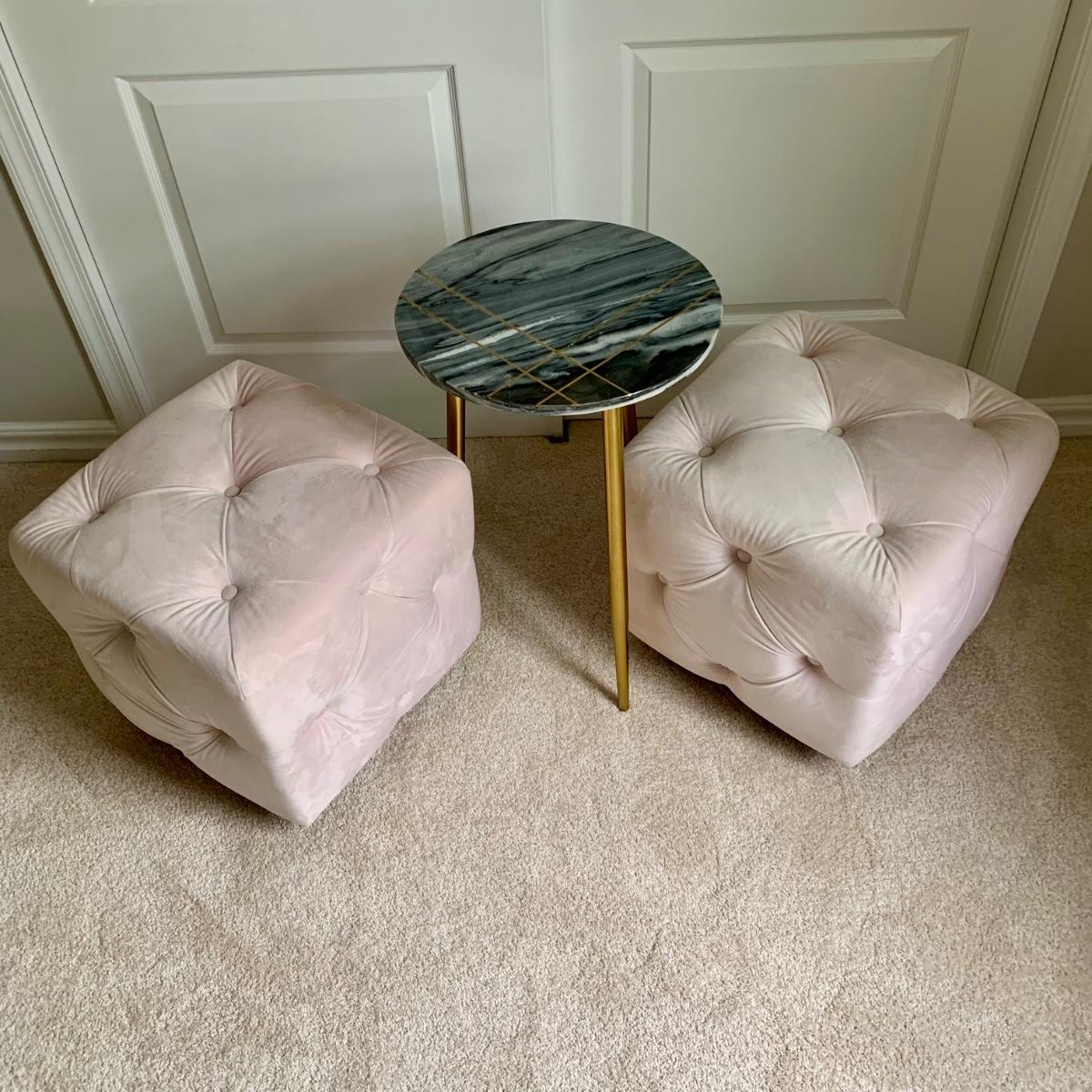 LOT 58 B: Marble / Stoneware Round Accent Table w/ Gold Metal Inlay Pattern & Legs & 2 Pink Tufted Cube Ottomans / Poufs