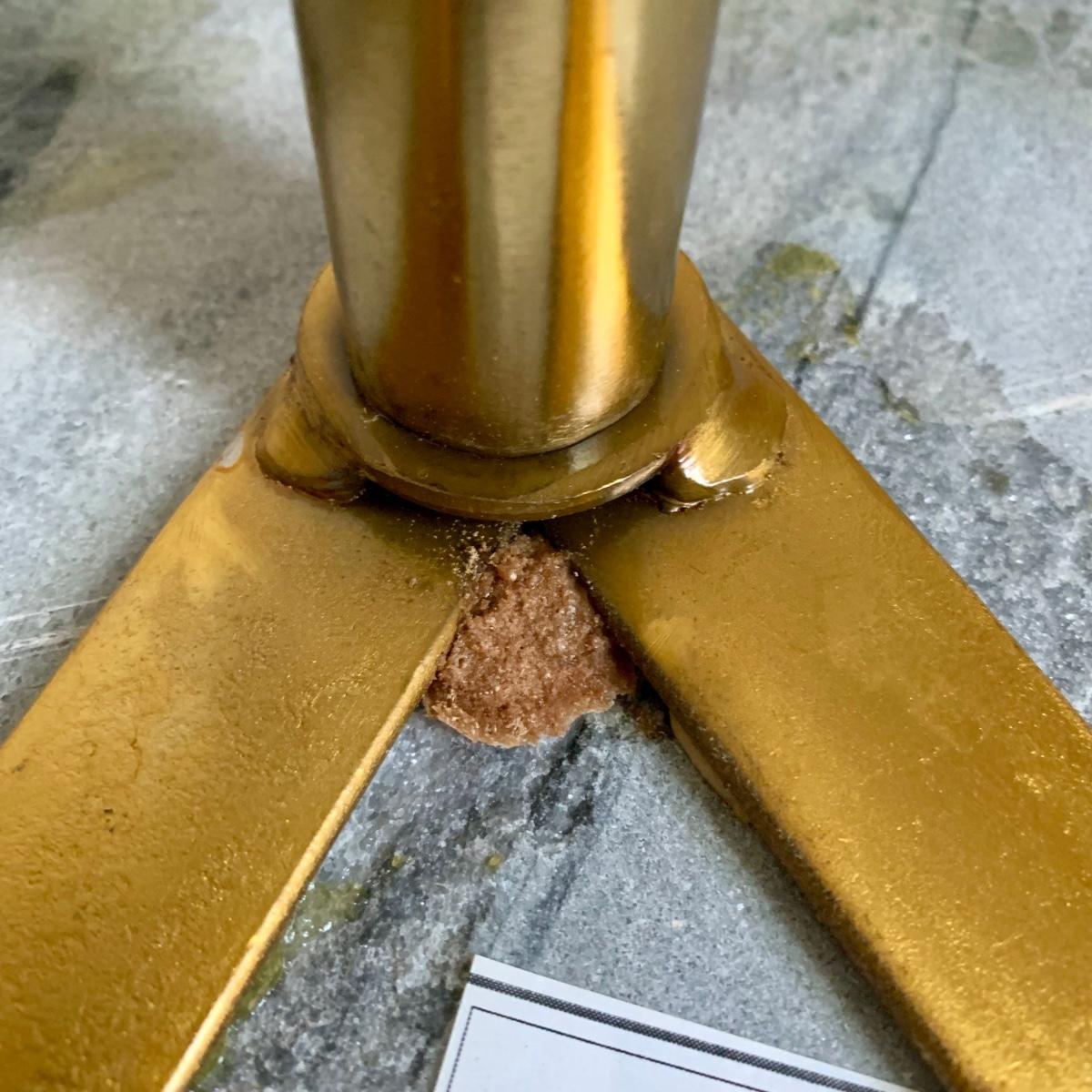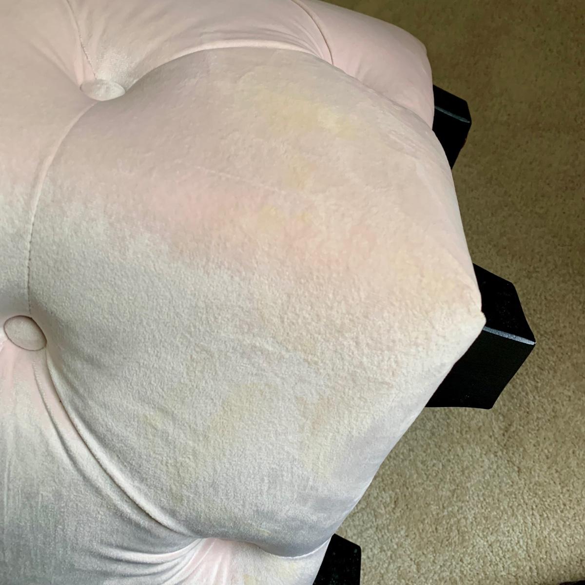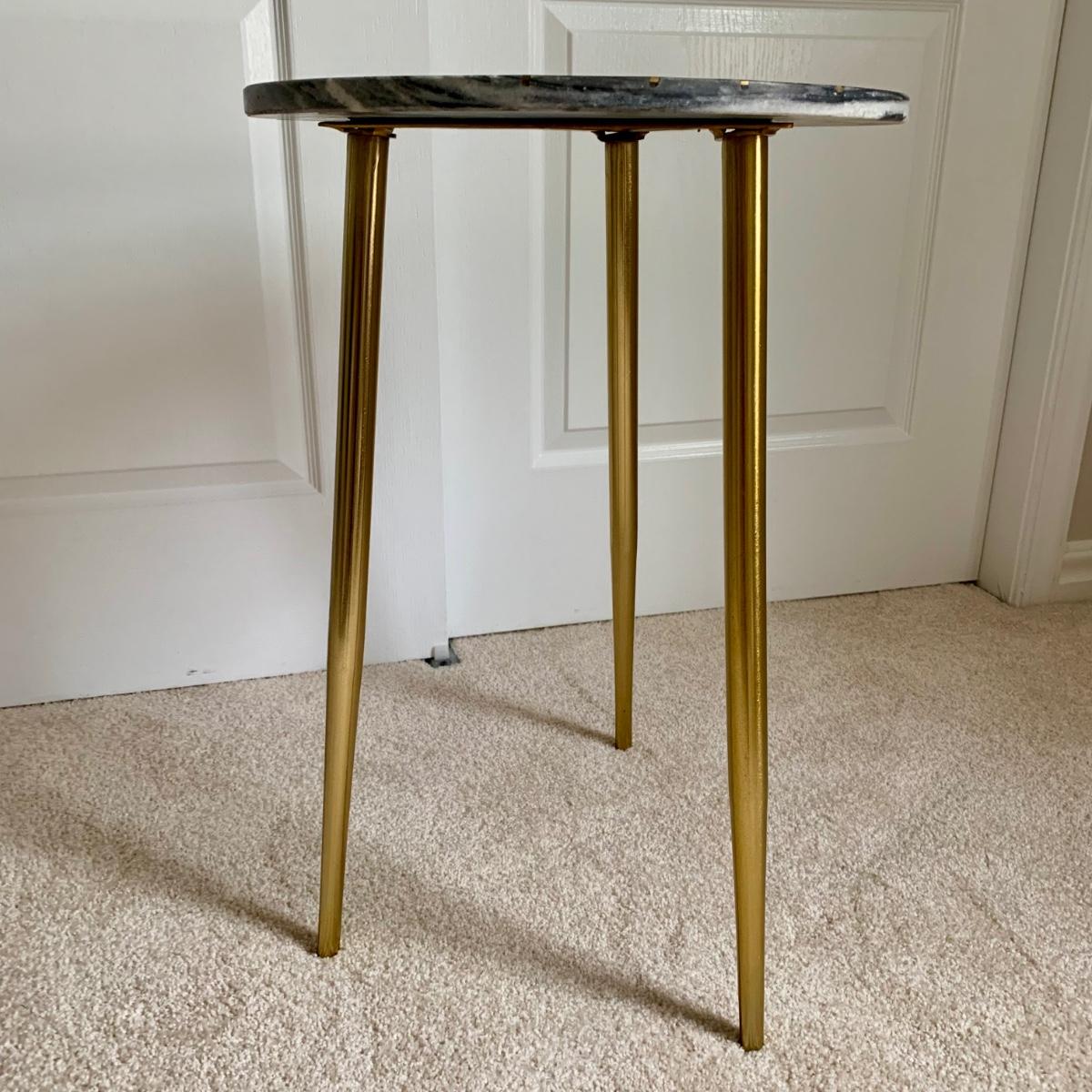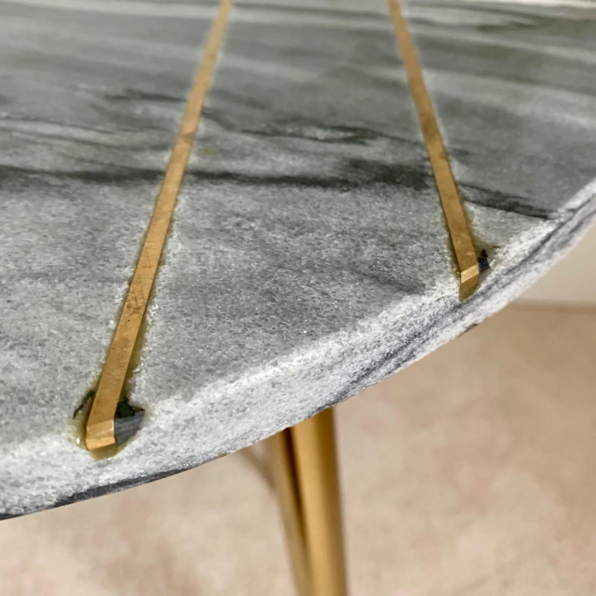 LOT 58 B: Marble / Stoneware Round Accent Table w/ Gold Metal Inlay Pattern & Legs & 2 Pink Tufted Cube Ottomans / Poufs