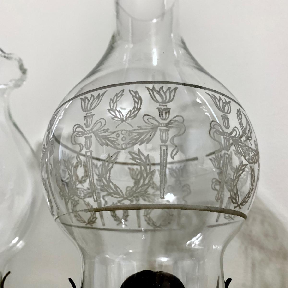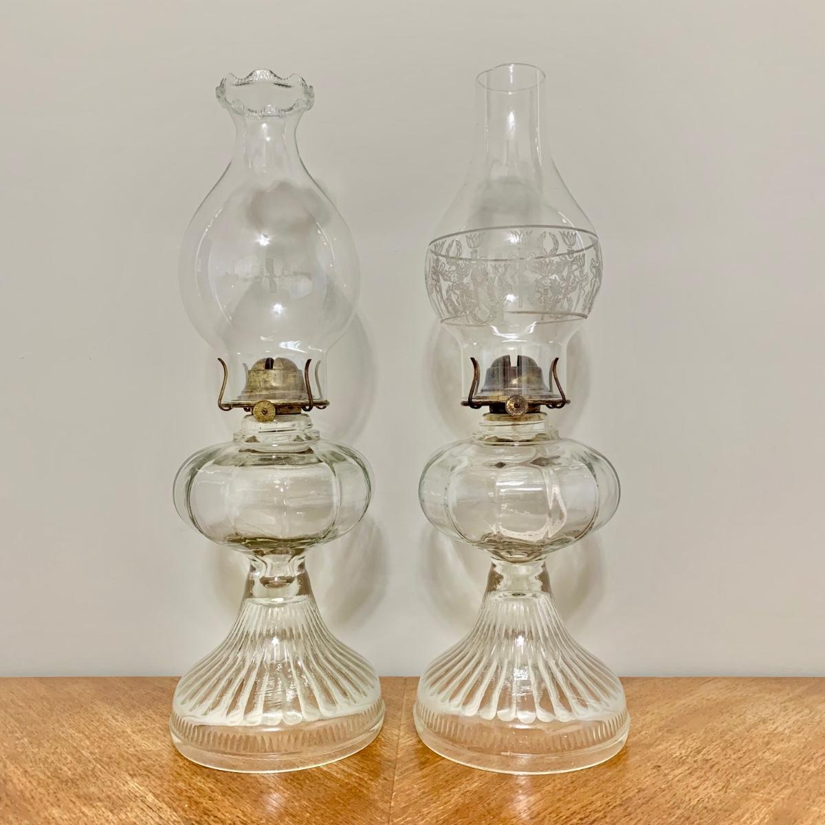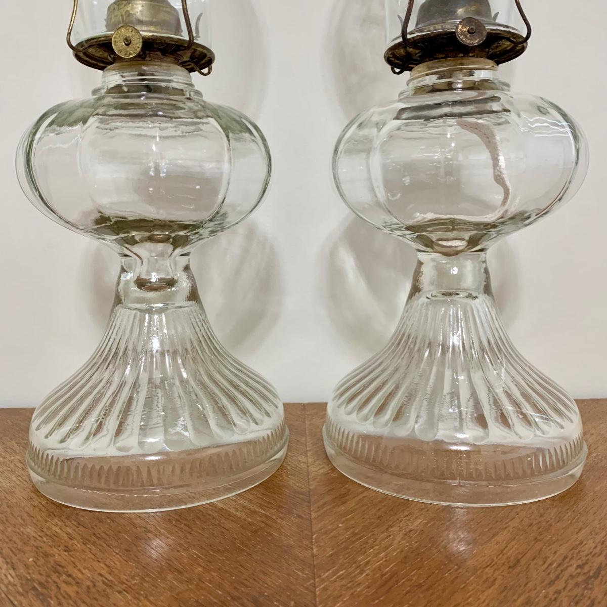 LOT 62 M: Vintage P&A Risdon Eagle Burner Oil Lamps Etched Glass Chimney & Ripple Top Chimney w/ Ribbed Glass Pedestals