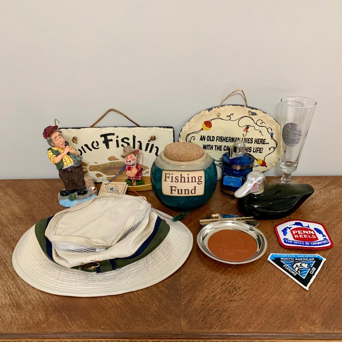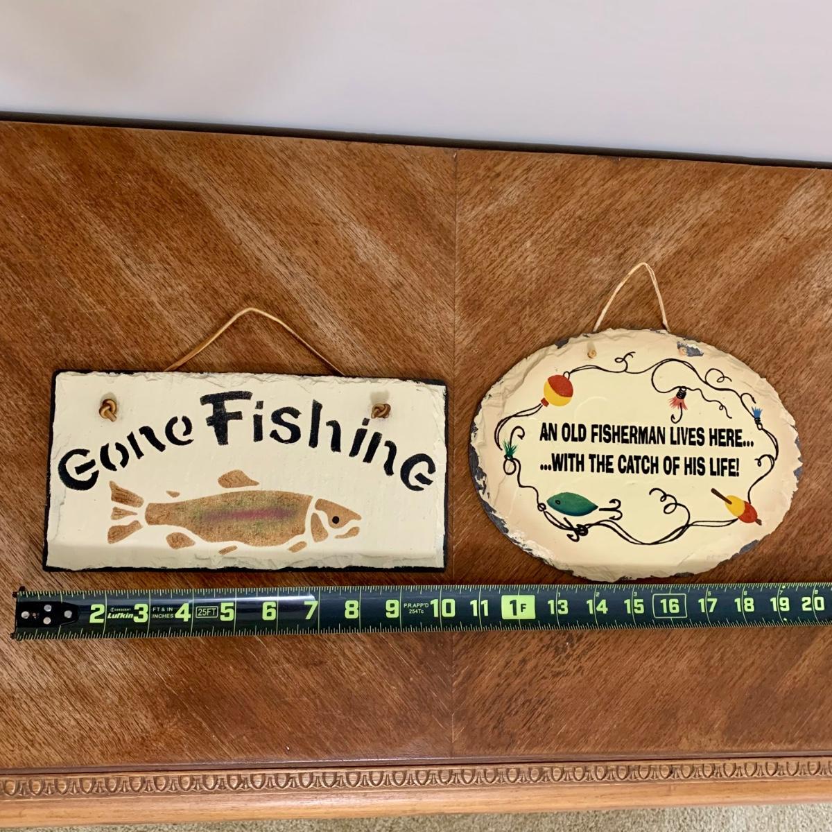 LOT 64 M: Gone Fishing Collection: Slate Signs, Avon Mallard Duck Cologne & The Angler Windjammer After Shave Bottles, & More