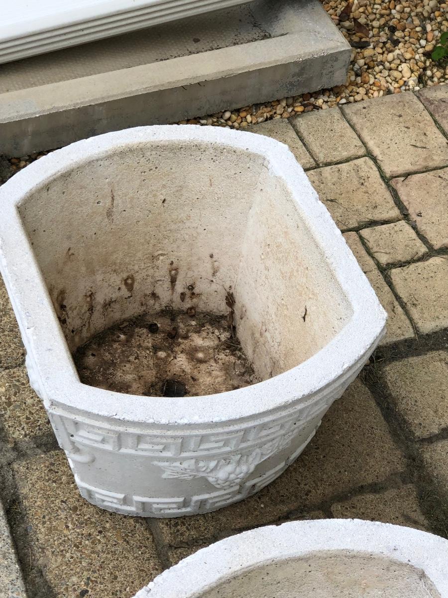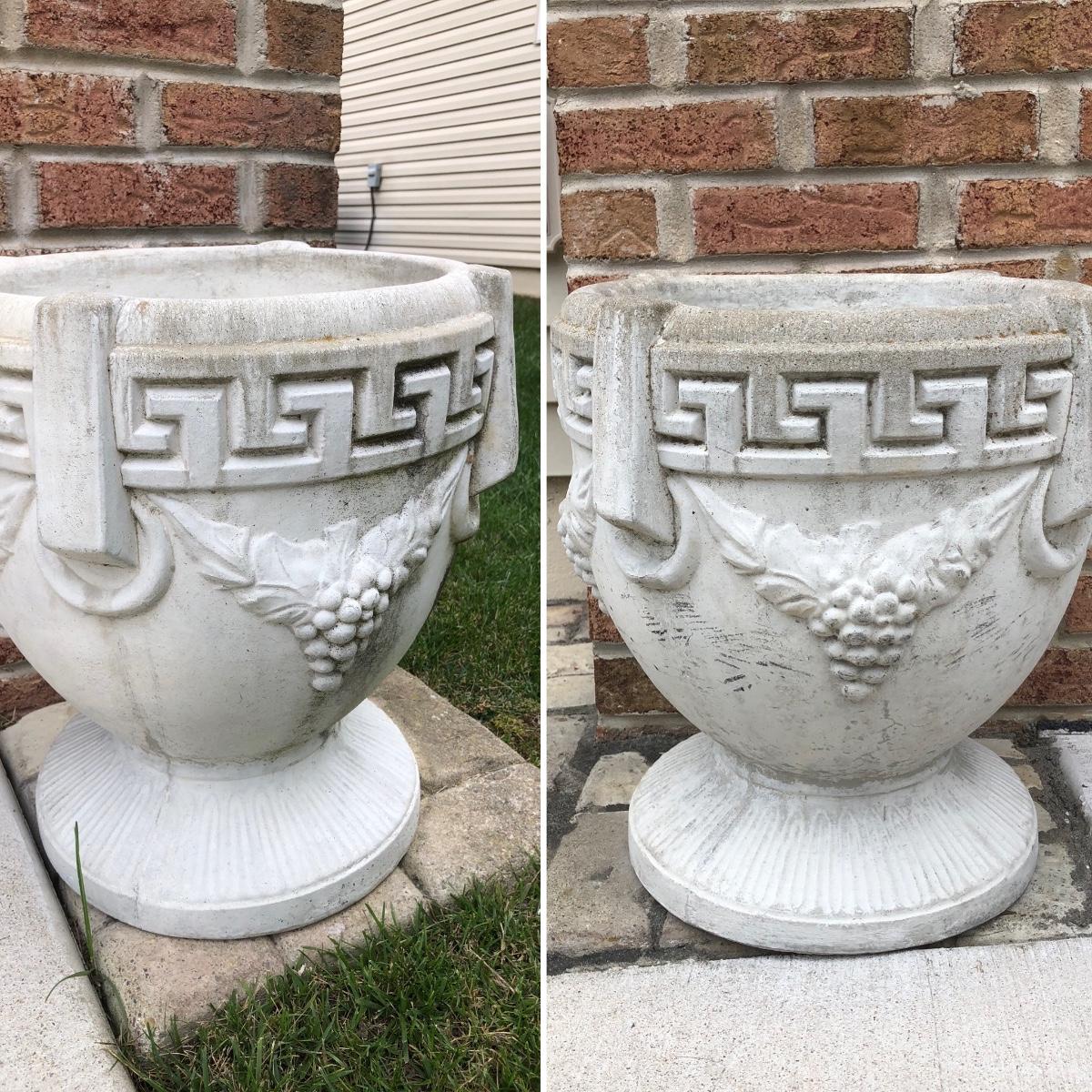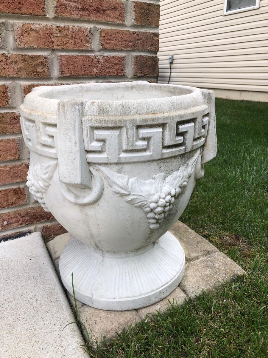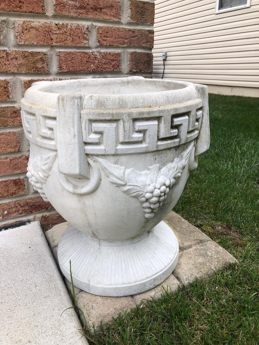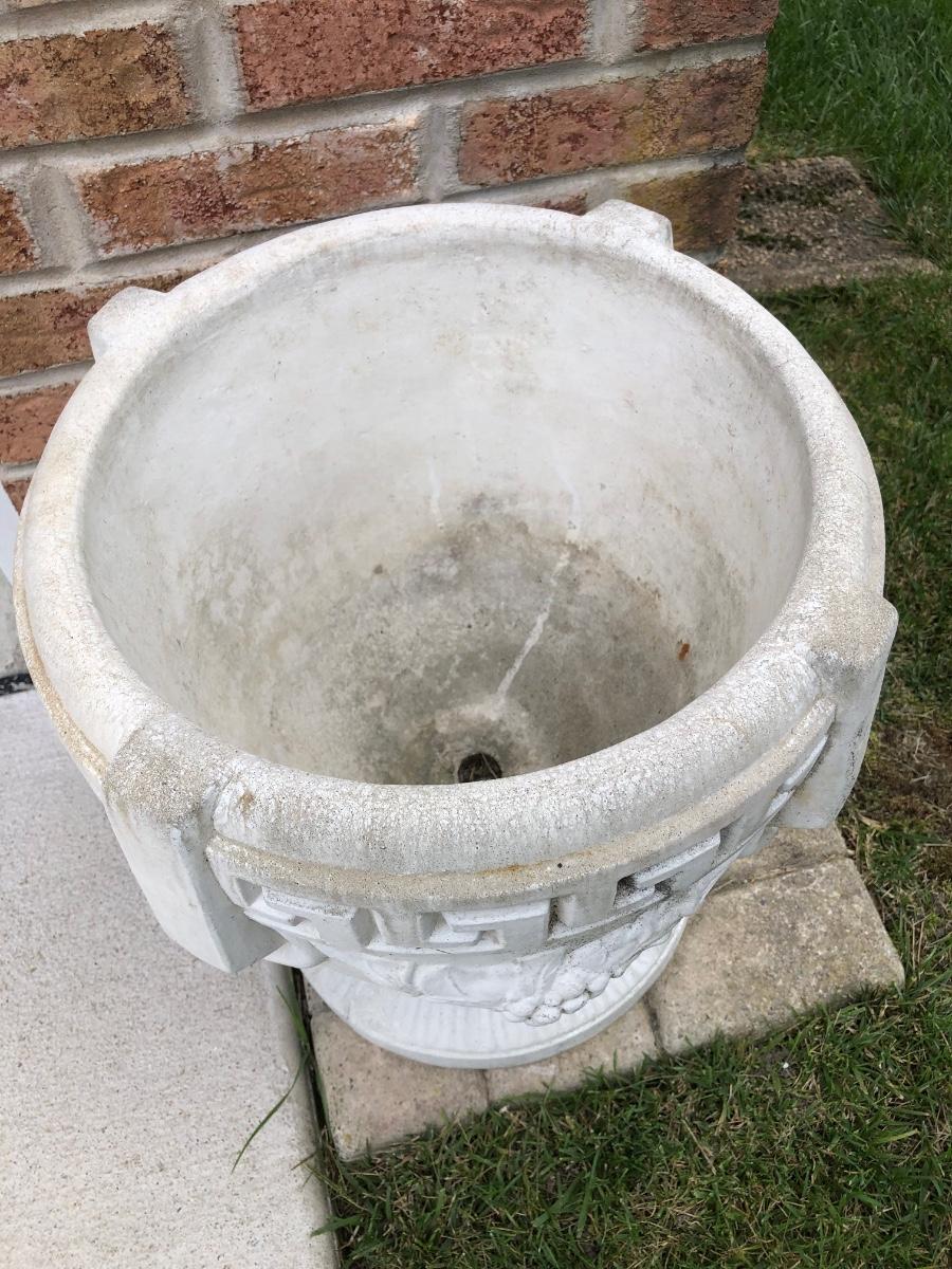 LOT 108P: Pair of Concrete Pedestal Planters w/ Grapes & Greek Key Design
