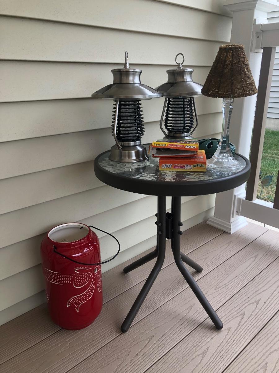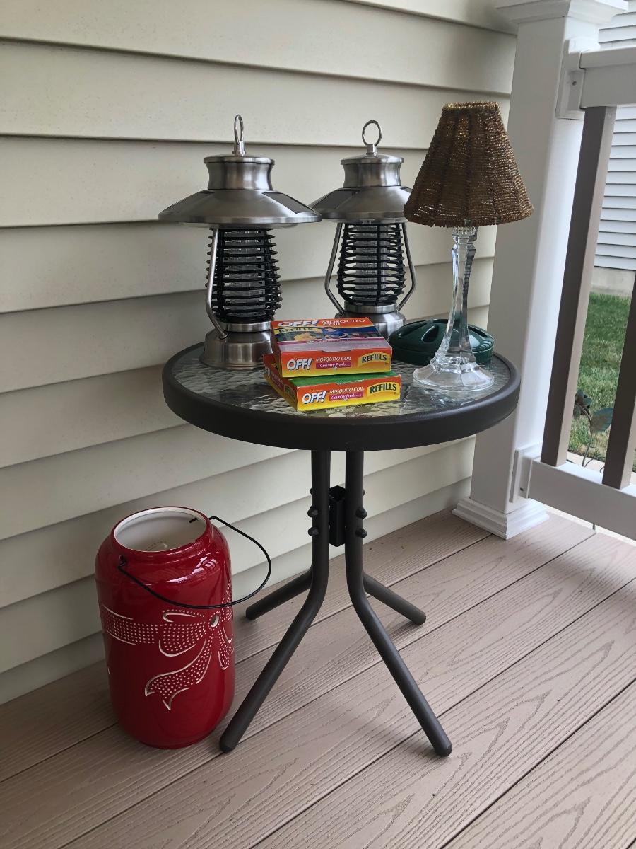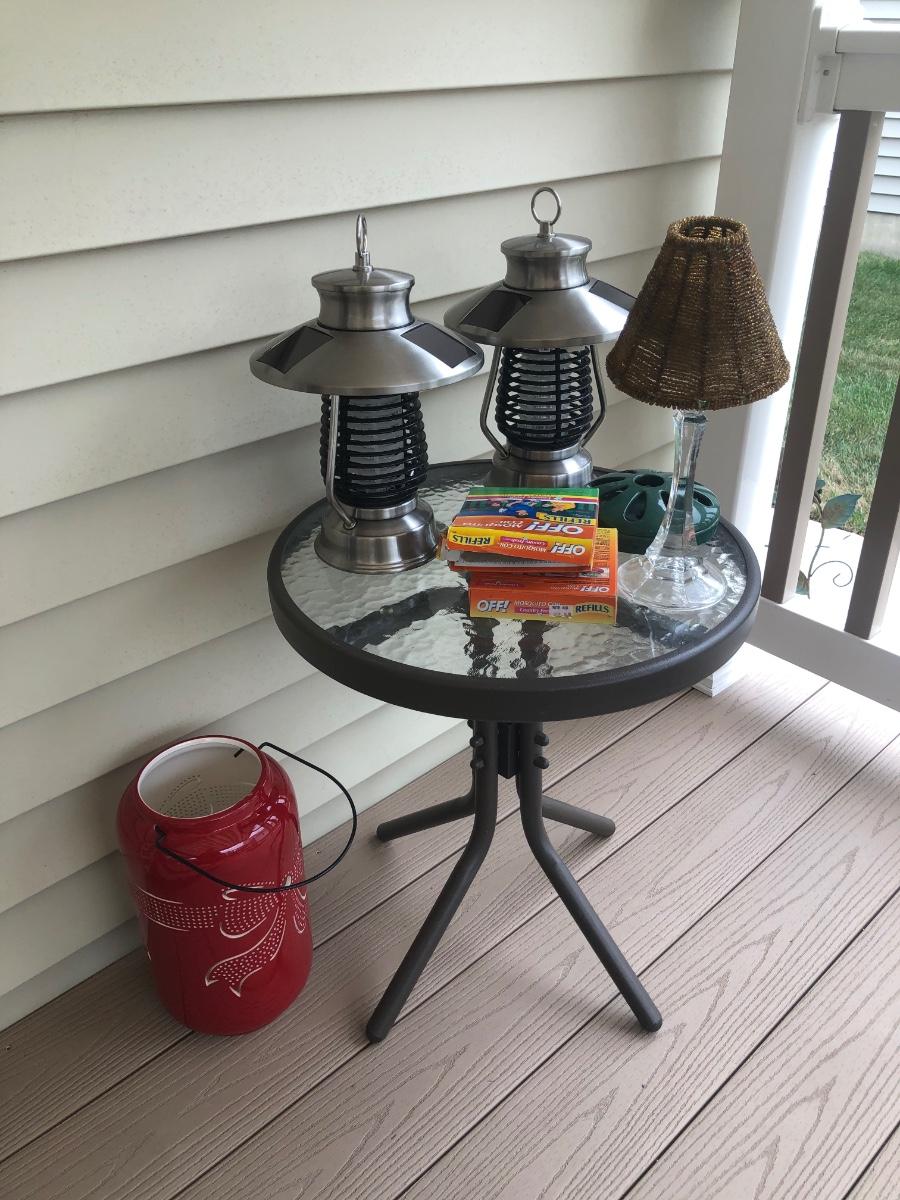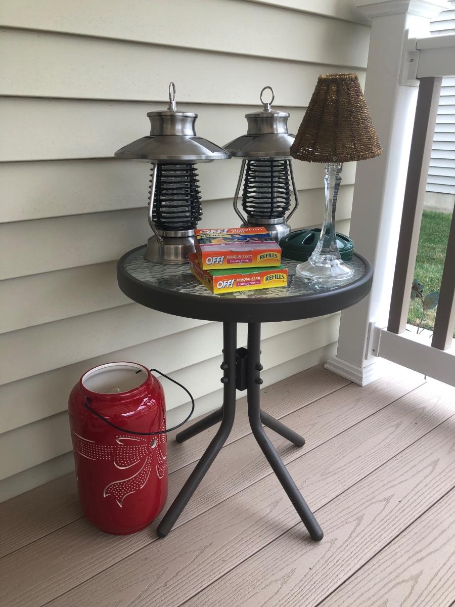 LOT 110P: Patio Essentials - Glass Top Table, Bug Zapper Lanterns, OFF! Mosquito Coil & Refills
