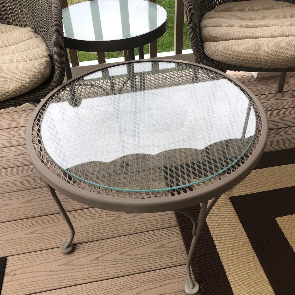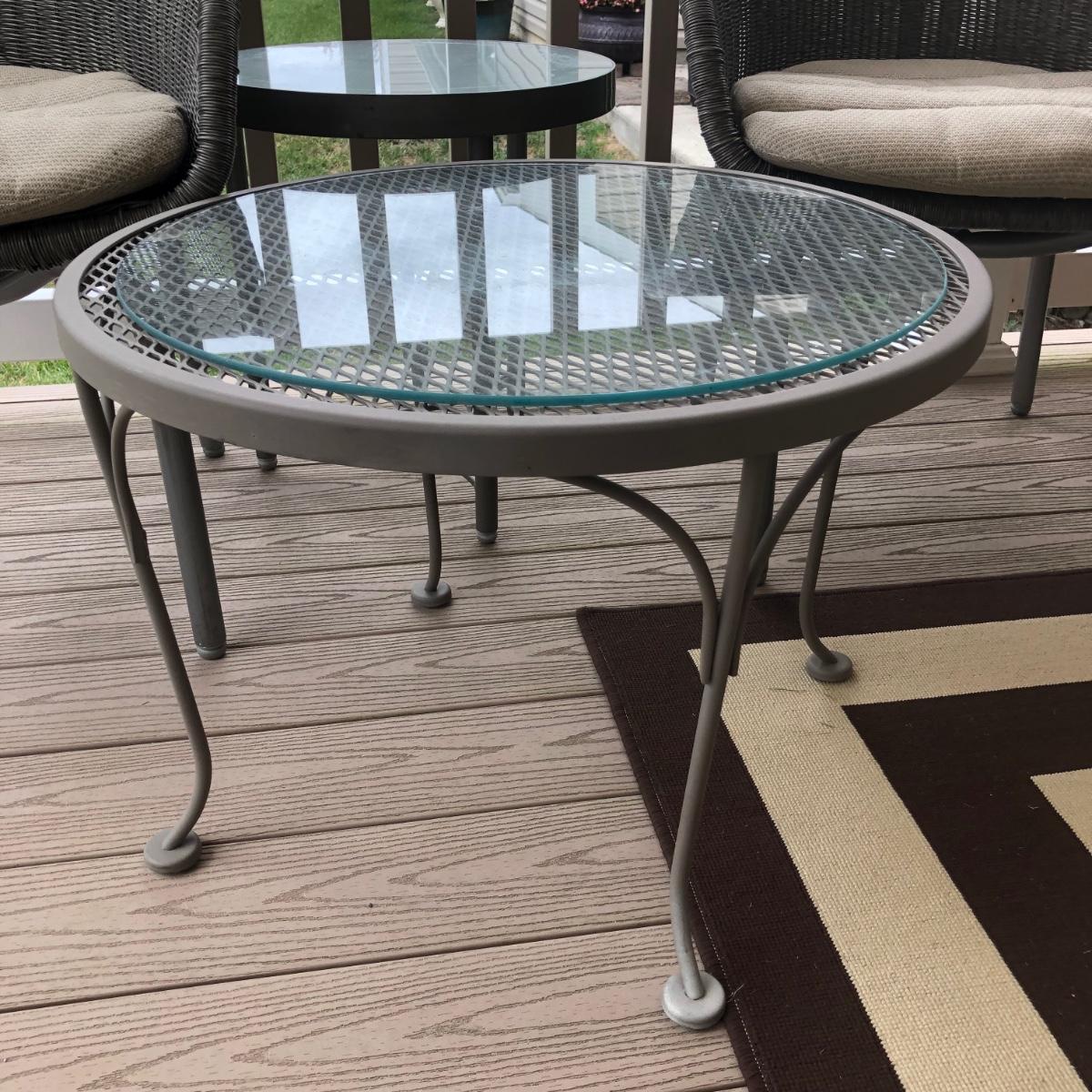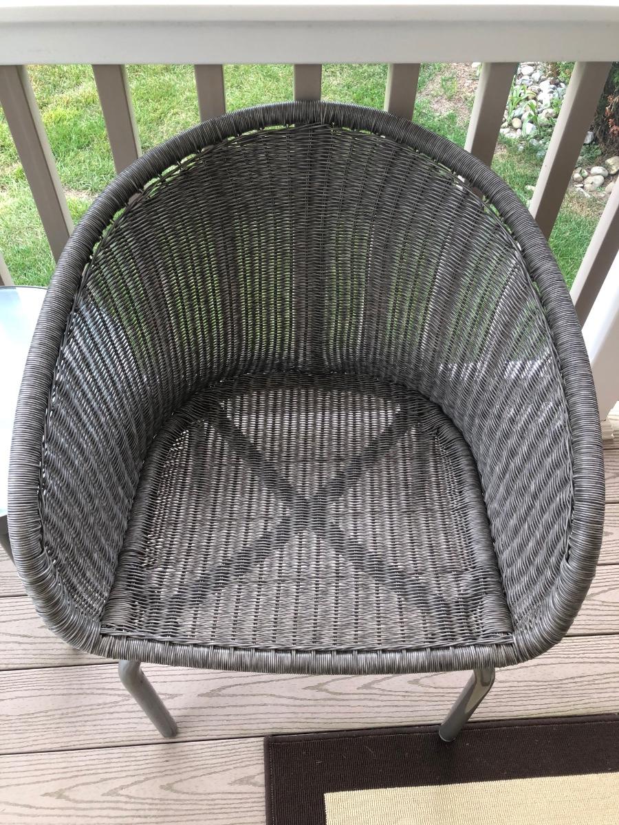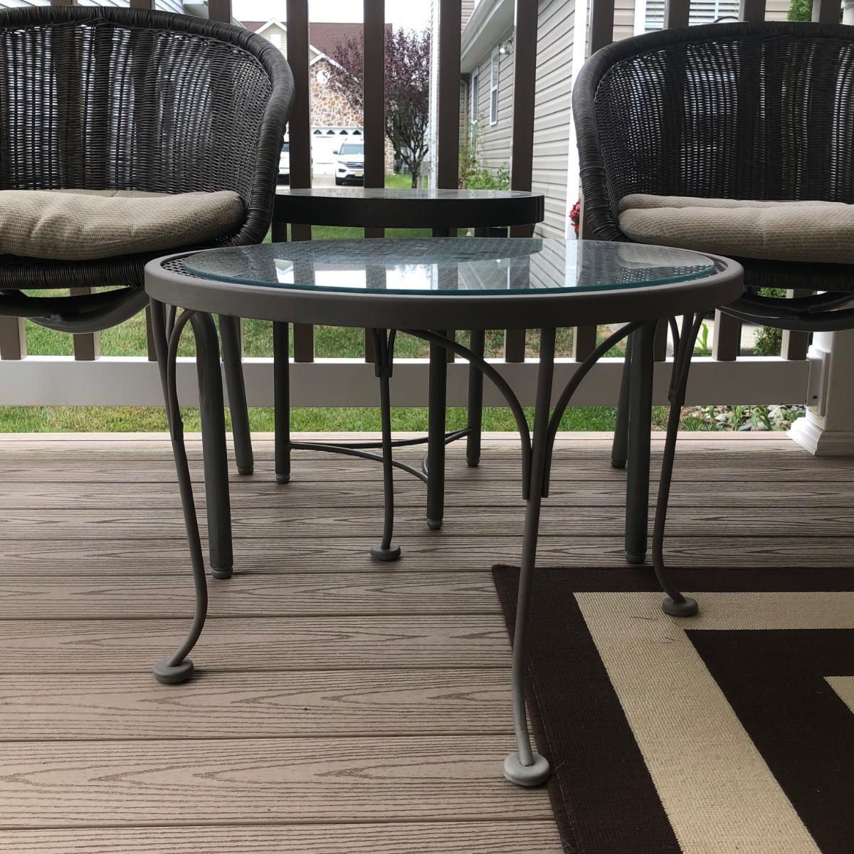 LOT 111P: Two Grey Wicker Patio Chairs w/ Two Patio Tables