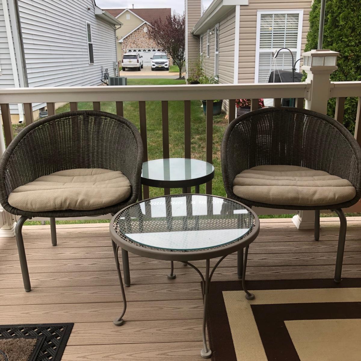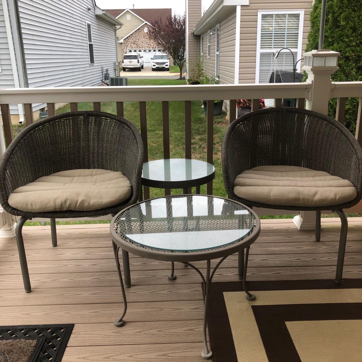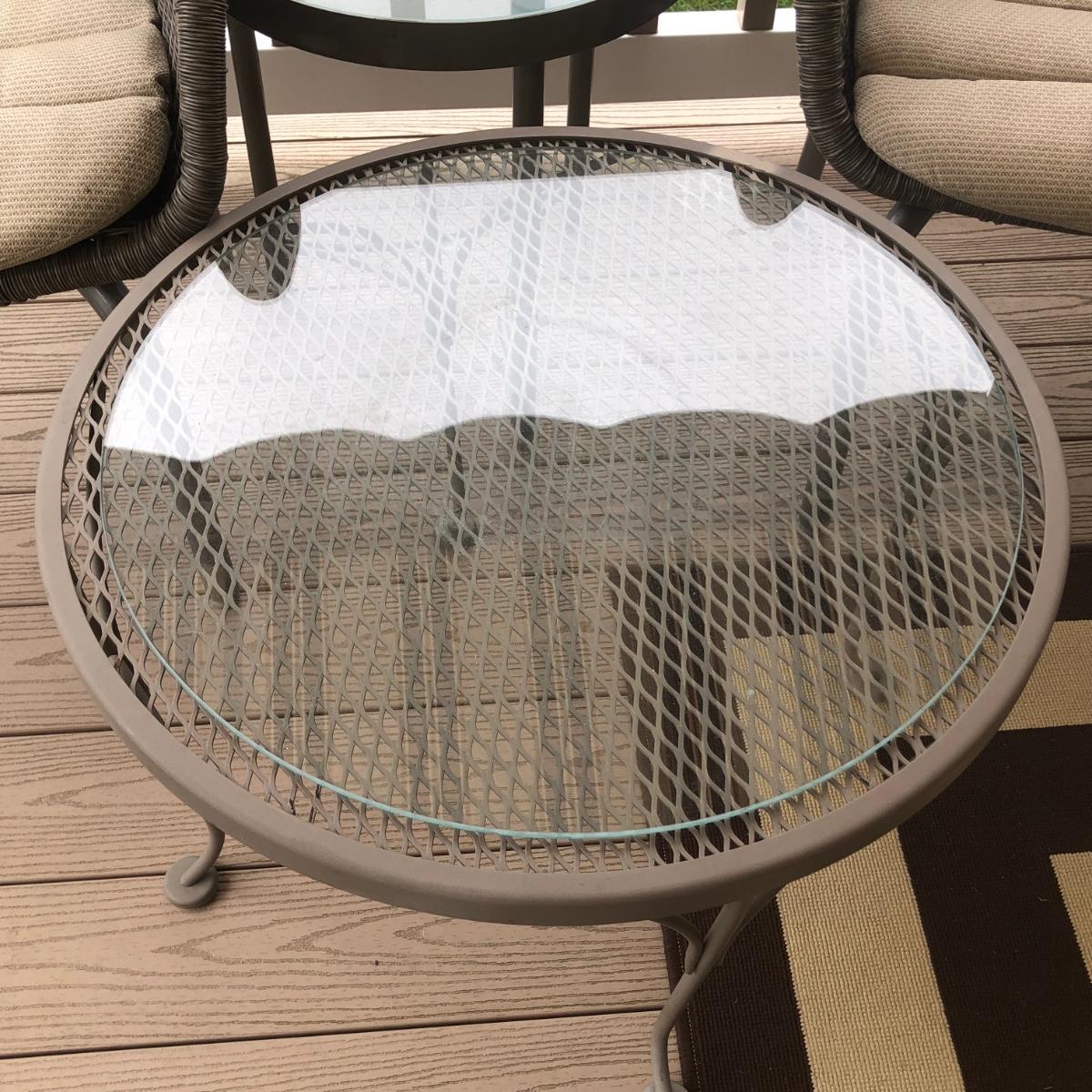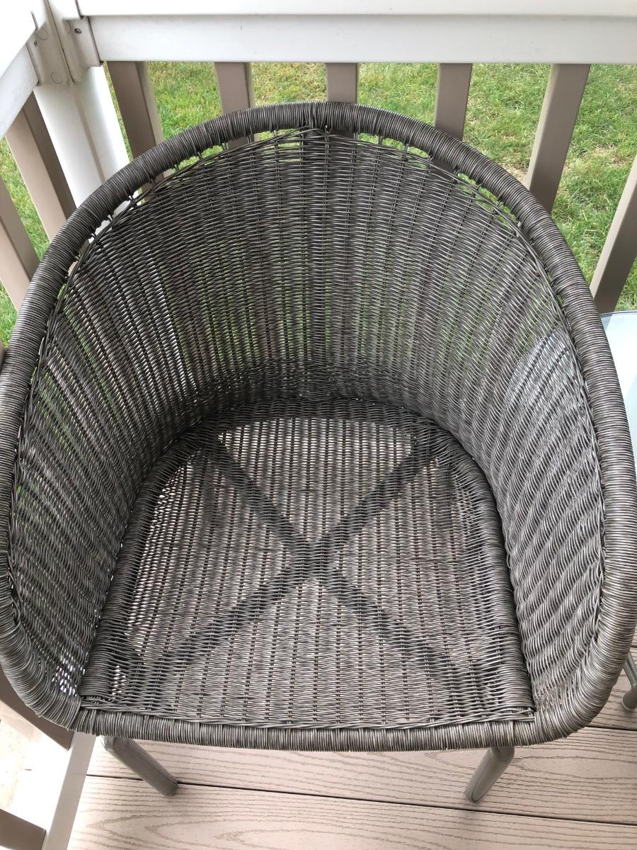 LOT 111P: Two Grey Wicker Patio Chairs w/ Two Patio Tables