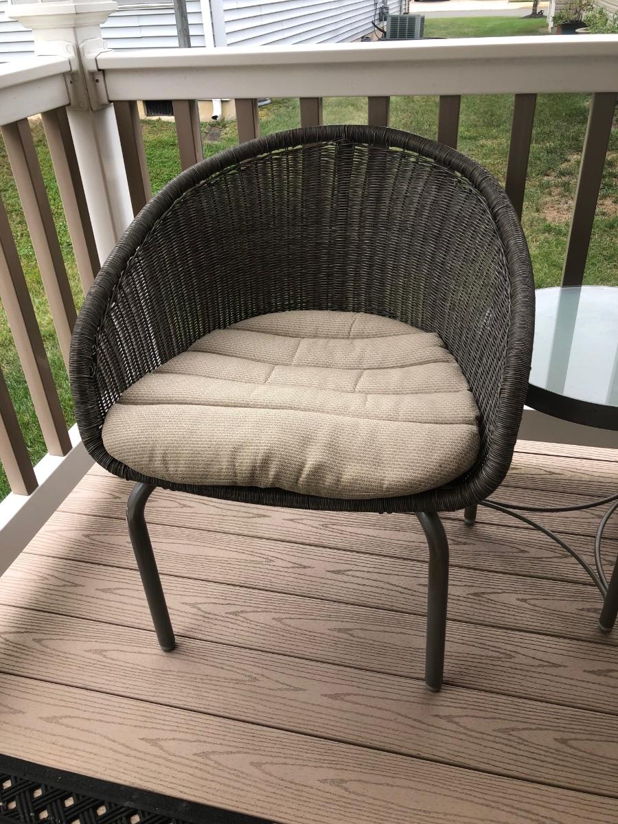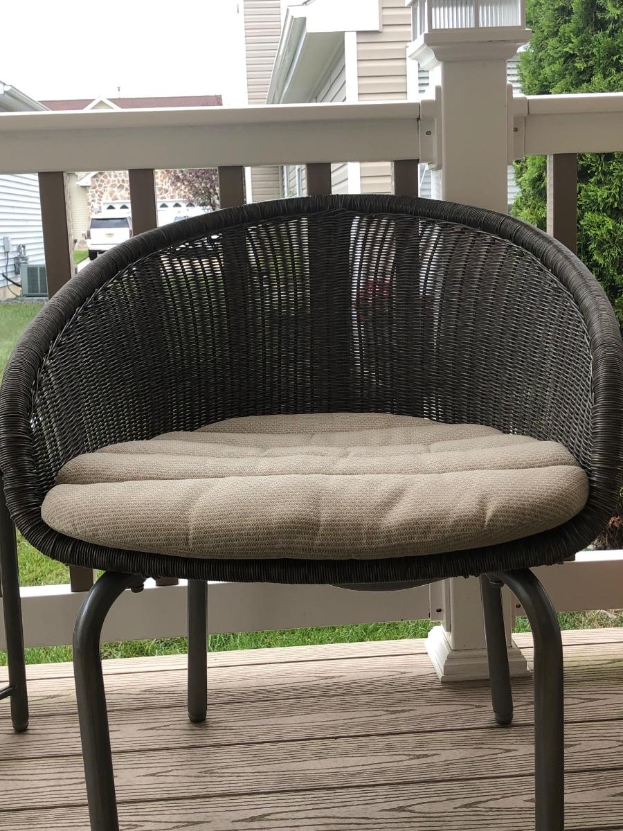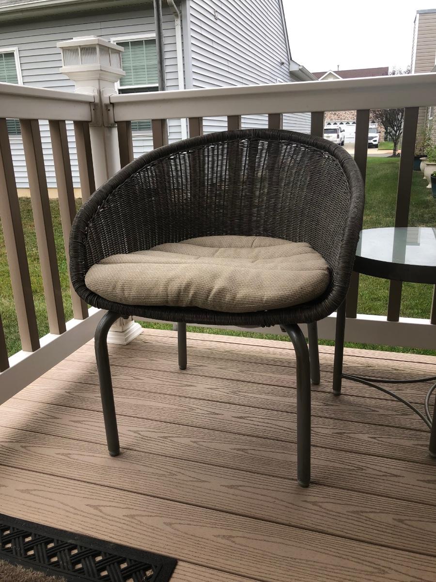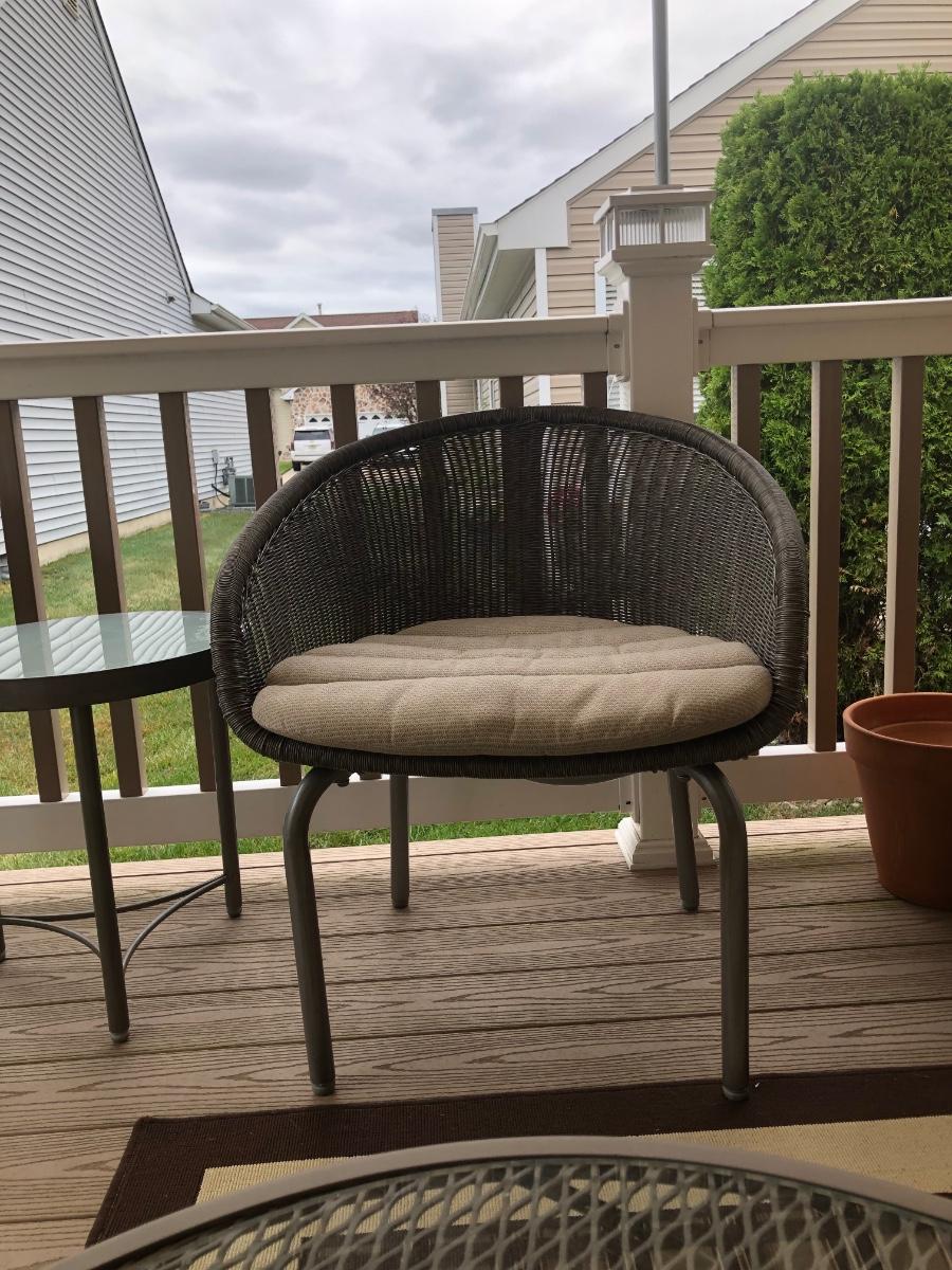 LOT 111P: Two Grey Wicker Patio Chairs w/ Two Patio Tables