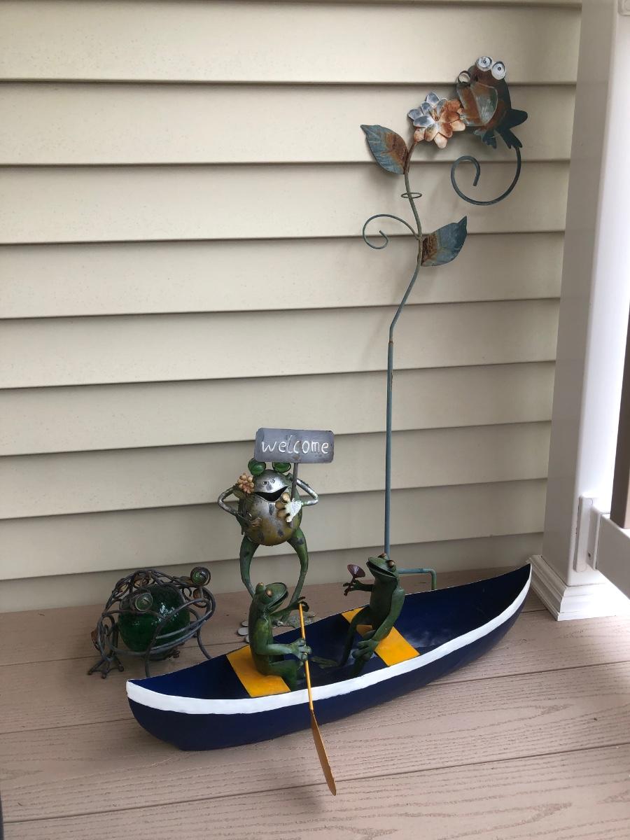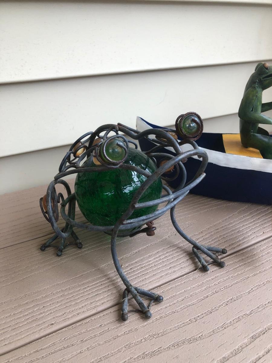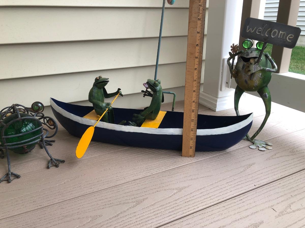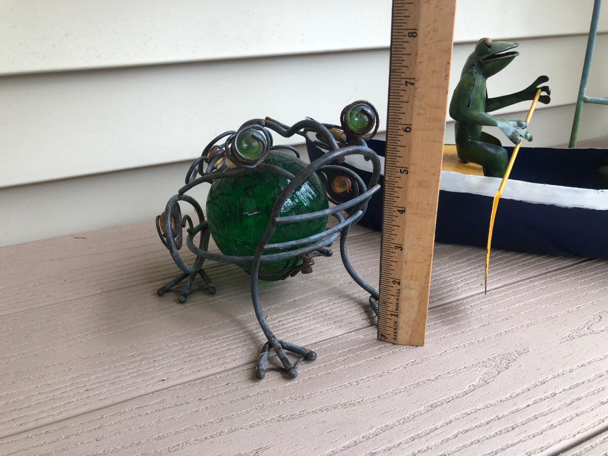 LOT 113P: Collection of Metal Frog Outdoor Decor - Frogs in Rowboat, Welcome Frog, Yard Stake Frog & Green Gazing Ball Frog