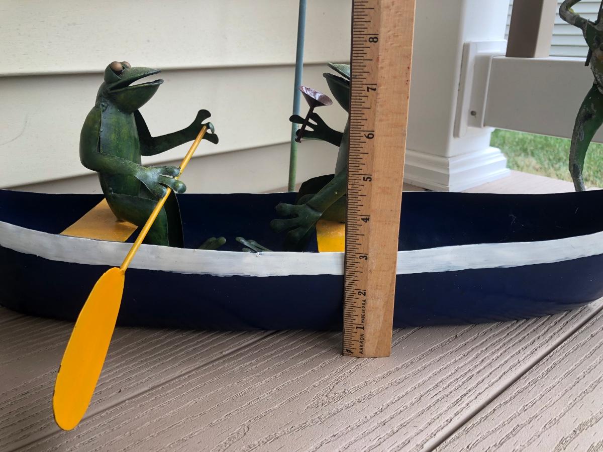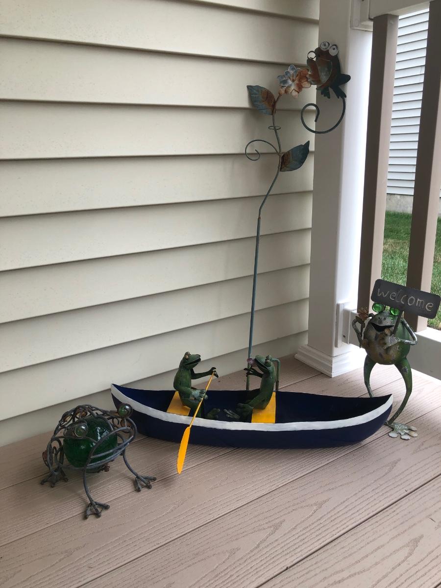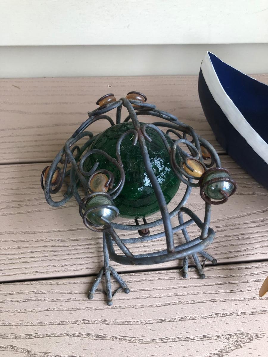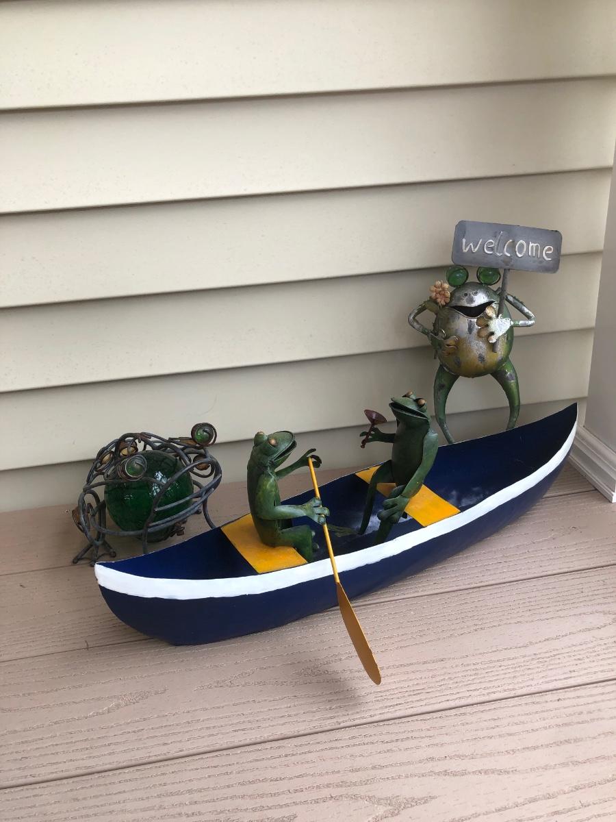 LOT 113P: Collection of Metal Frog Outdoor Decor - Frogs in Rowboat, Welcome Frog, Yard Stake Frog & Green Gazing Ball Frog