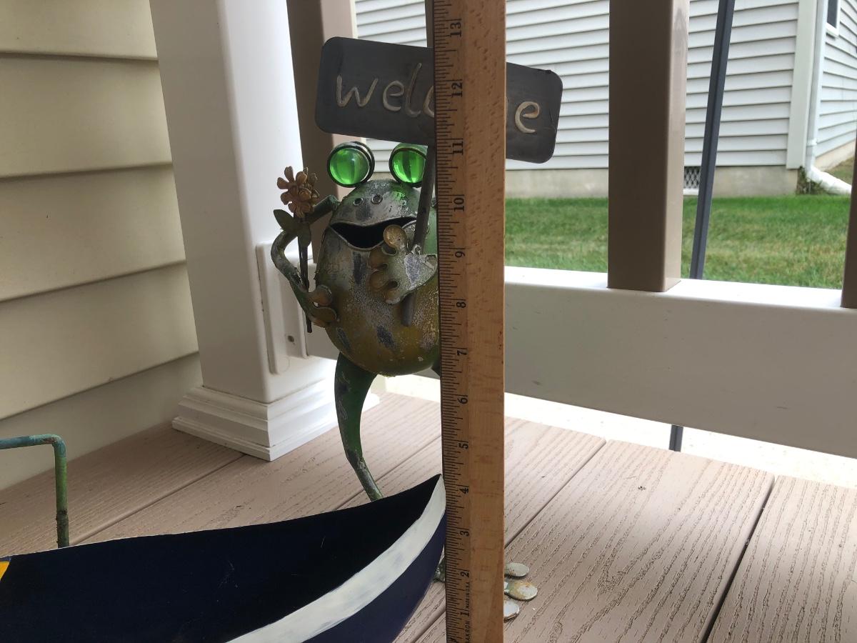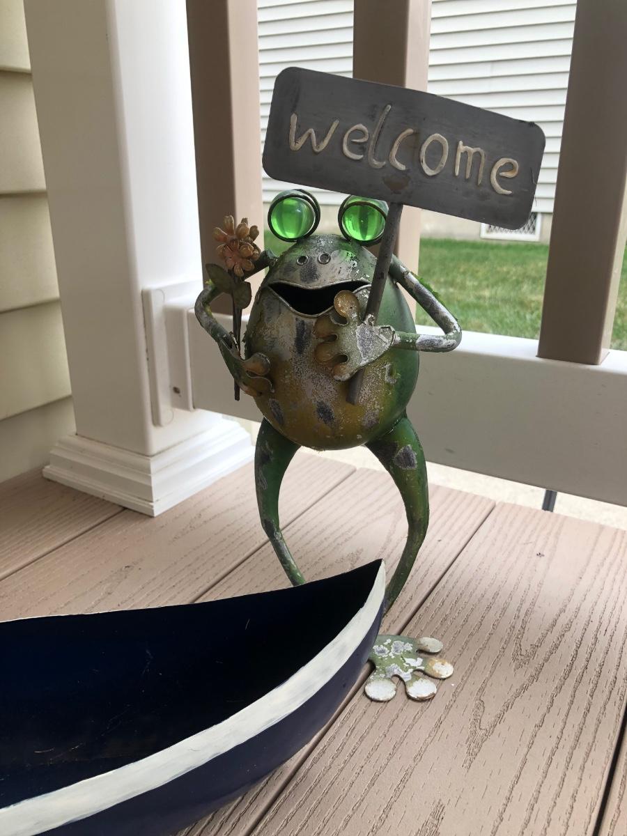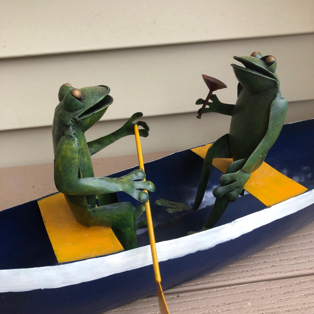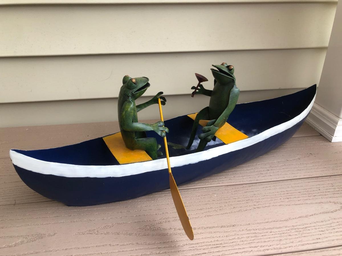 LOT 113P: Collection of Metal Frog Outdoor Decor - Frogs in Rowboat, Welcome Frog, Yard Stake Frog & Green Gazing Ball Frog