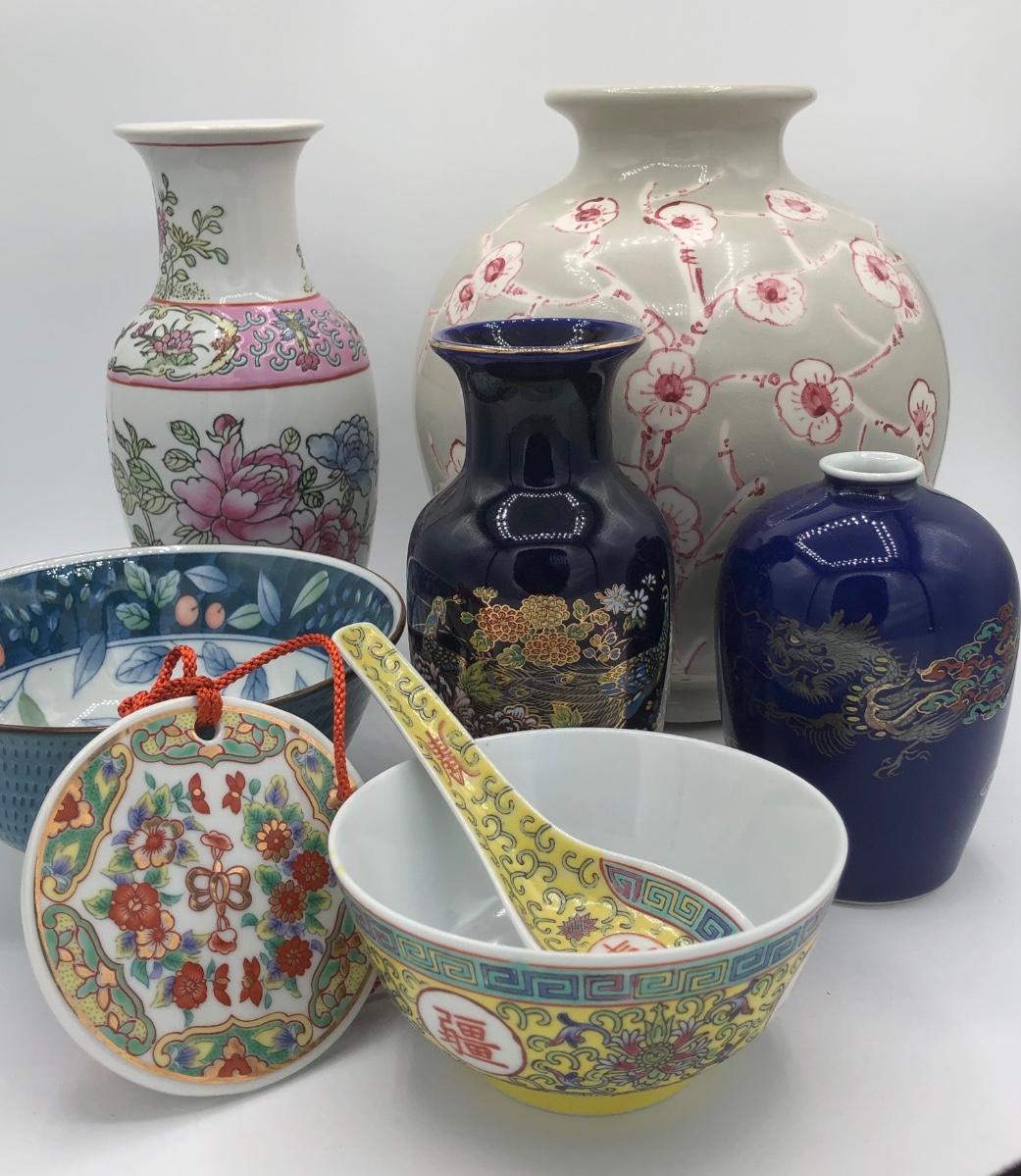 LOT 215L: Toyo Bird Song Vase, Tree Blossom Vase made in Italy, MCI Japan Peacock Vase, Hand Painted Traditional Dragon Vase & More