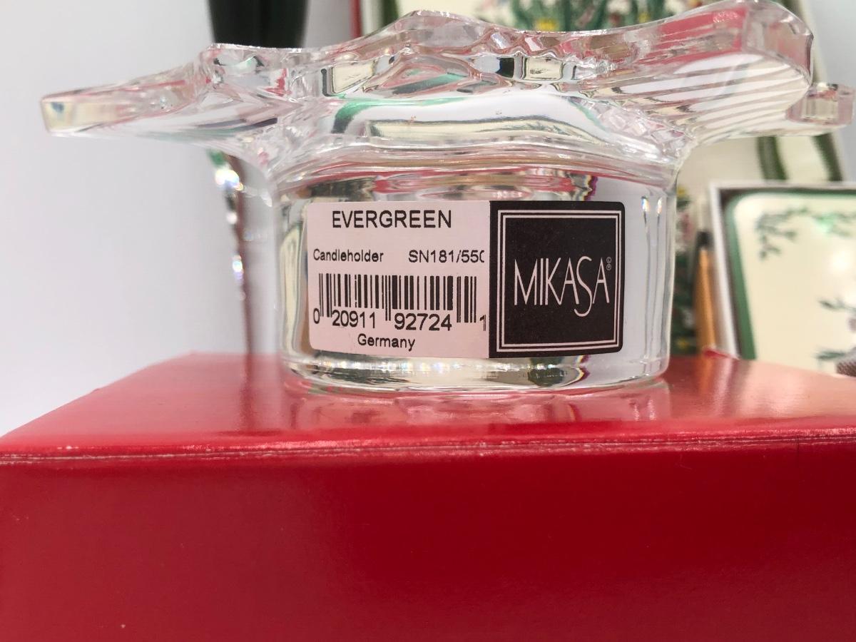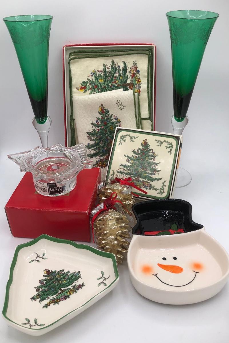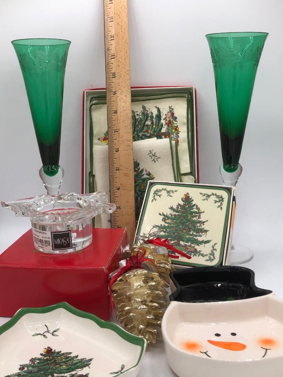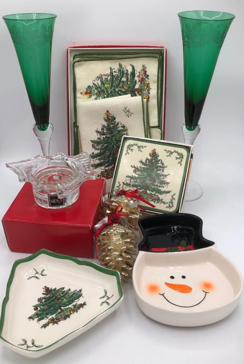 LOT 218L: Christmas Collection - Spode Tree Dish, Mikasa Evergreen Votive w/ Box, Pimpernel Spode Tree Coasters w/ Matching Cloth Napkins & More