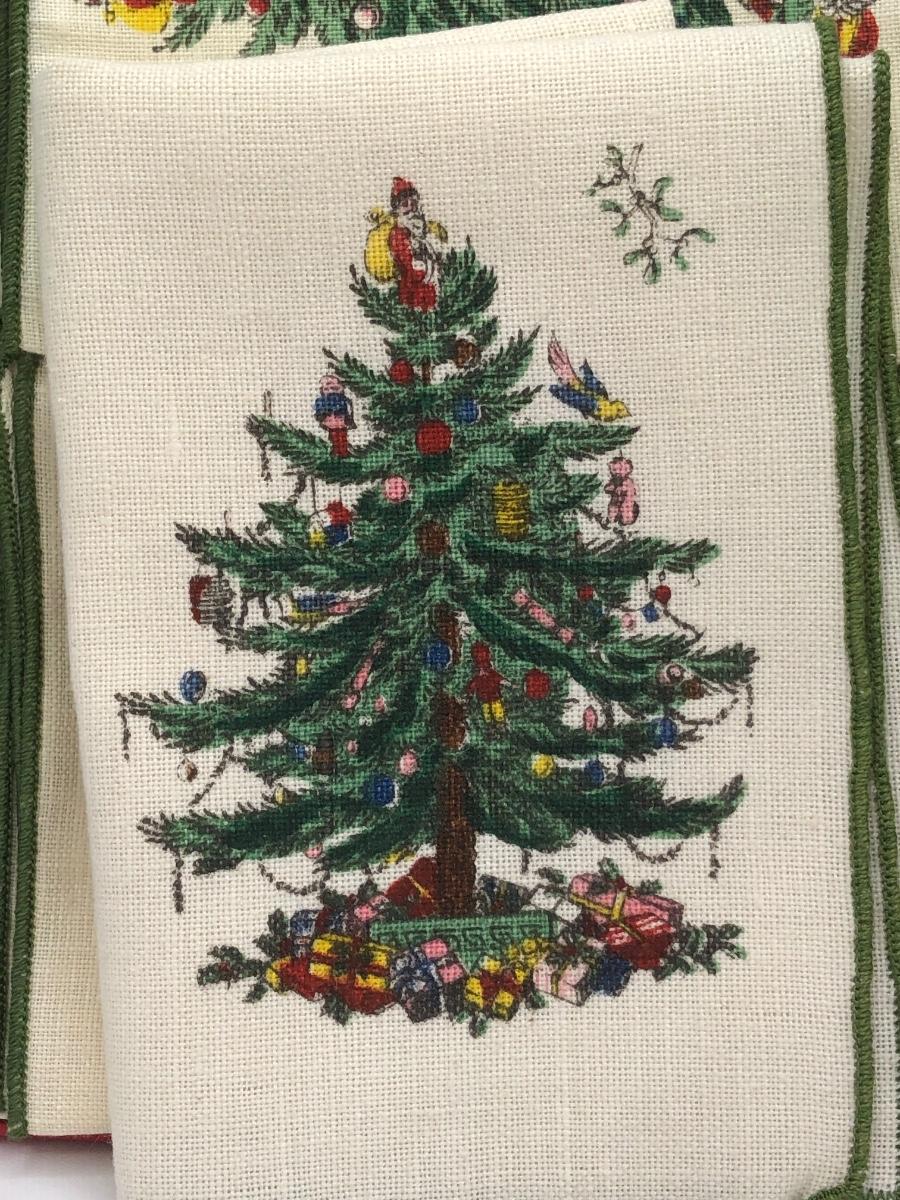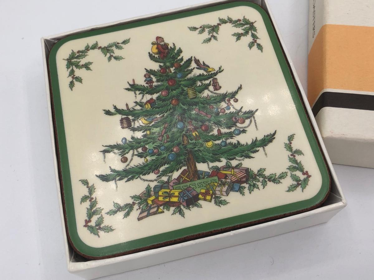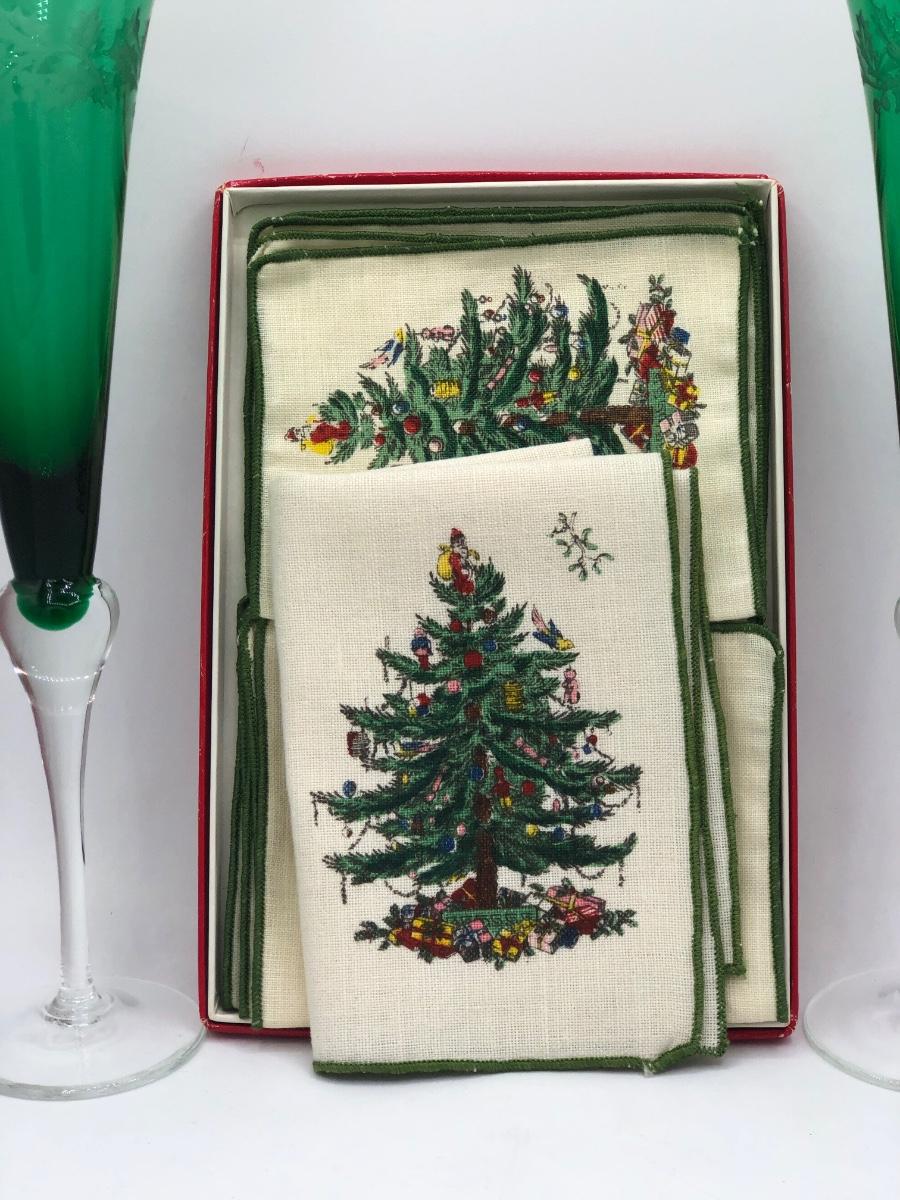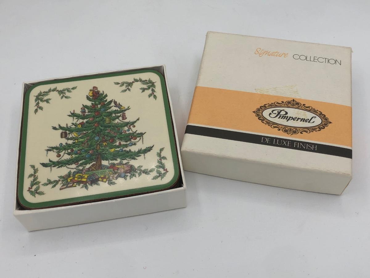LOT 218L: Christmas Collection - Spode Tree Dish, Mikasa Evergreen Votive w/ Box, Pimpernel Spode Tree Coasters w/ Matching Cloth Napkins & More