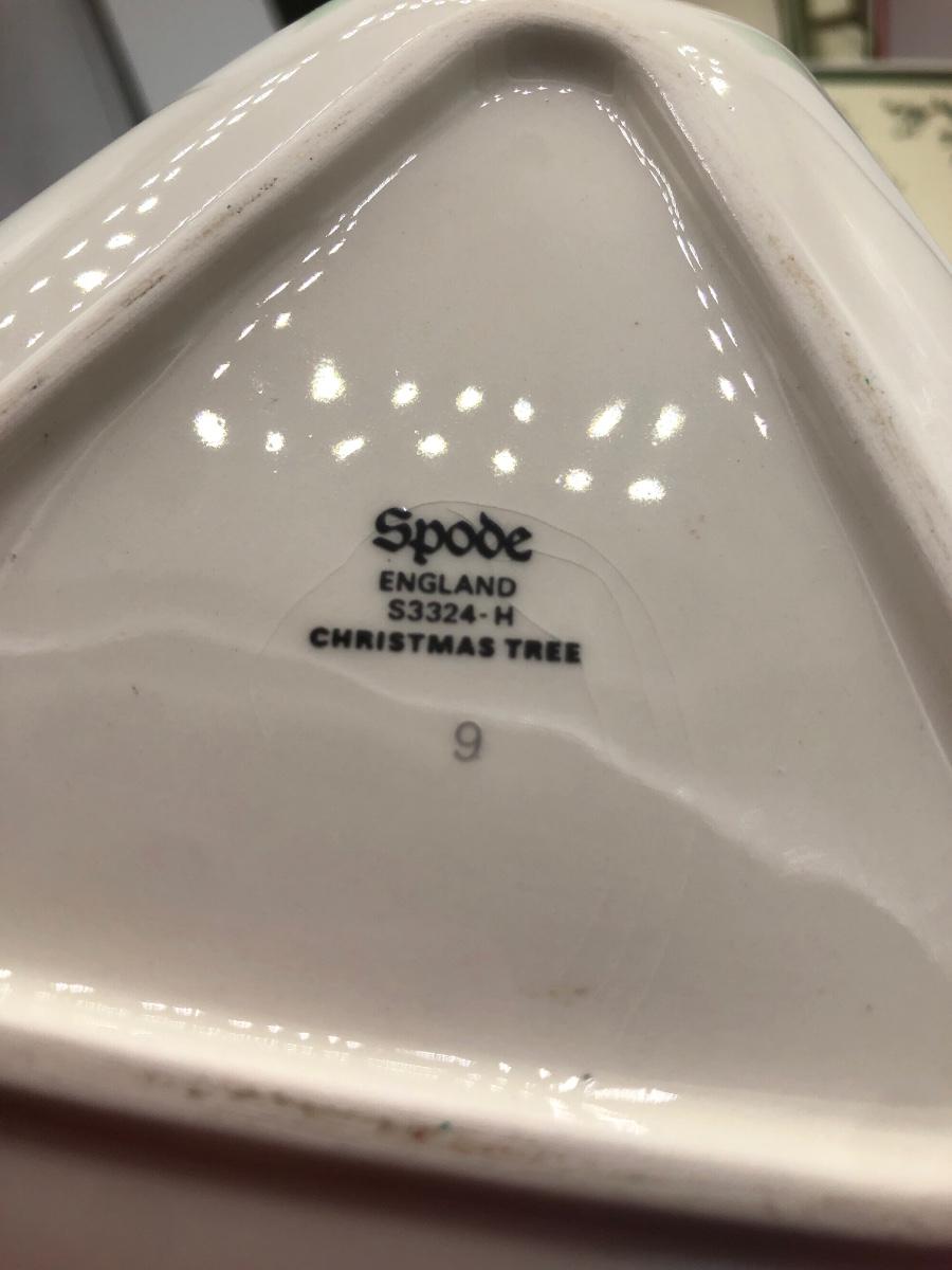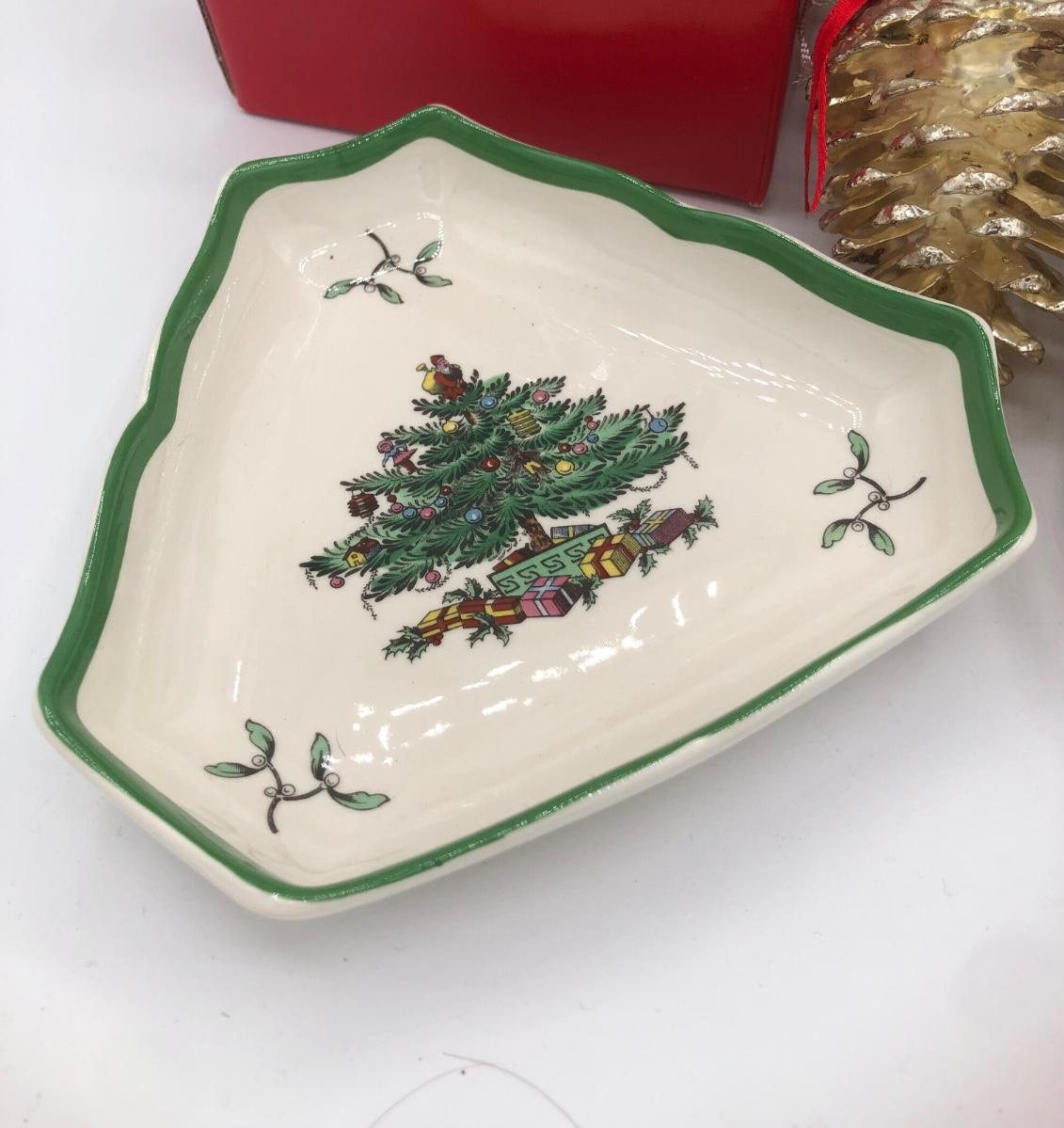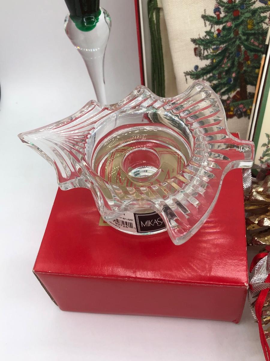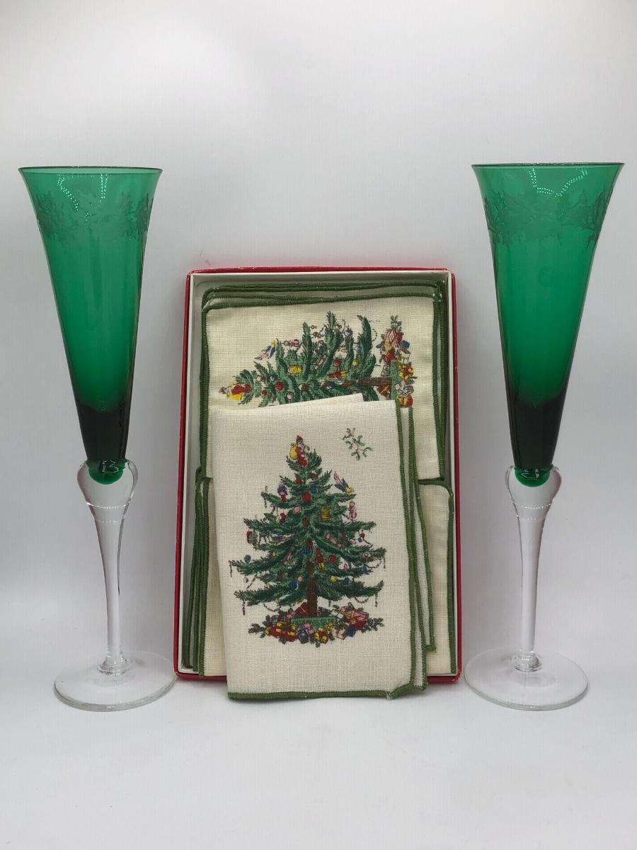 LOT 218L: Christmas Collection - Spode Tree Dish, Mikasa Evergreen Votive w/ Box, Pimpernel Spode Tree Coasters w/ Matching Cloth Napkins & More