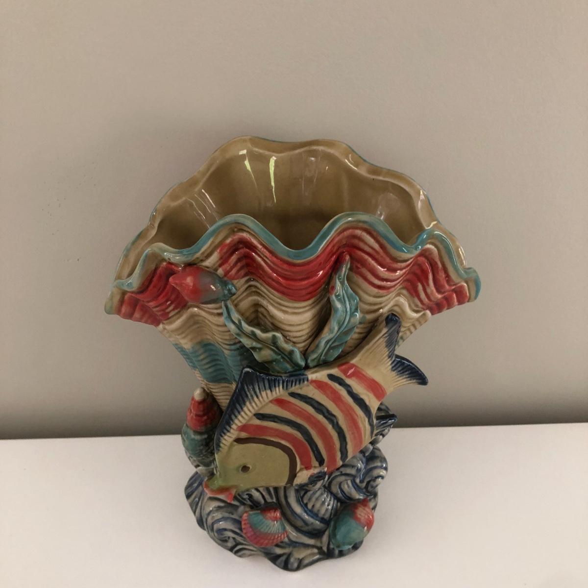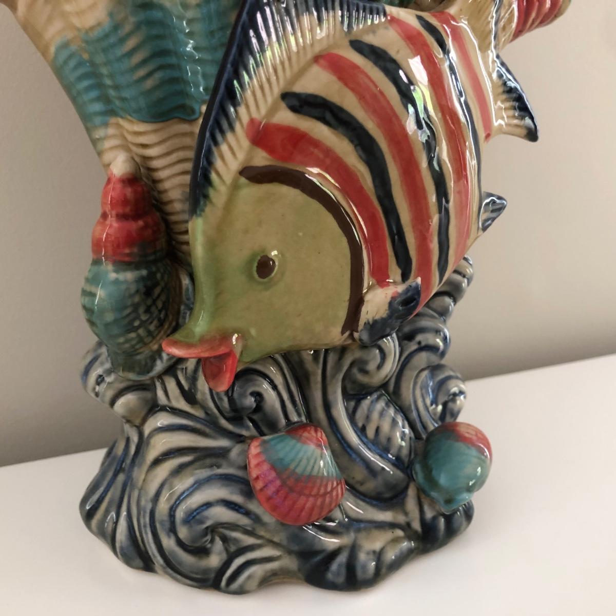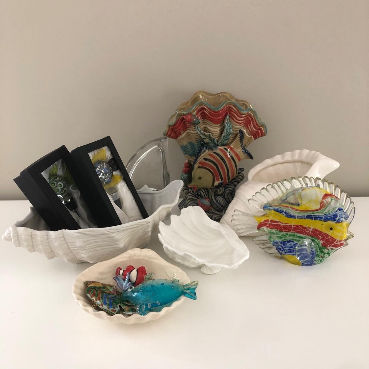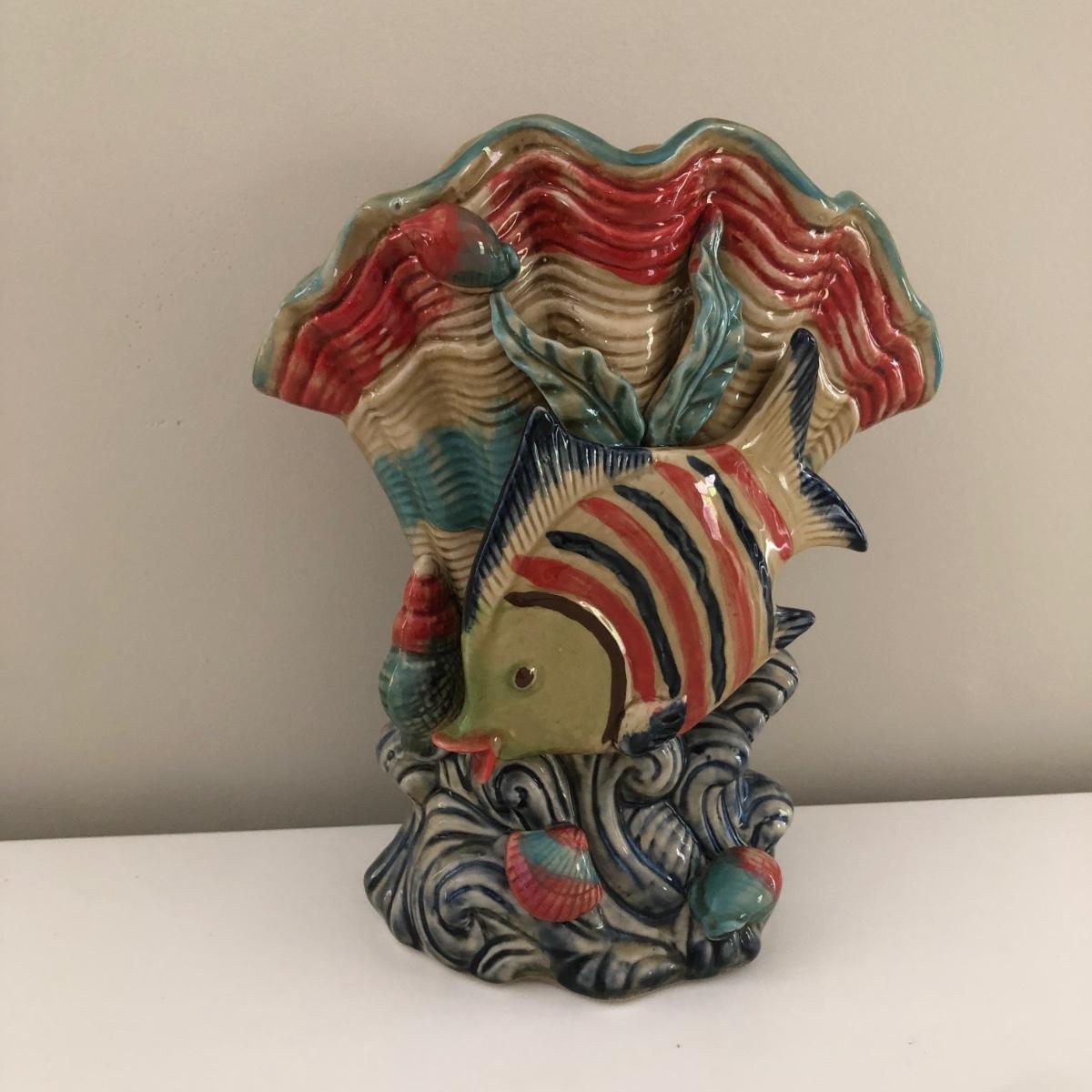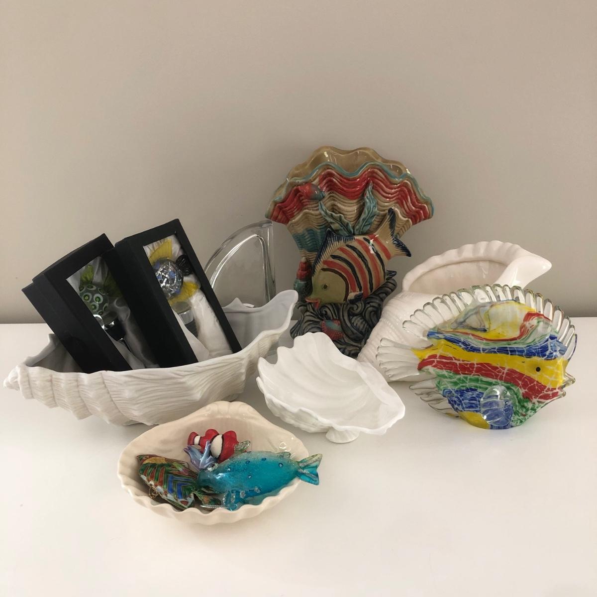 LOT 234L: Wedgewood Nautilus Collection Porcelain Sea Shell Dish, Colorful Art Glass Fish, Mason’s Crabtree & Evelyn Seashell, Art Deco 1970s Fish Coral Pottery Vase, Nautica Quartz Desk Clock & More