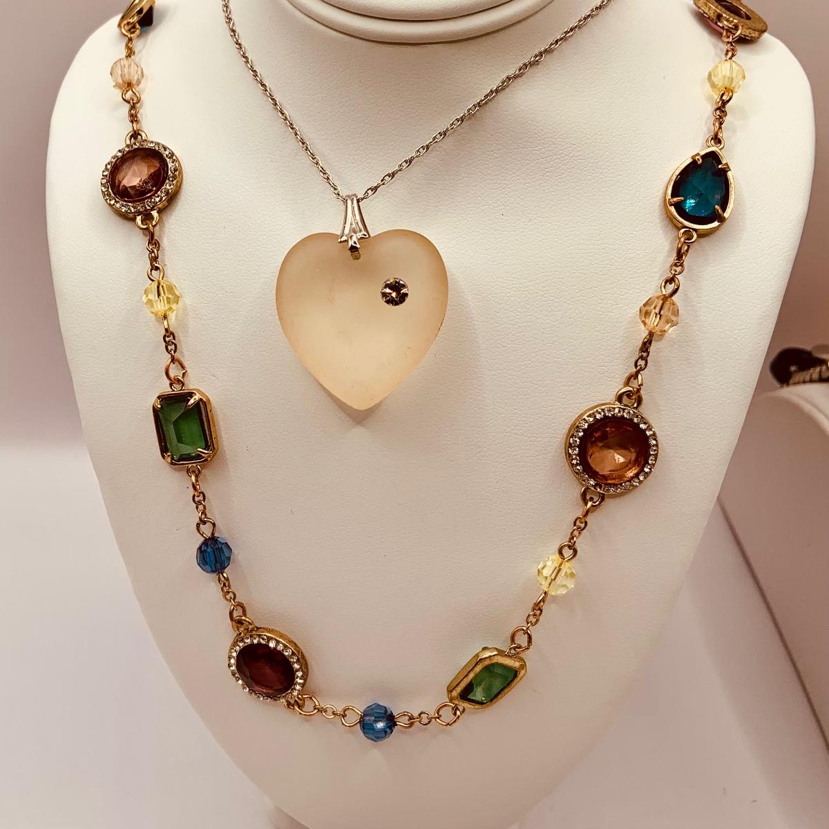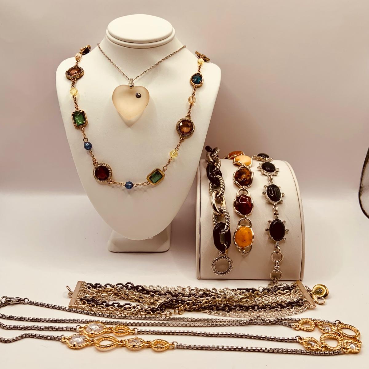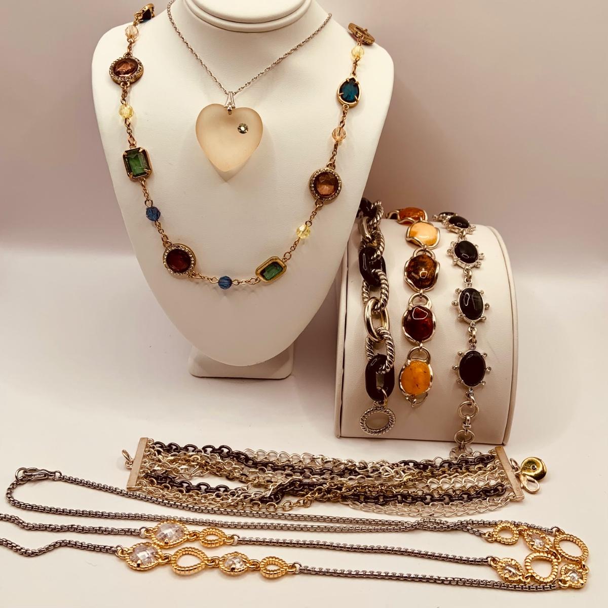 LOT:11: Collection of Fashion Jewerly Featuring a Beautiful Frosted Glass Heart Pendant, Tone Necklace and Bracelets and More