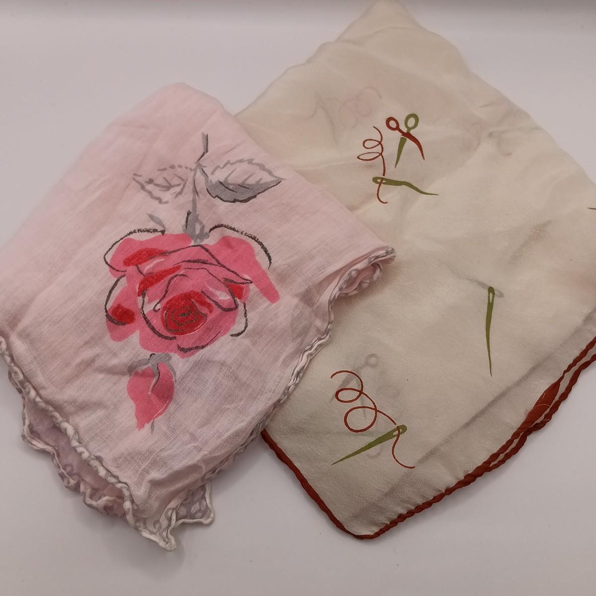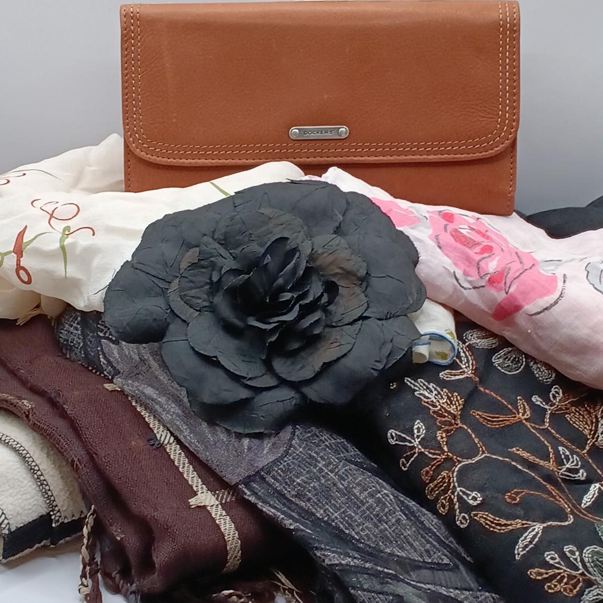 LOT 30: Dockers Leather Wallet with Vintage Handkerchiefs, Scarves & Floral Brooch