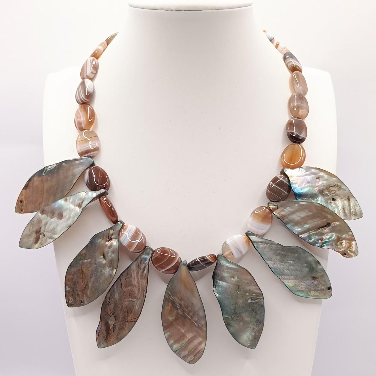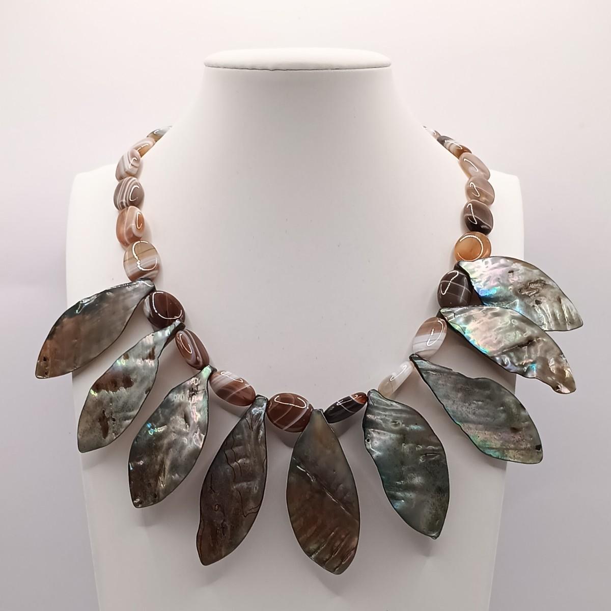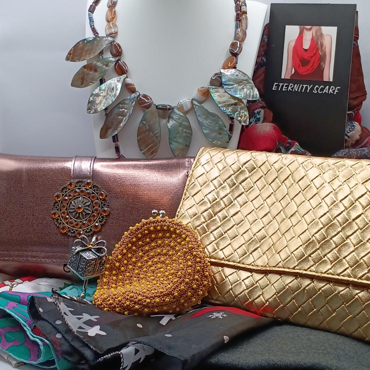 LOT 32: Agate and Abalone Bead Statement Necklace with Sterling Clasp, Yik Fung Metallic Wallet, Knitted Coin Purse & More