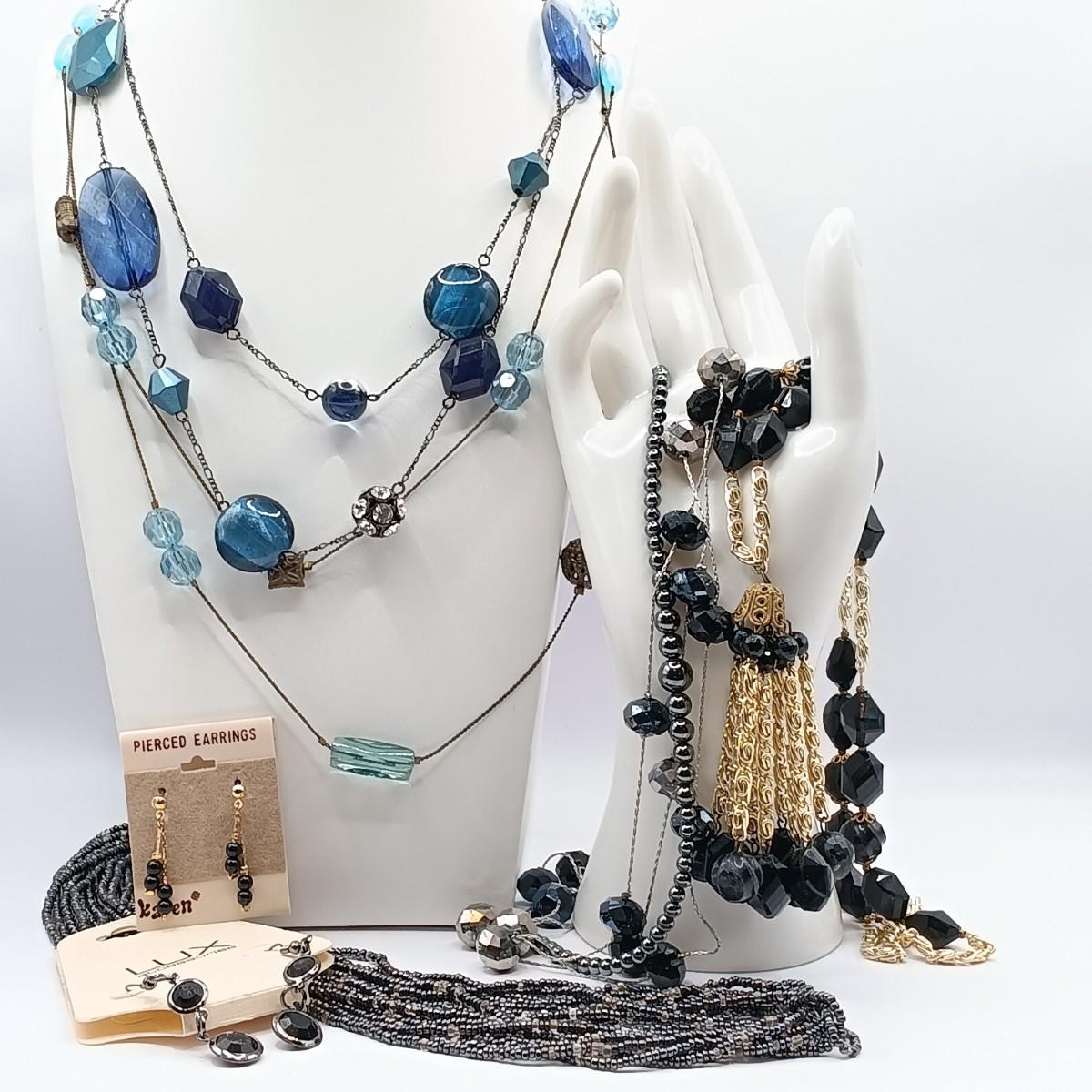 LOT 35: Vintage Hematite Necklace, Karen Brand Earrings, Gold-Tone Mini Paperclip and Black Bead Tassel Necklace & More