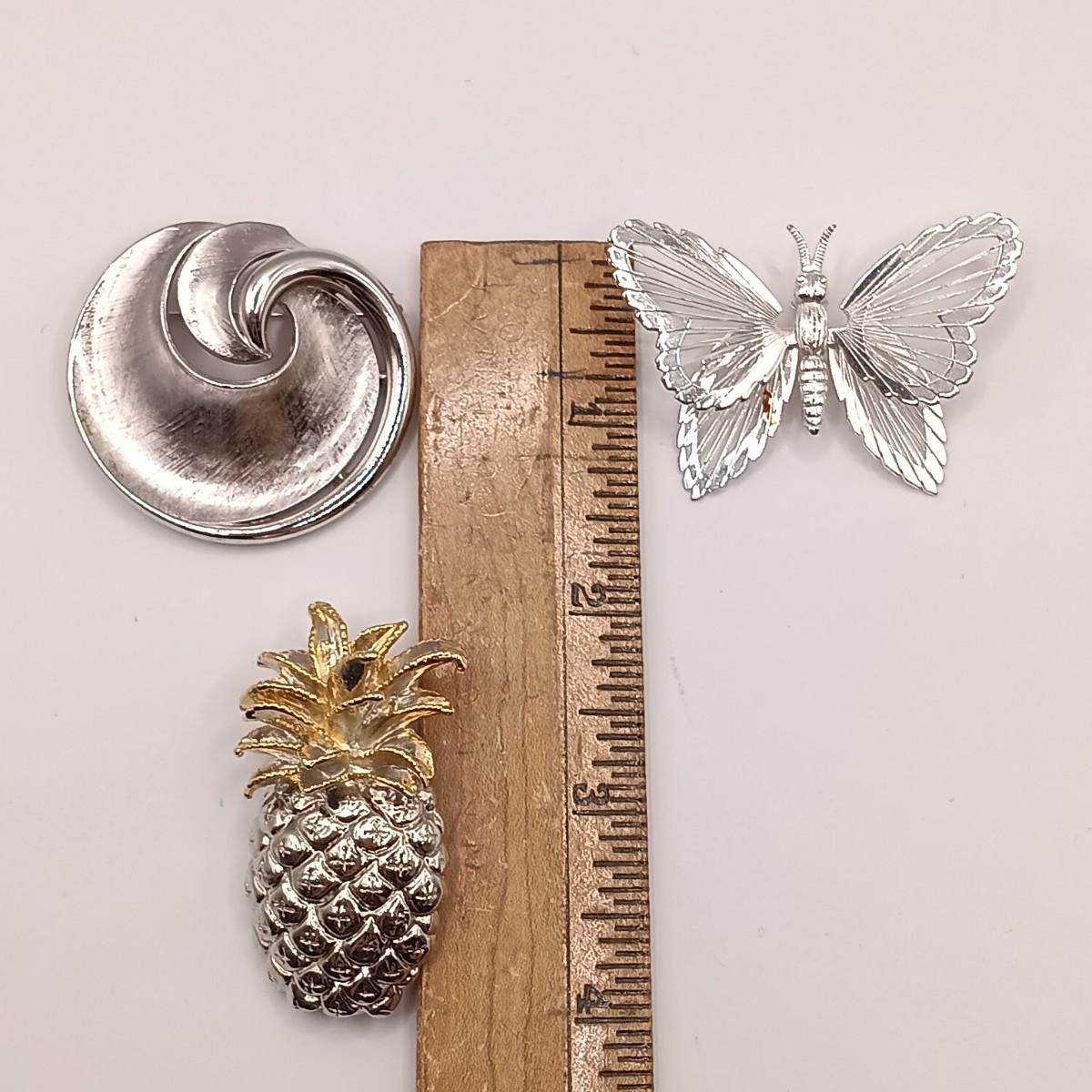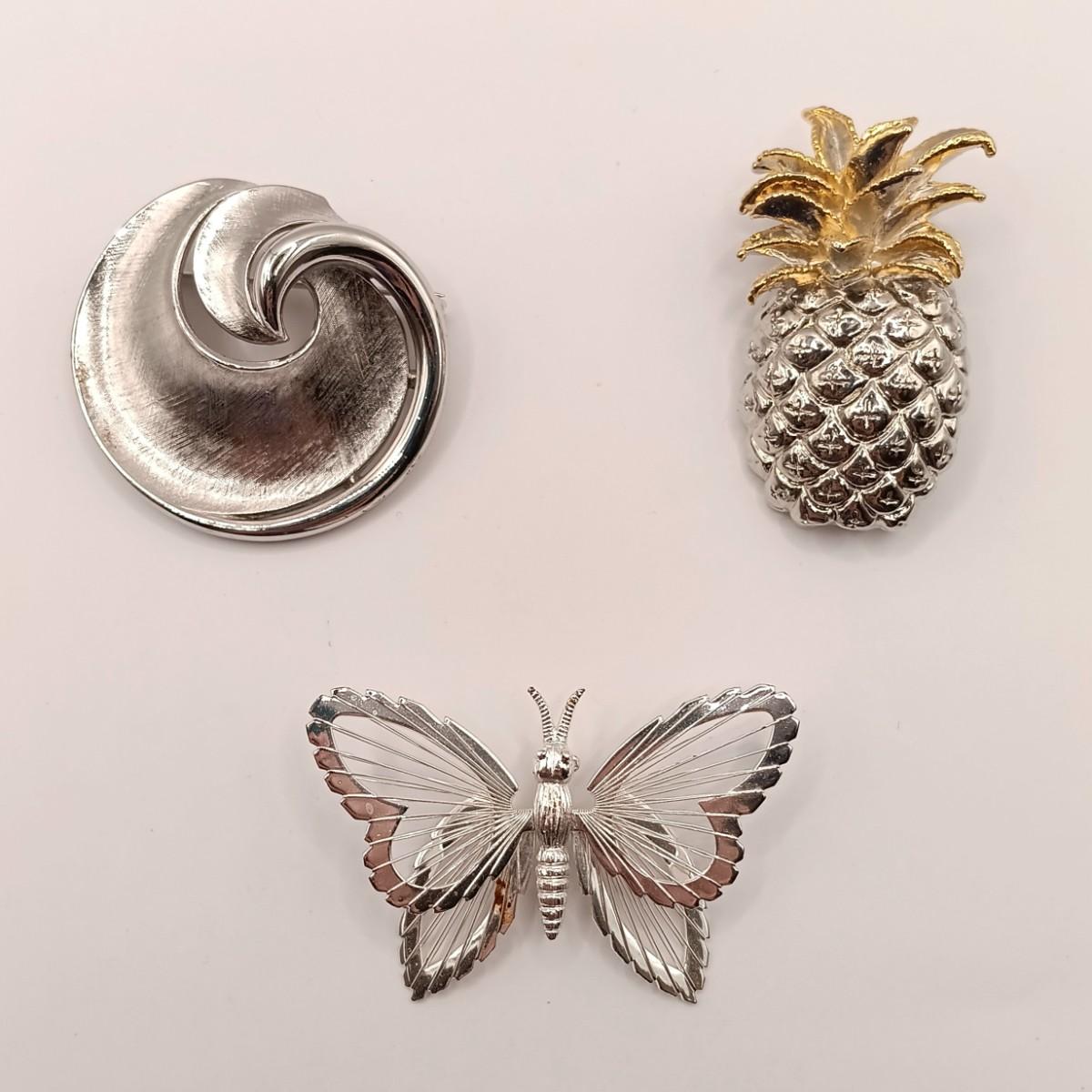 LOT 45: Crown Trifari Swirl Brooch, Two-Tone Pineapple Brooch and Monet Butterfly Brooch
