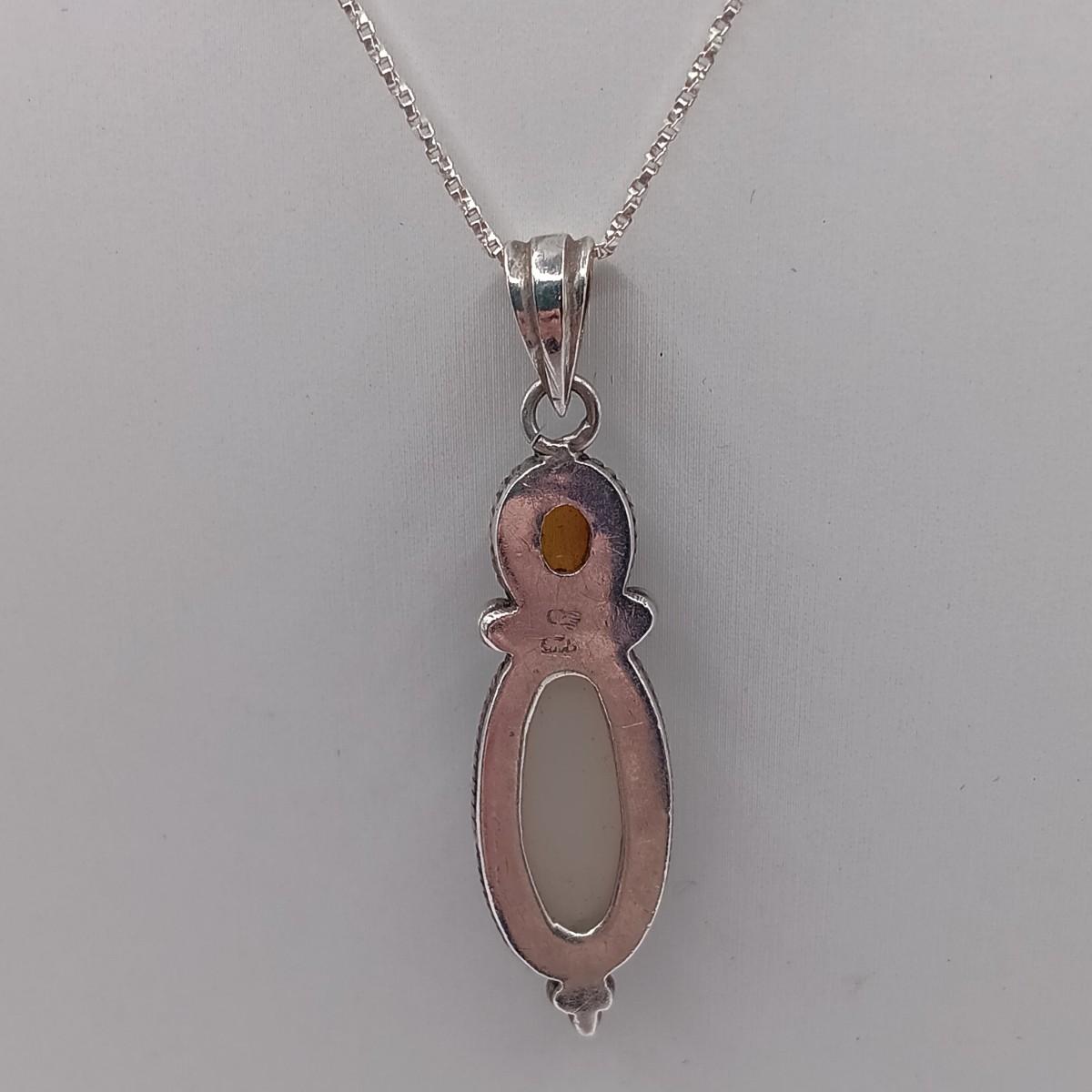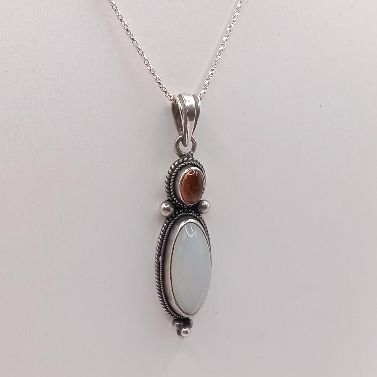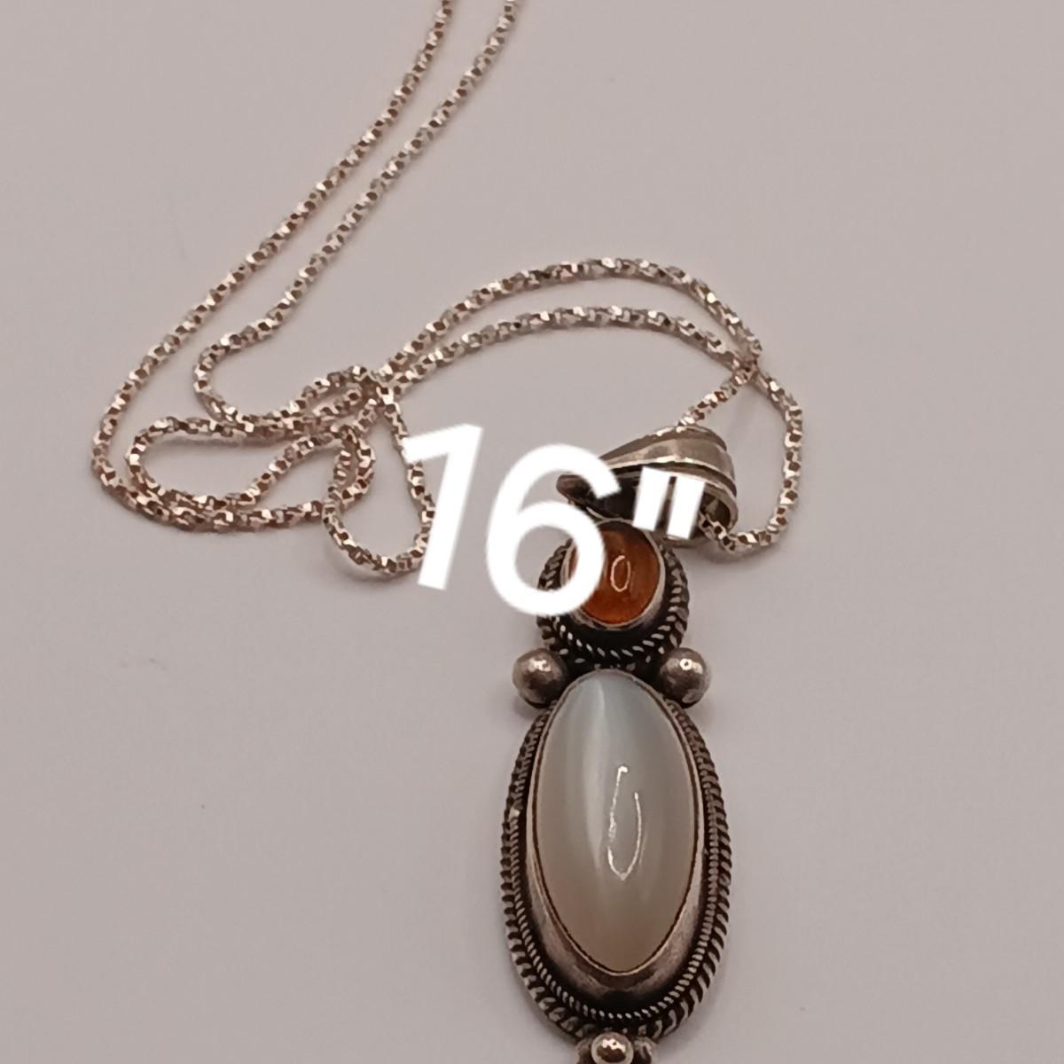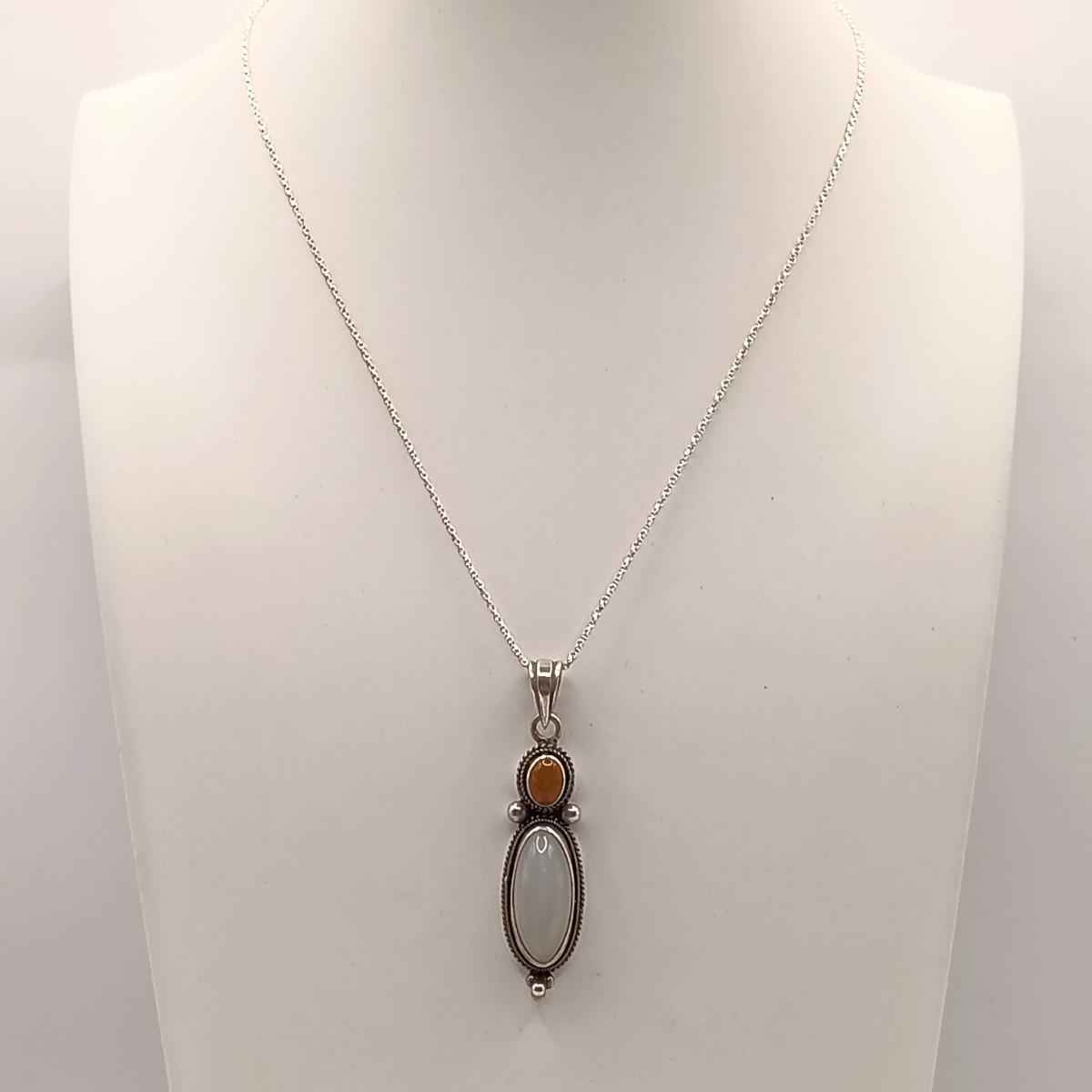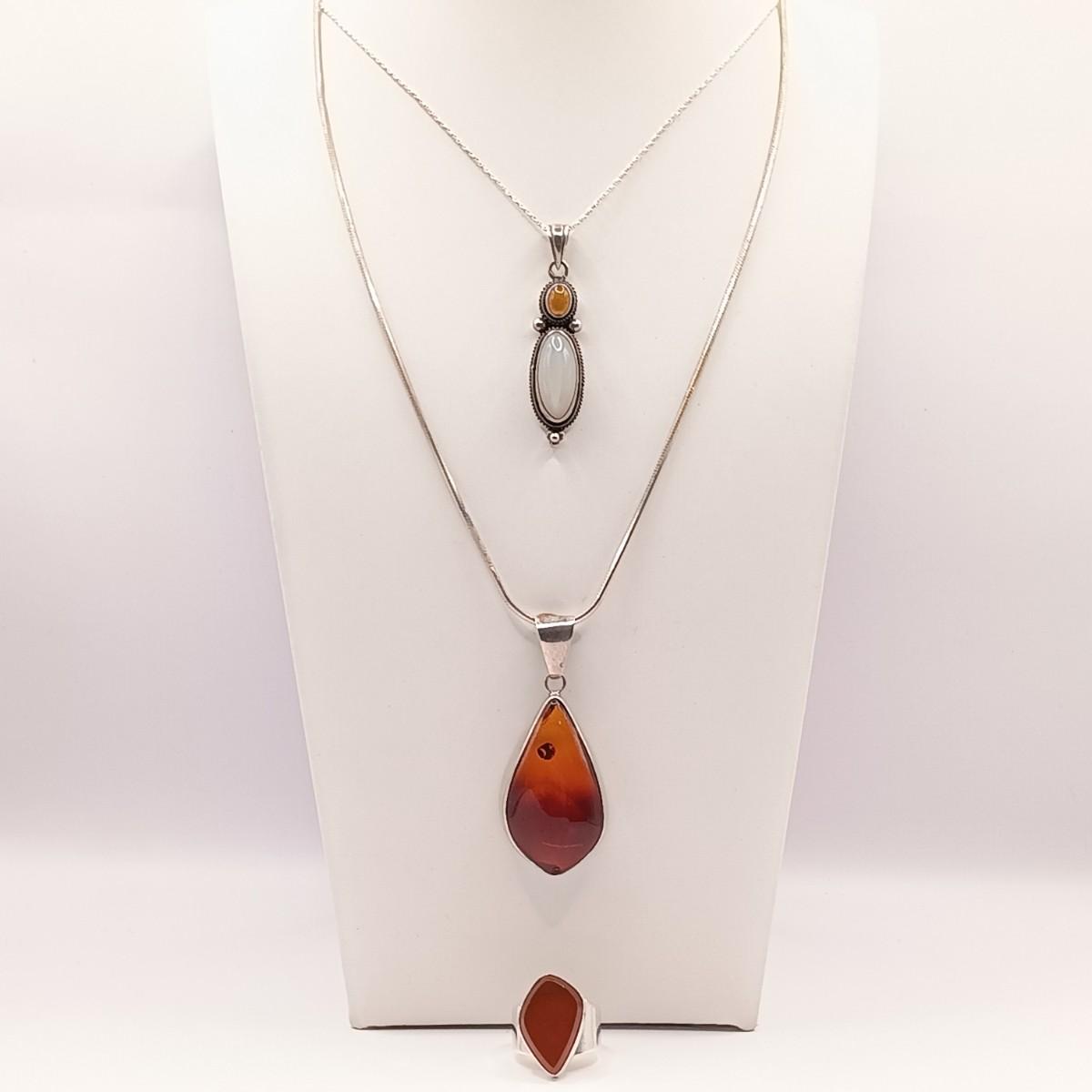 LOT 50: Two Sterling Silver Pendant Necklaces- A Sterling Carnelian & Moonstone pendant and an Amber Pendant and a Carnelian Gemstone Ring