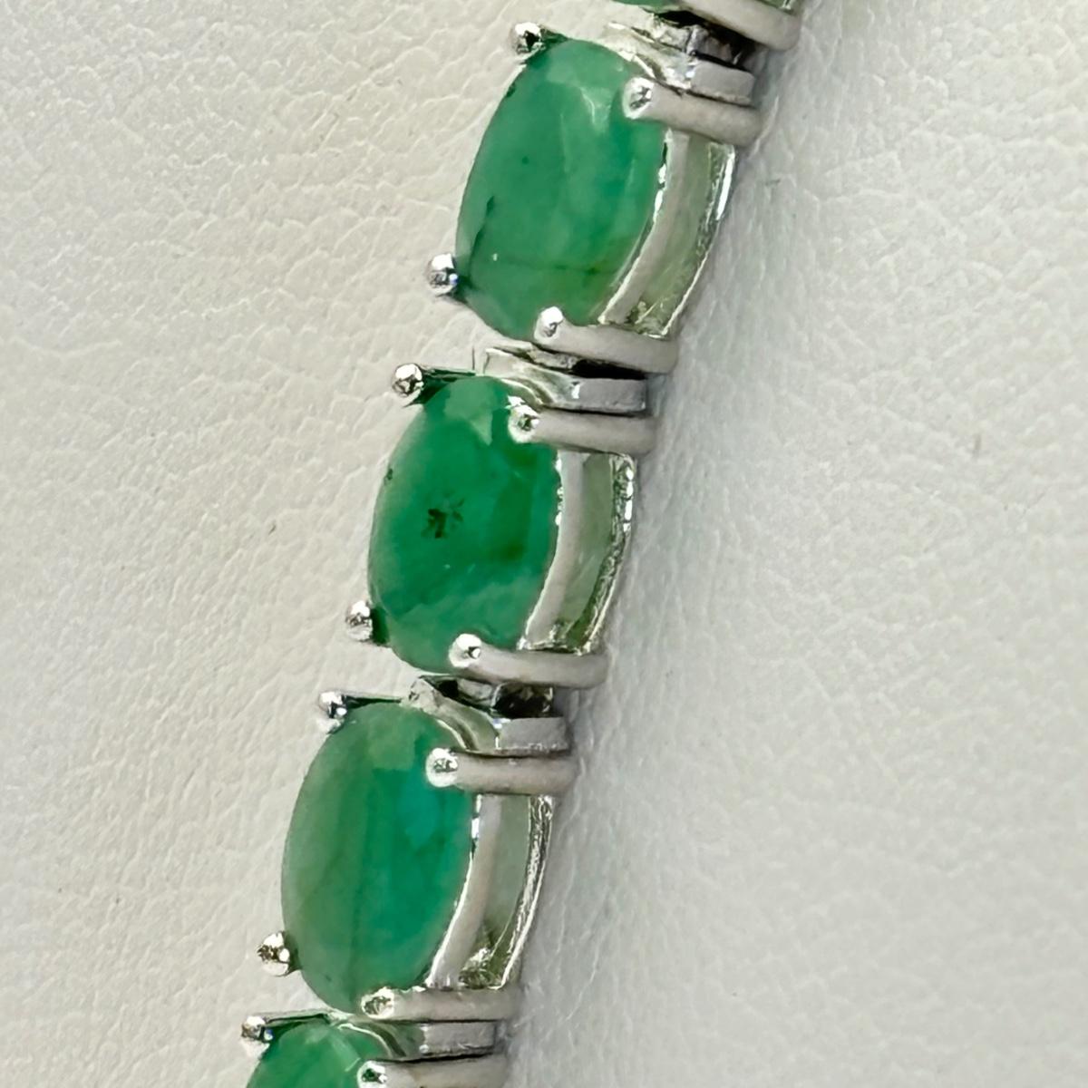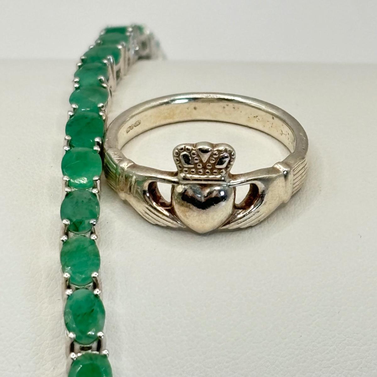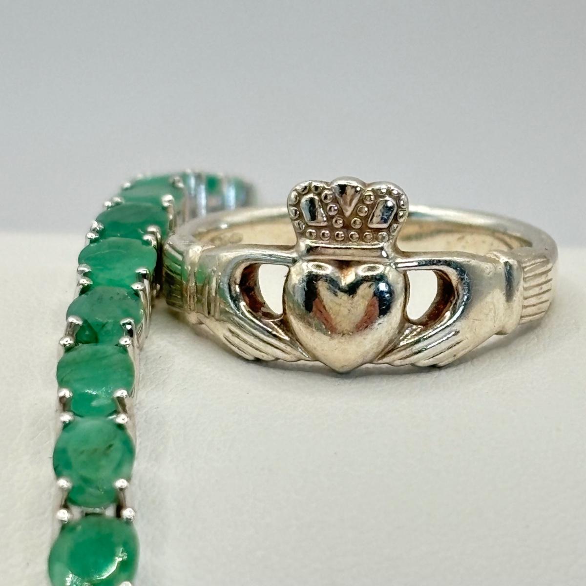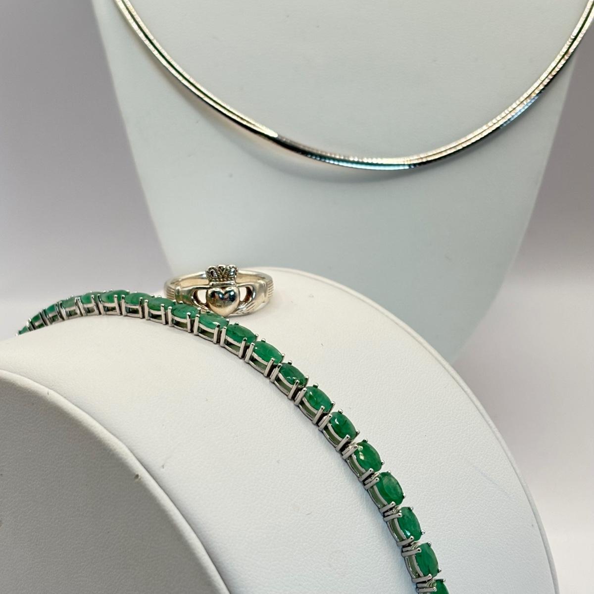 LOT 64: QVC Affinity Gems Sterling Silver (KJC 925) Emerald Tennis Bracelet, Solvar 925 Sterling Silver Claddagh Ireland Ring Sz. 8, Sterling Silver Omega Choker (925, 1/15 14k, Peru AU) .5