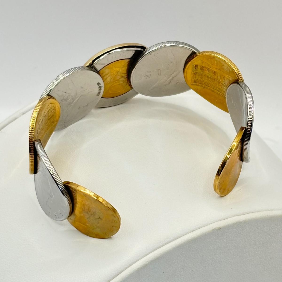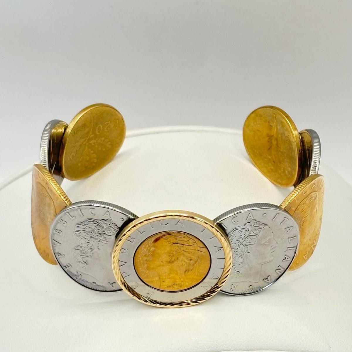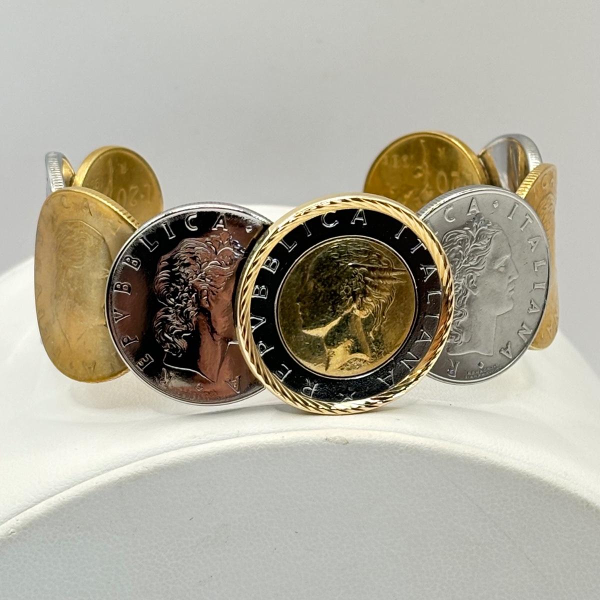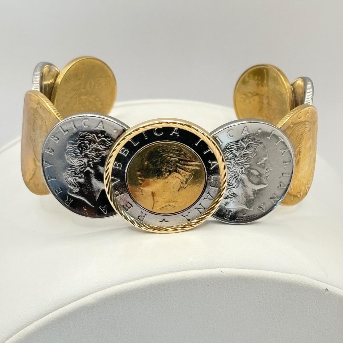 Pre-Owned cuff bracelet made up 9 overlapping, soldered together Italian coins, with 14kt. yellow gold bezel framing the focal 500 lira coin (only the center coin has the 14kt. yellow right, shiny Bright shiny like - new condition!