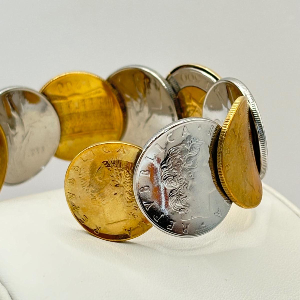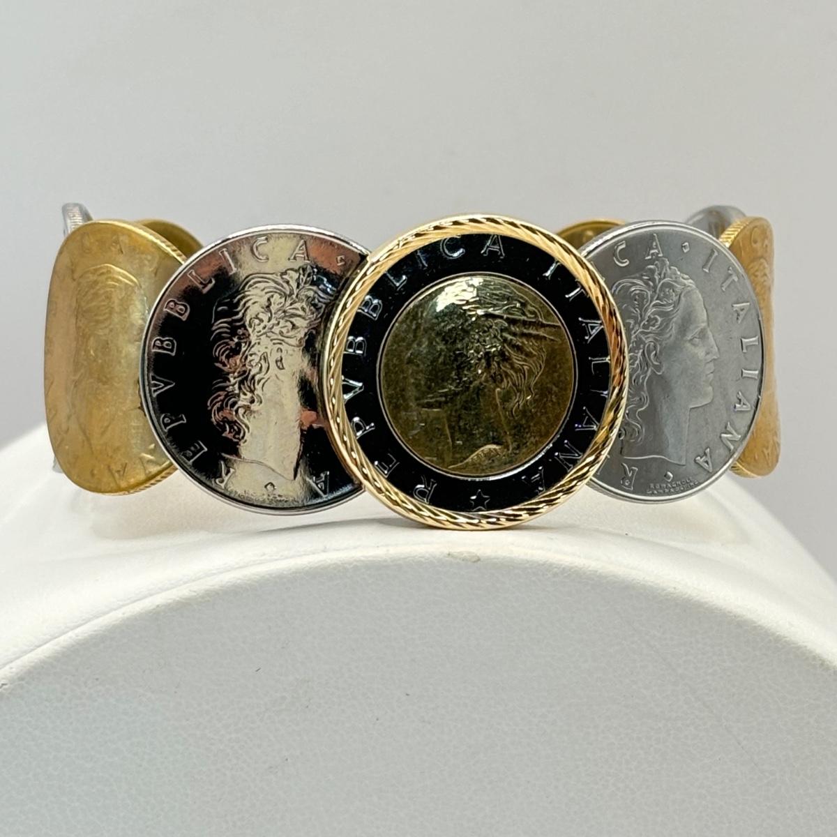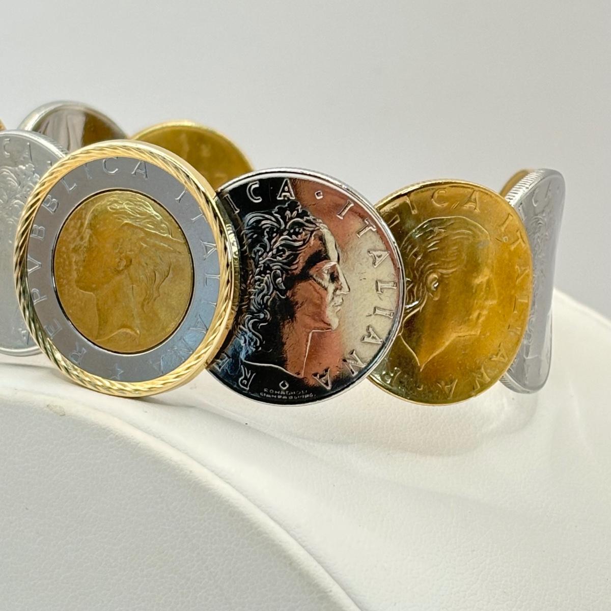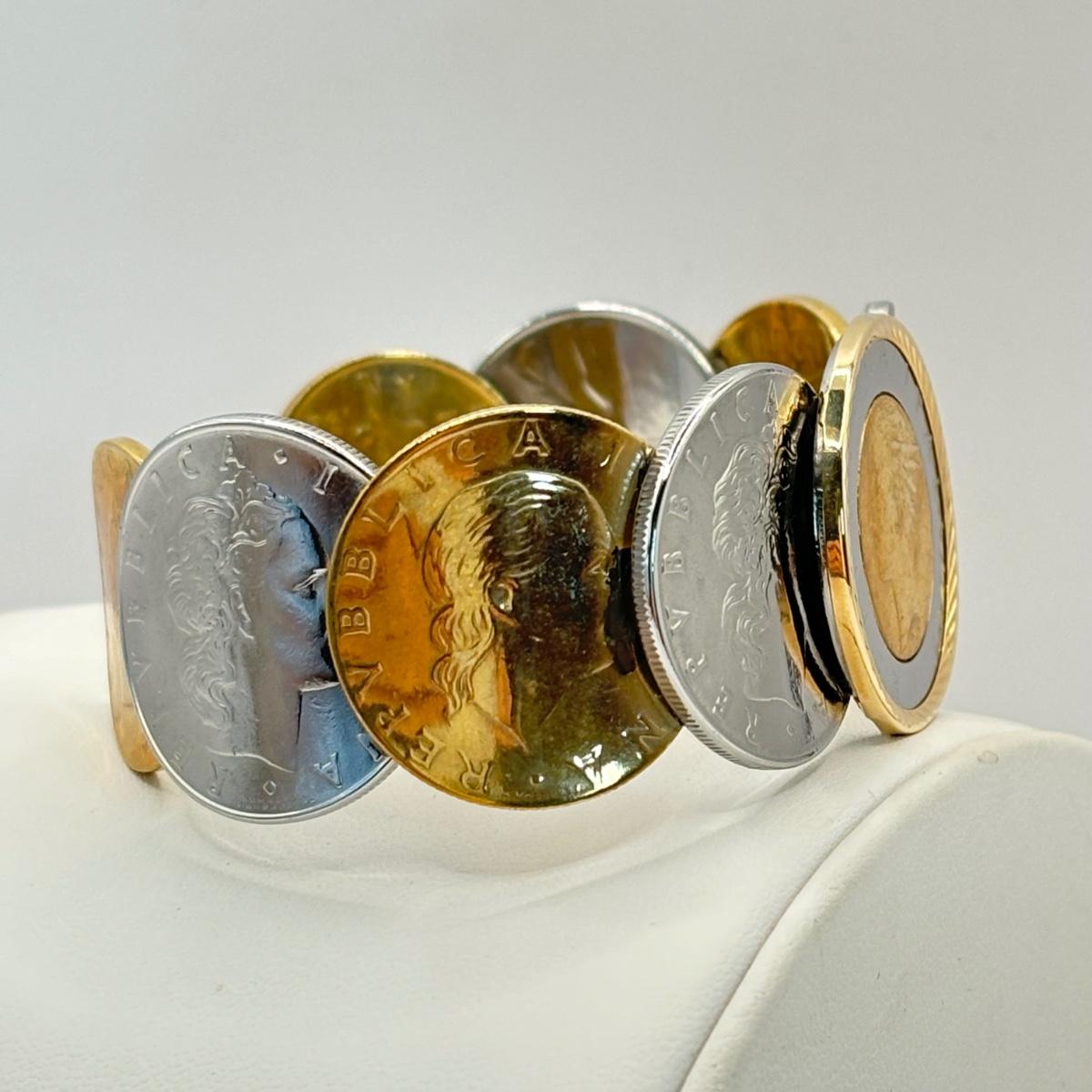 Pre-Owned cuff bracelet made up 9 overlapping, soldered together Italian coins, with 14kt. yellow gold bezel framing the focal 500 lira coin (only the center coin has the 14kt. yellow right, shiny Bright shiny like - new condition!