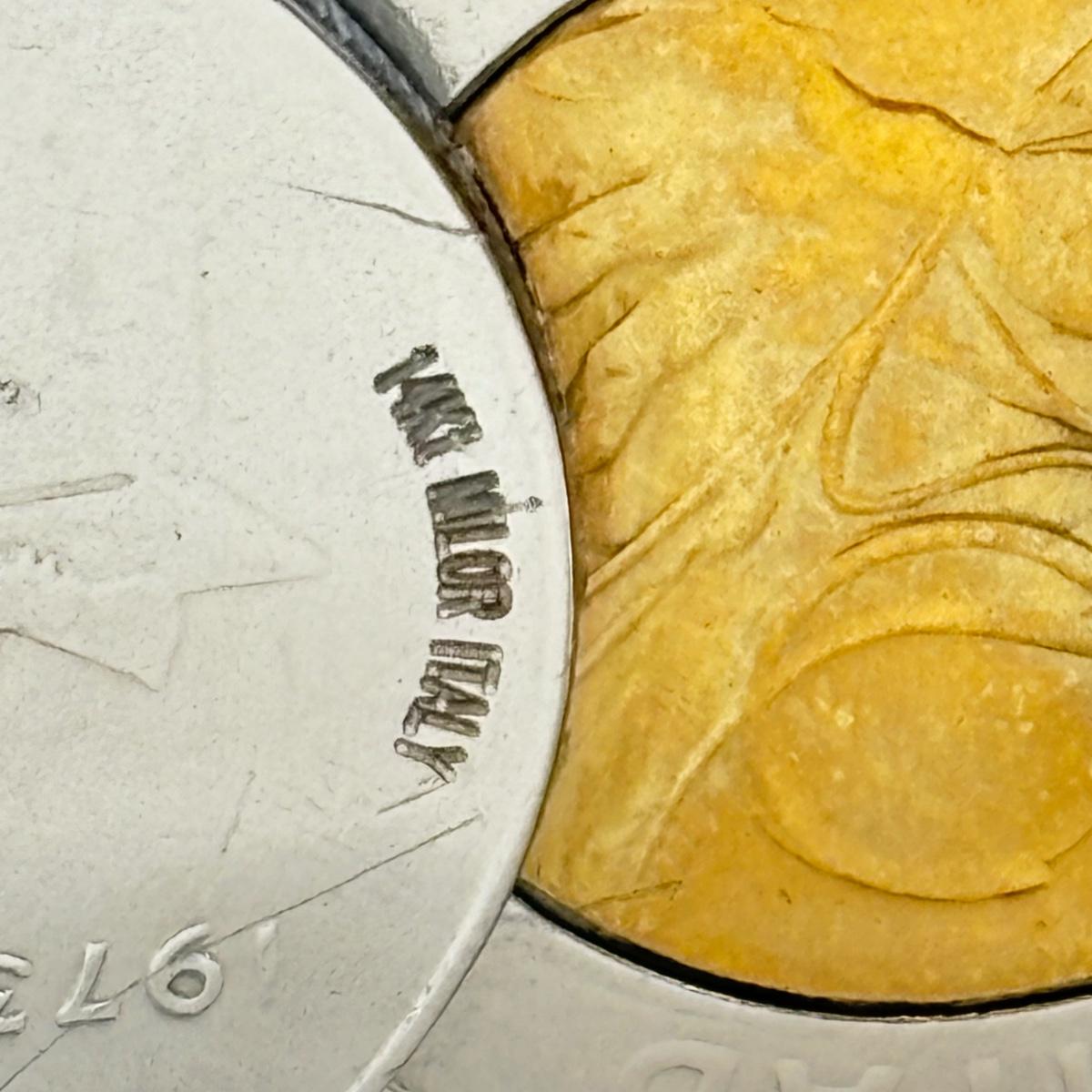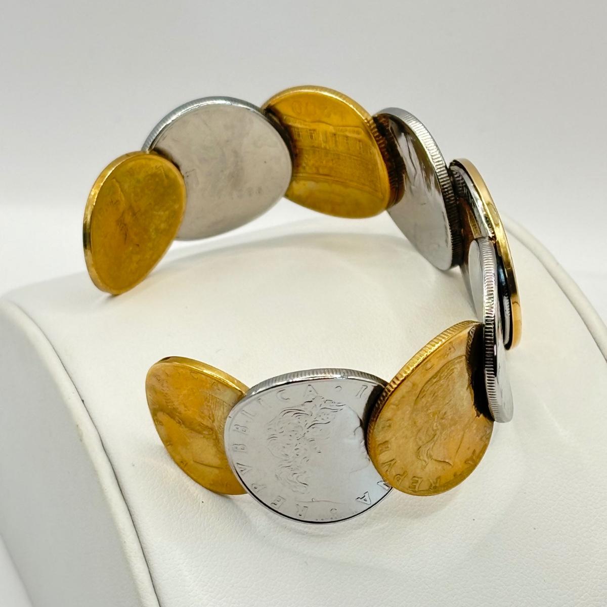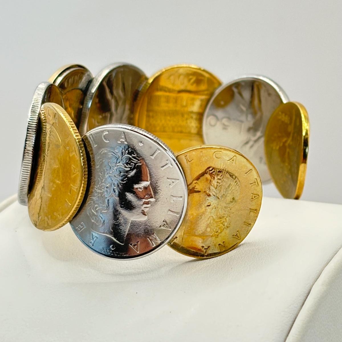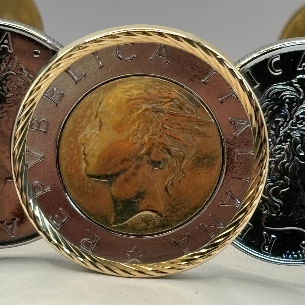 Pre-Owned cuff bracelet made up 9 overlapping, soldered together Italian coins, with 14kt. yellow gold bezel framing the focal 500 lira coin (only the center coin has the 14kt. yellow right, shiny Bright shiny like - new condition!