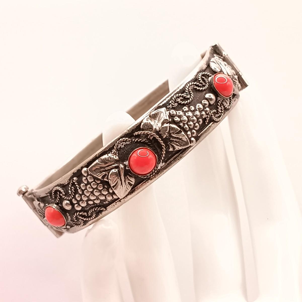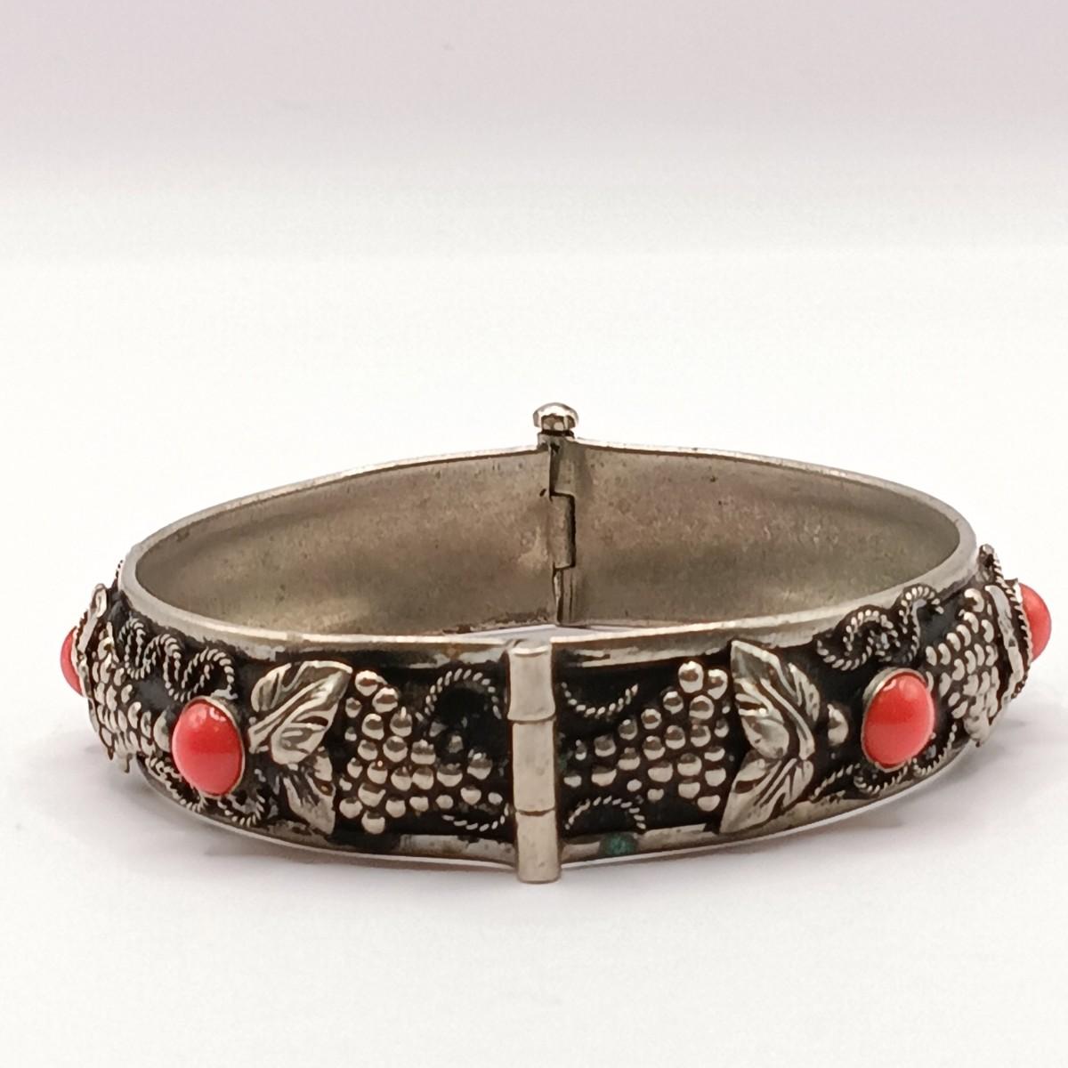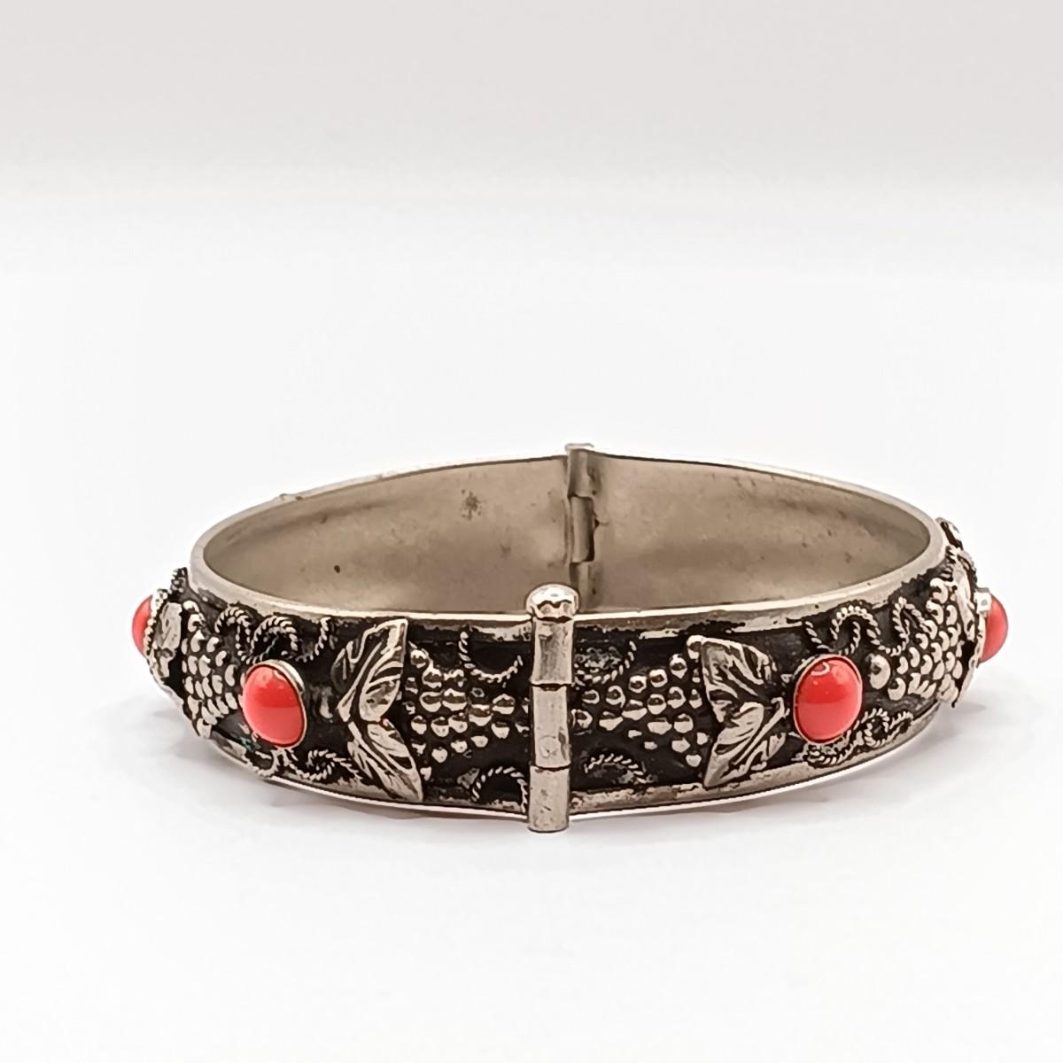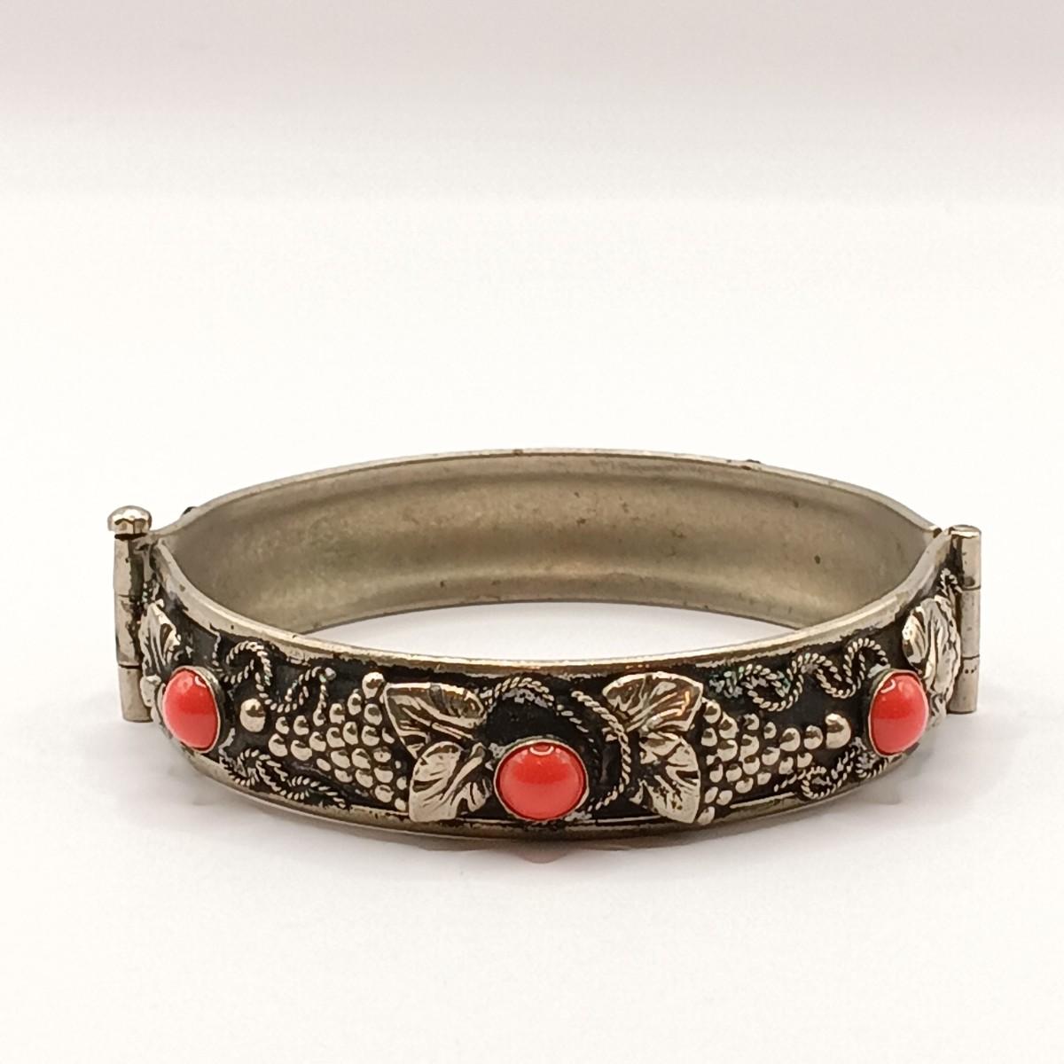 LOT 118: Vintage Pull-Pin Clasp Bangle Bracelet with Coral-Tone Stones and Grape Leaf Motif