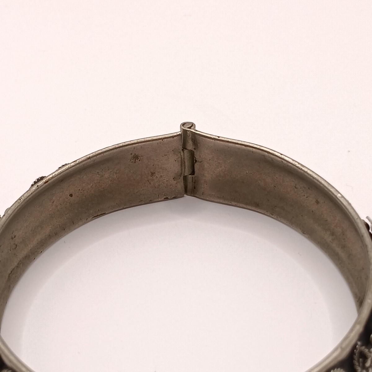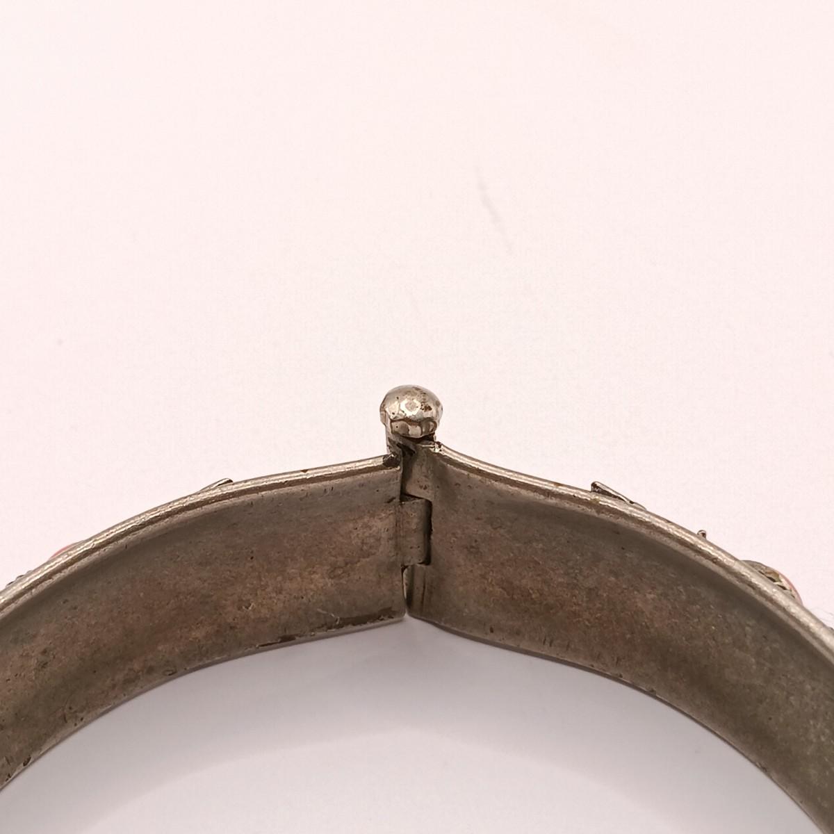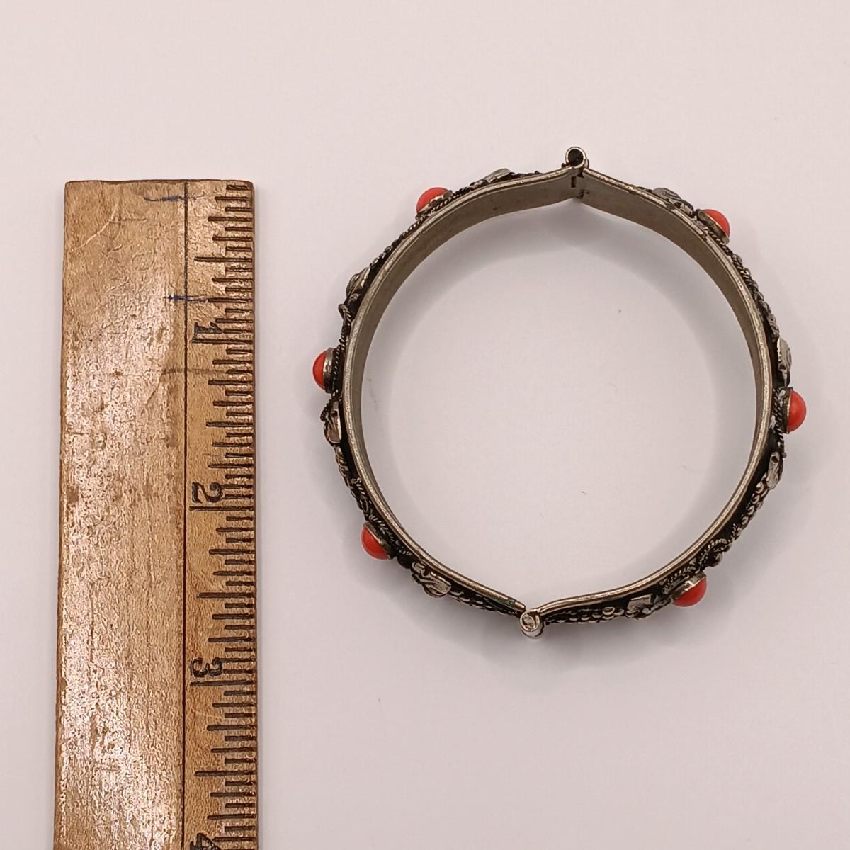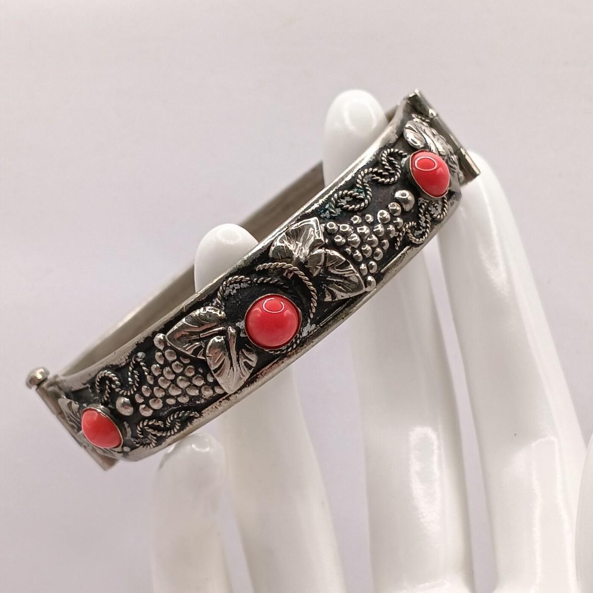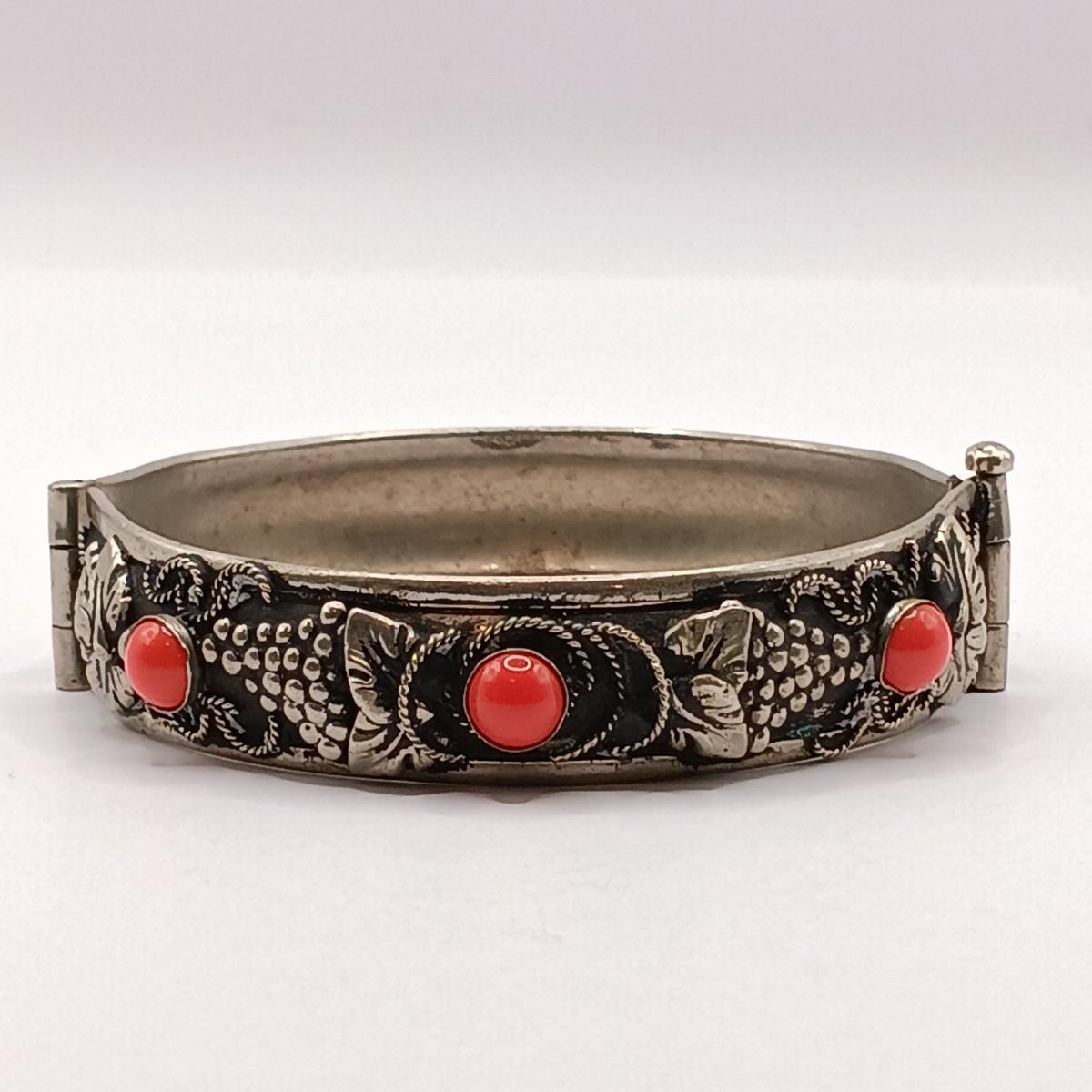 LOT 118: Vintage Pull-Pin Clasp Bangle Bracelet with Coral-Tone Stones and Grape Leaf Motif