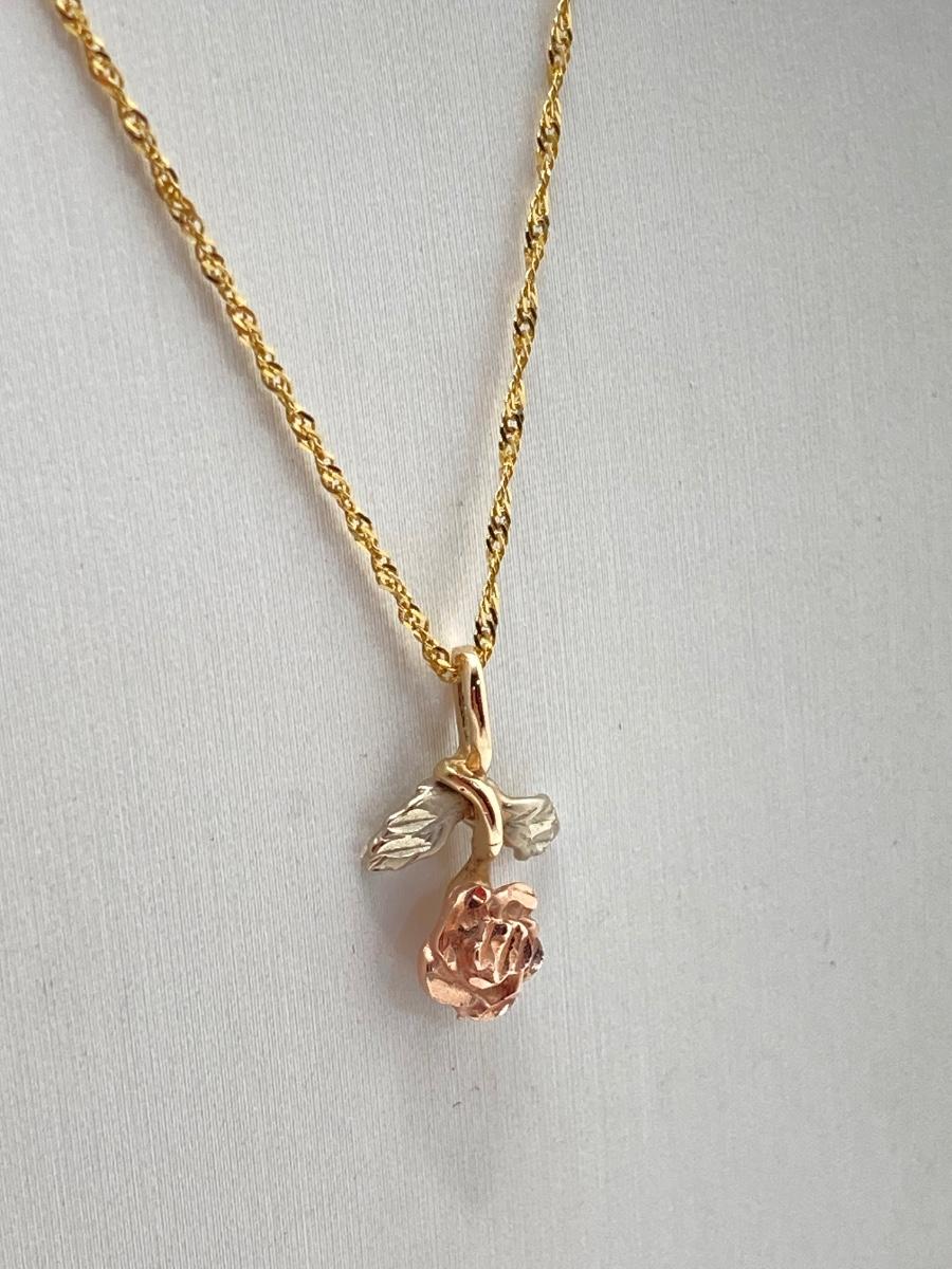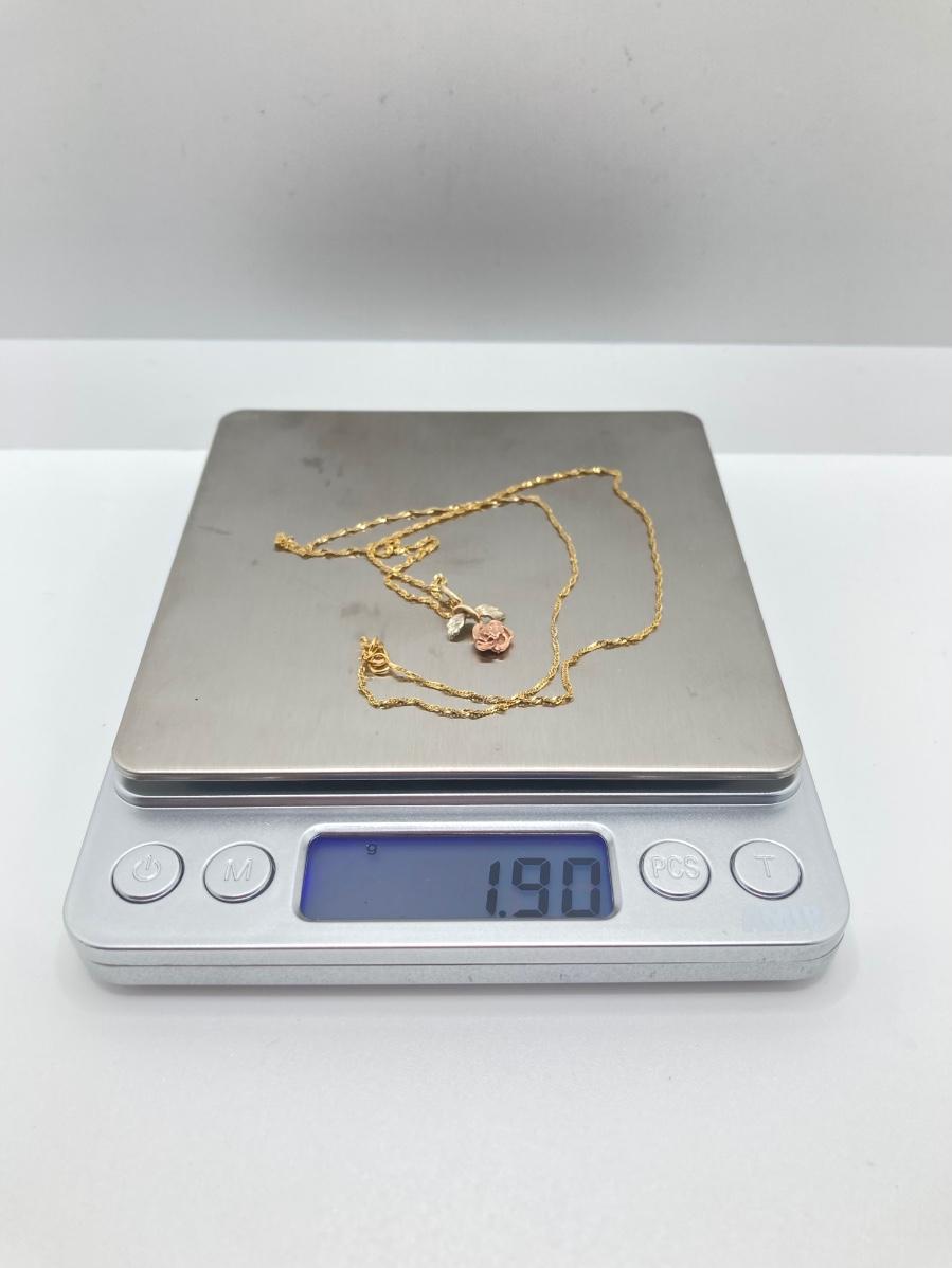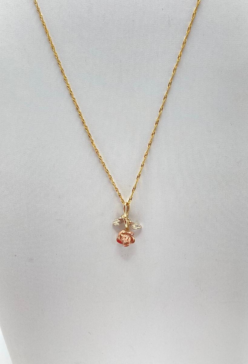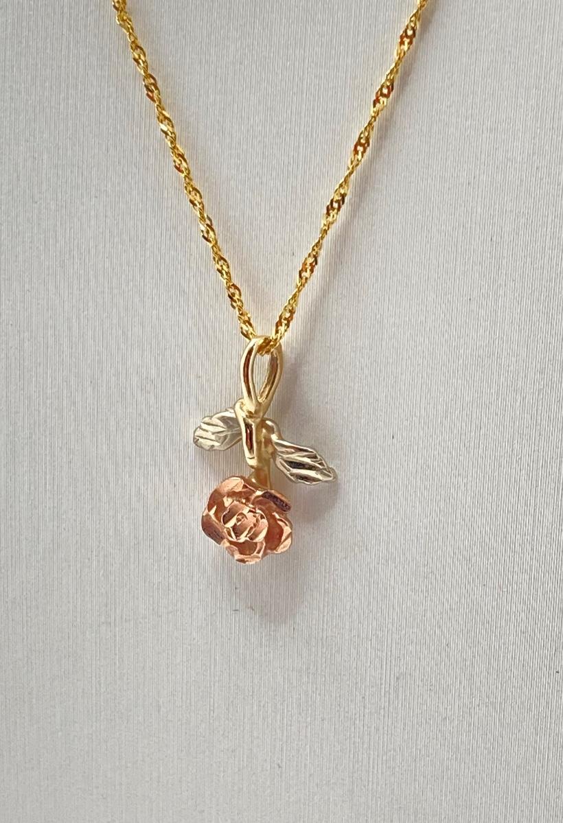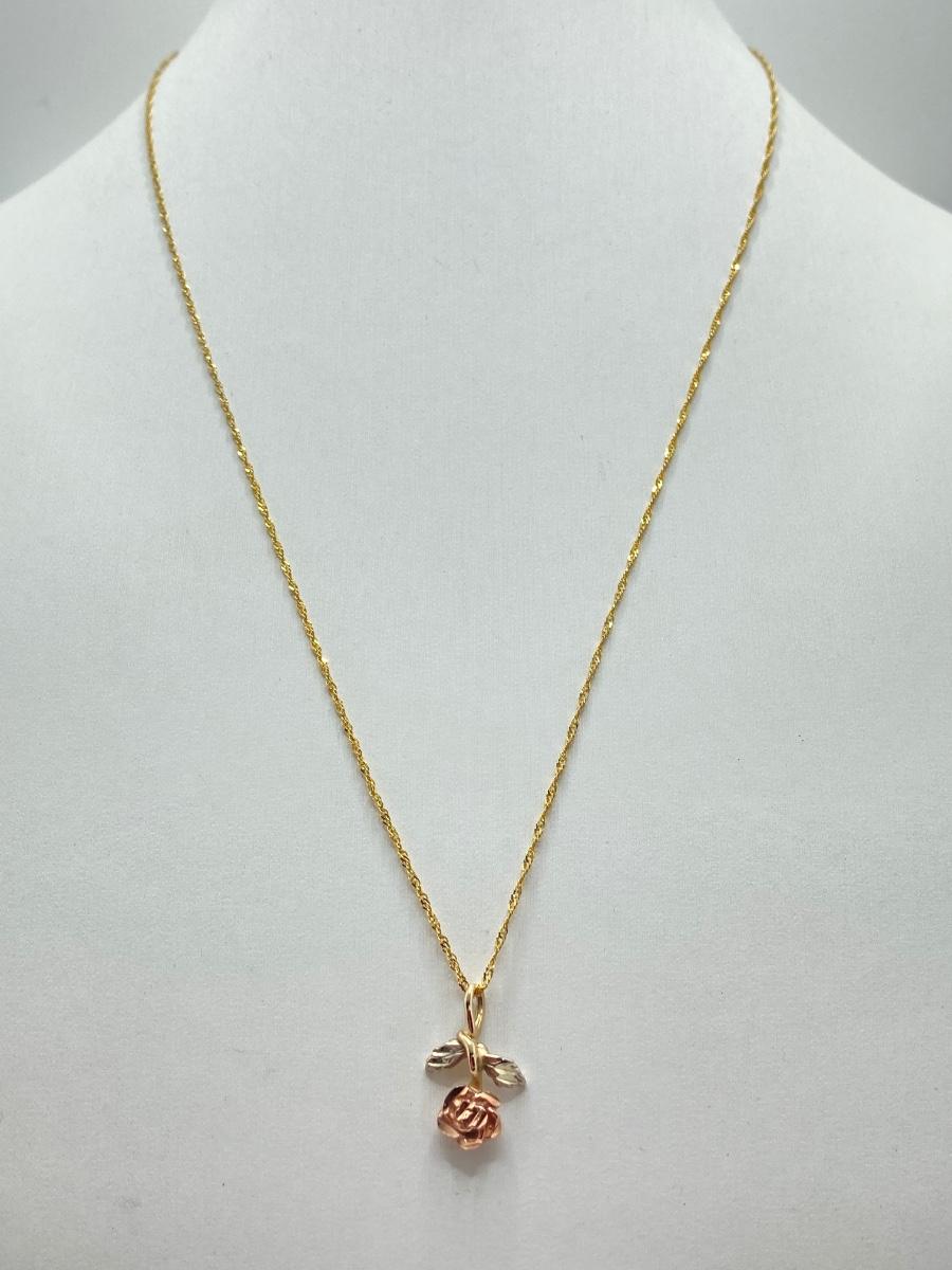 LOT 143: Diamond Cut Tri-Colored Gold Rose Pendant with Italy Gold Chain - 14KT, TW 1.90g