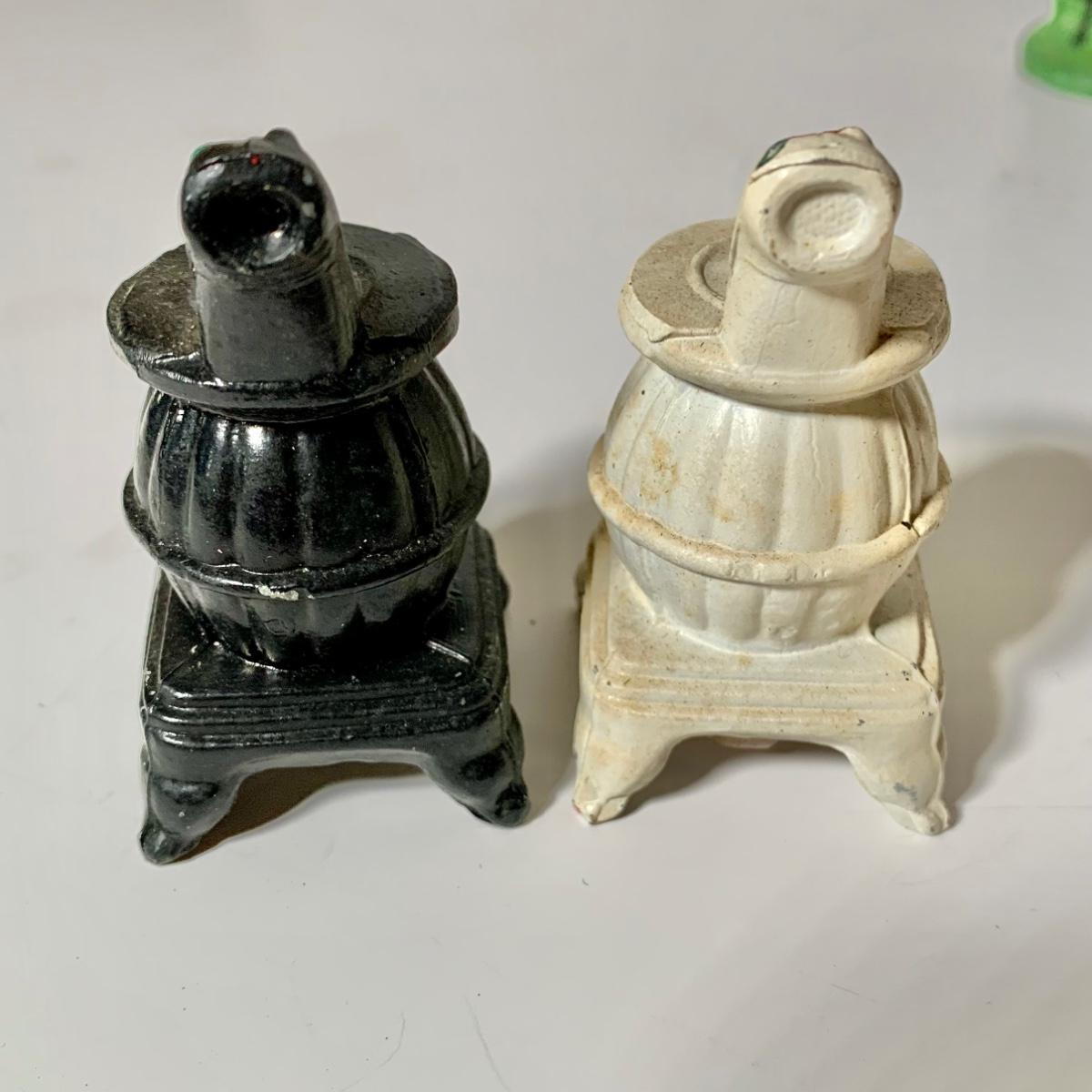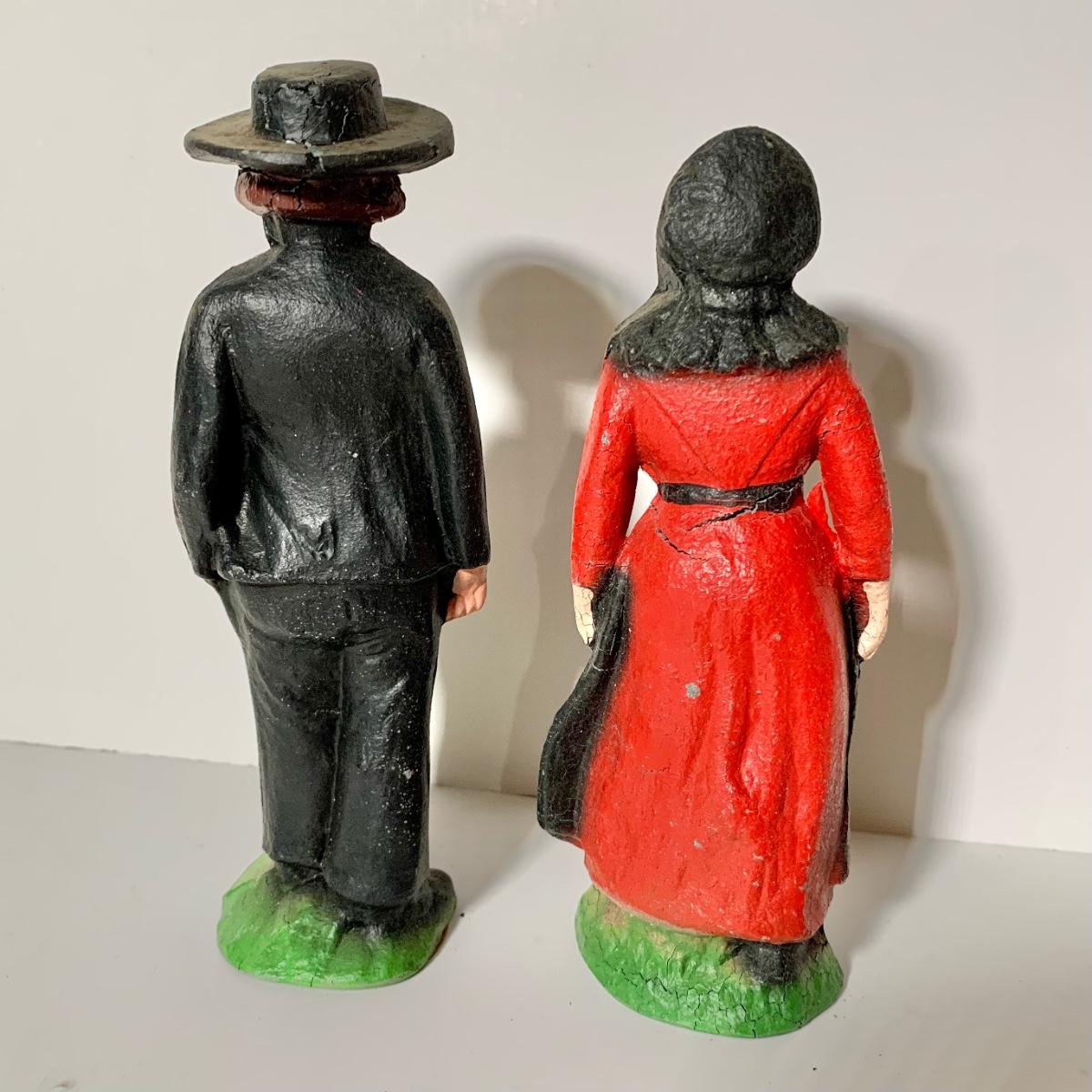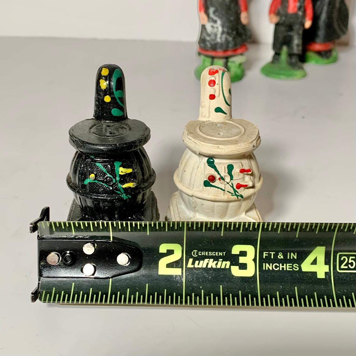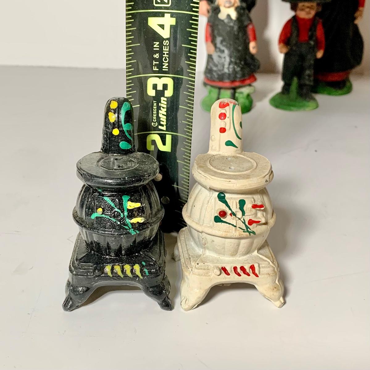 LOT 28 B: Cast Iron Miniatures: Vintage Dutch Amish Family Figurines, Irons w/ Trivets, & Pot Belly Stove Salt & Pepper Shakers