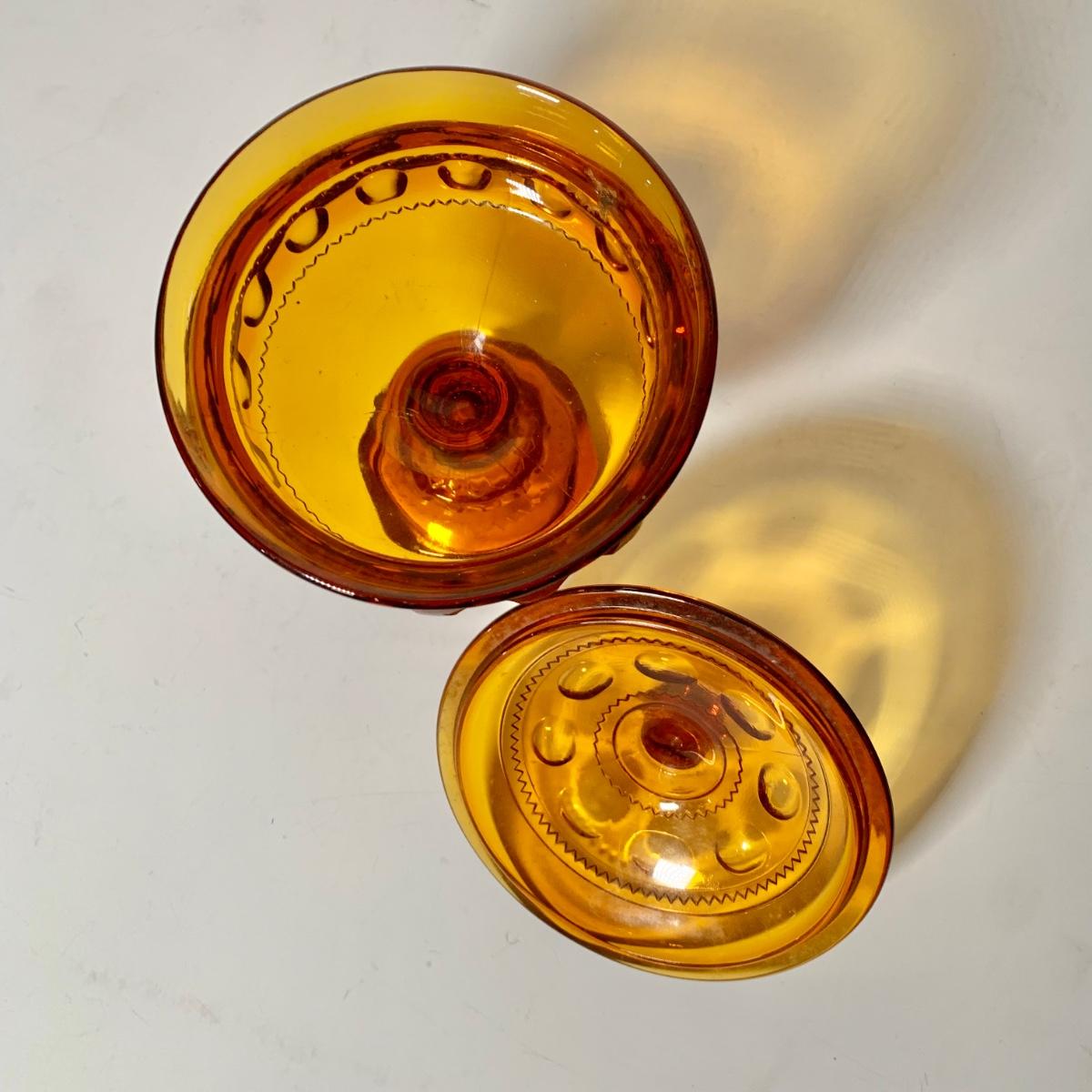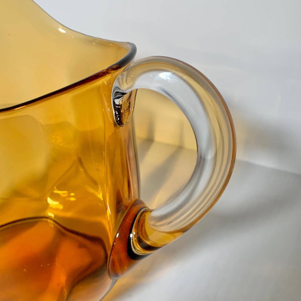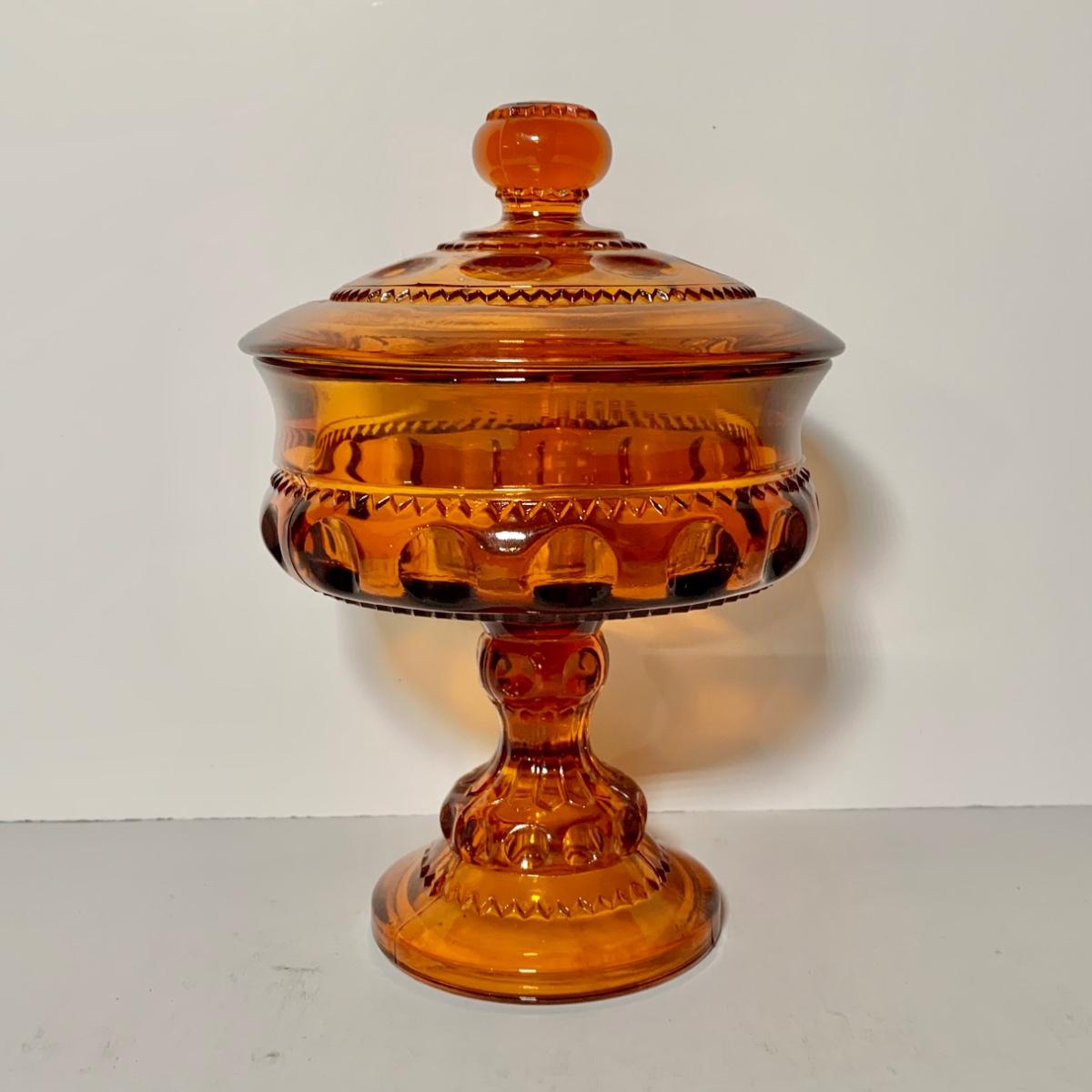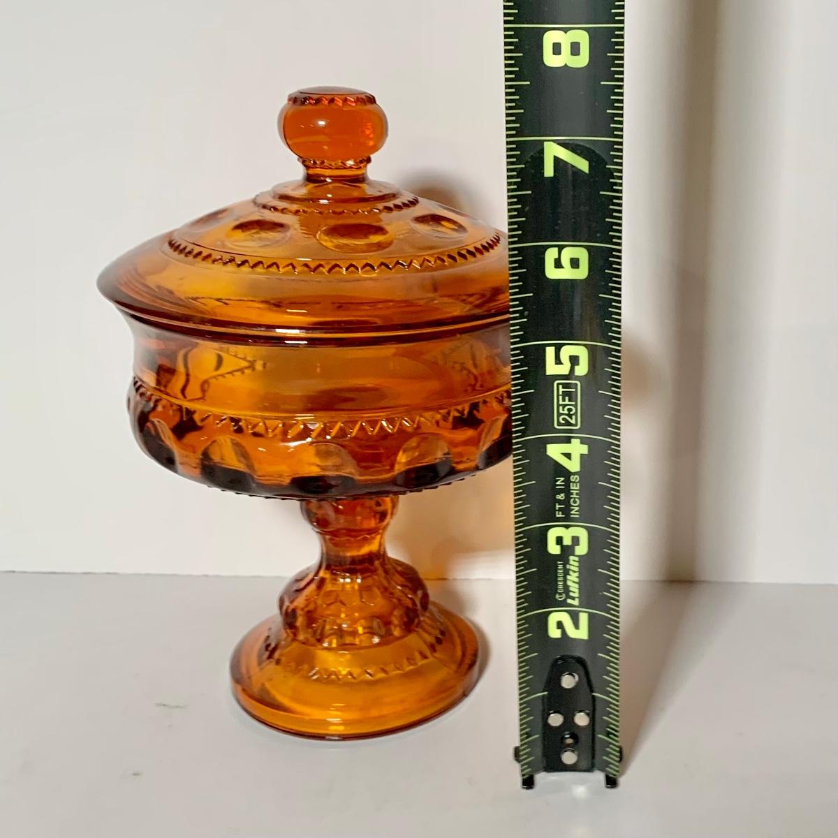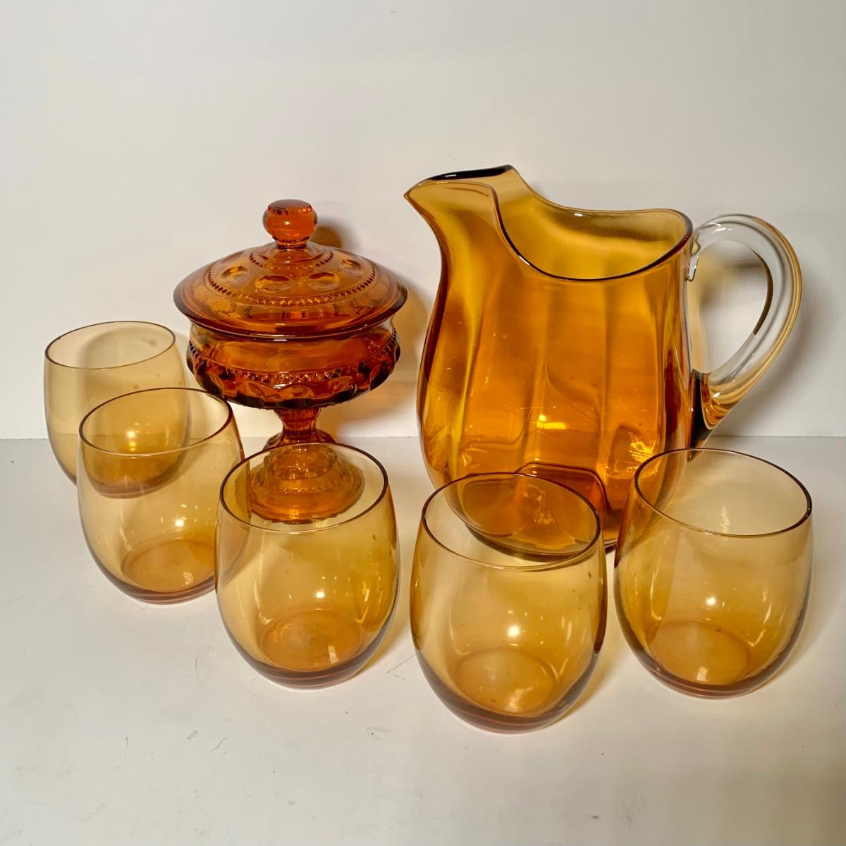 LOT 34 B: Vintage Amber Indian Glass Kings Crown Thumbprint Pedestal Candy Dish & Hand Blown Amber Glass Pitcher w/ 5 Amber Drinking Glasses