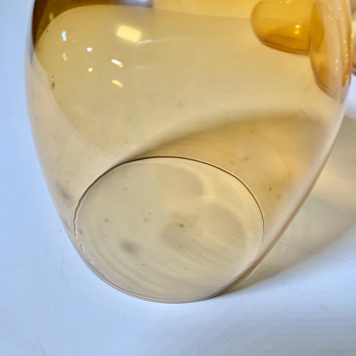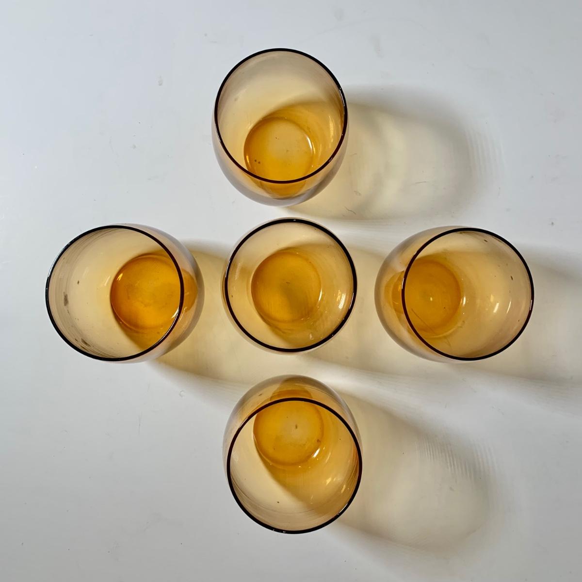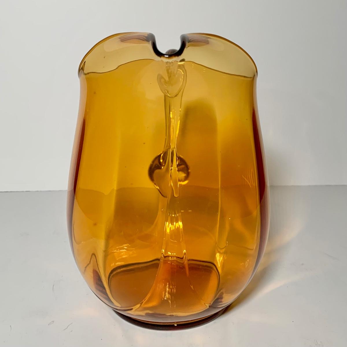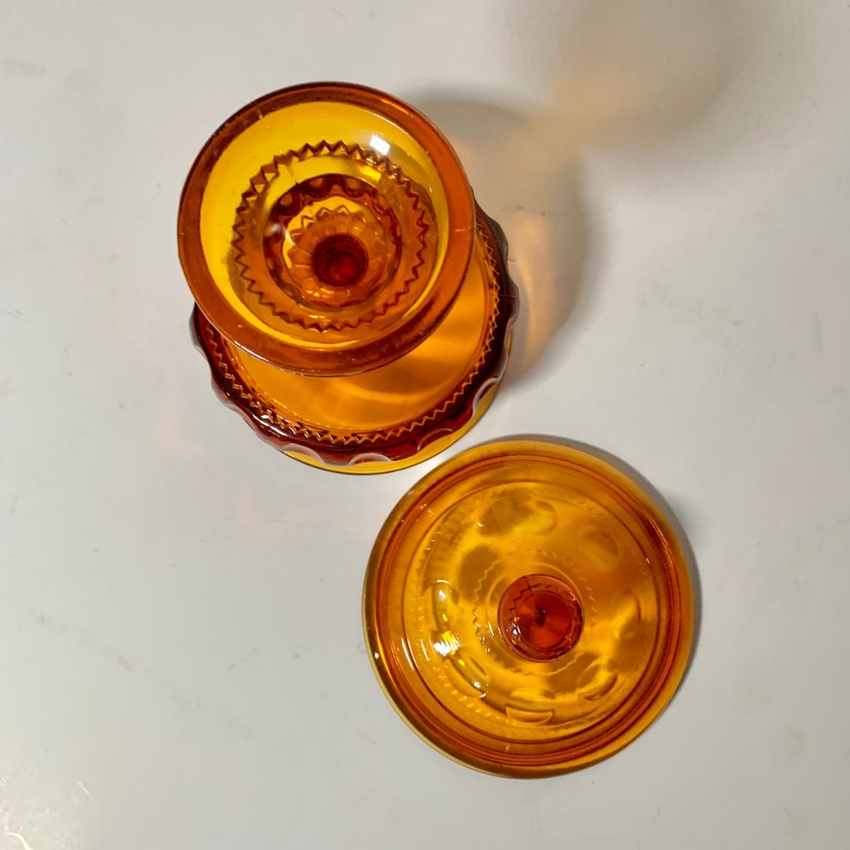 LOT 34 B: Vintage Amber Indian Glass Kings Crown Thumbprint Pedestal Candy Dish & Hand Blown Amber Glass Pitcher w/ 5 Amber Drinking Glasses