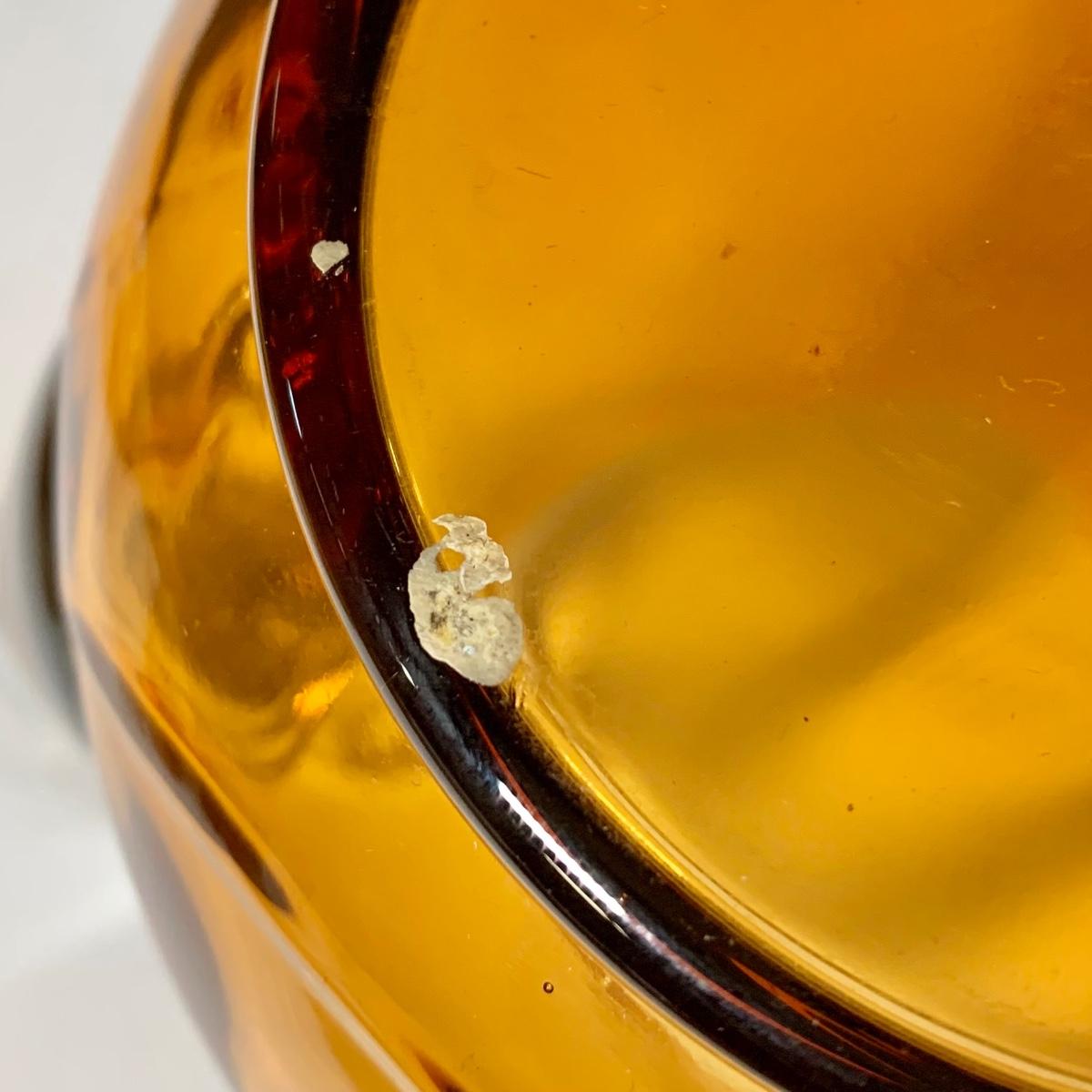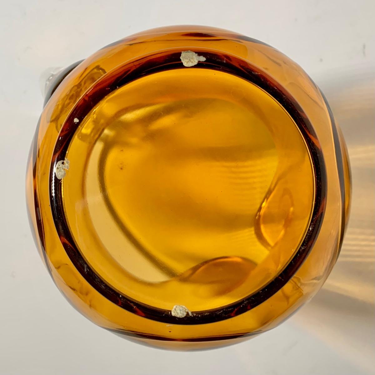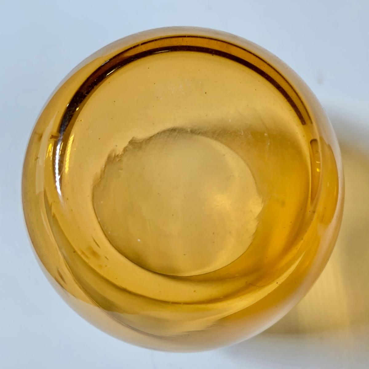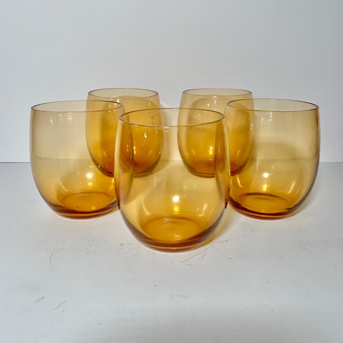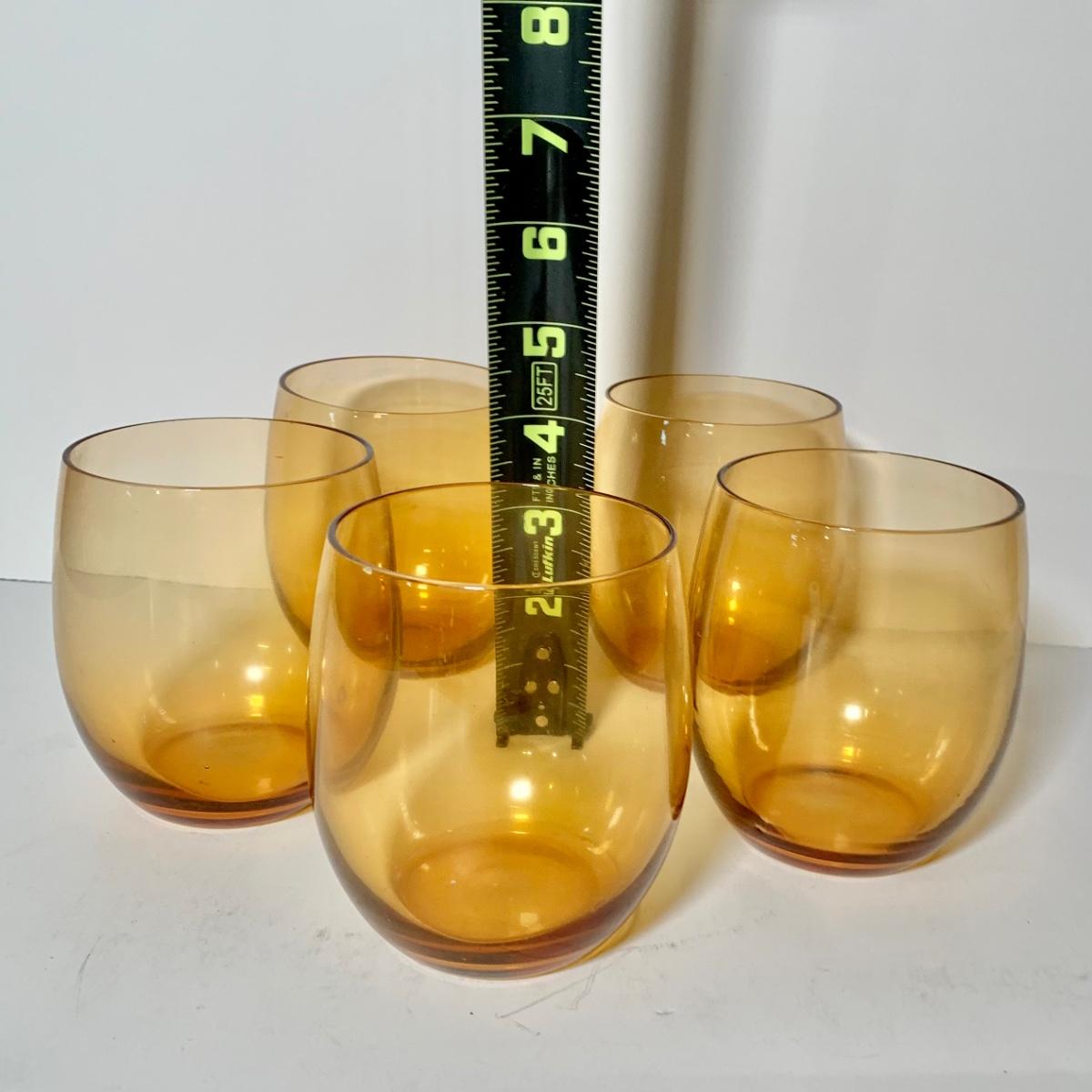 LOT 34 B: Vintage Amber Indian Glass Kings Crown Thumbprint Pedestal Candy Dish & Hand Blown Amber Glass Pitcher w/ 5 Amber Drinking Glasses