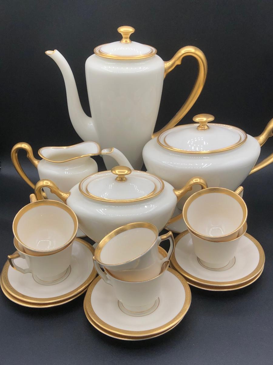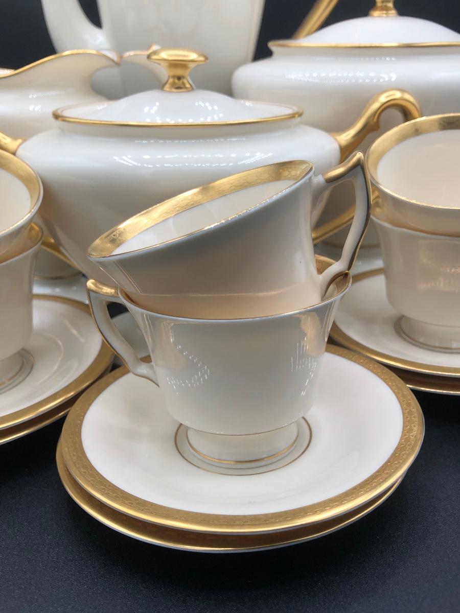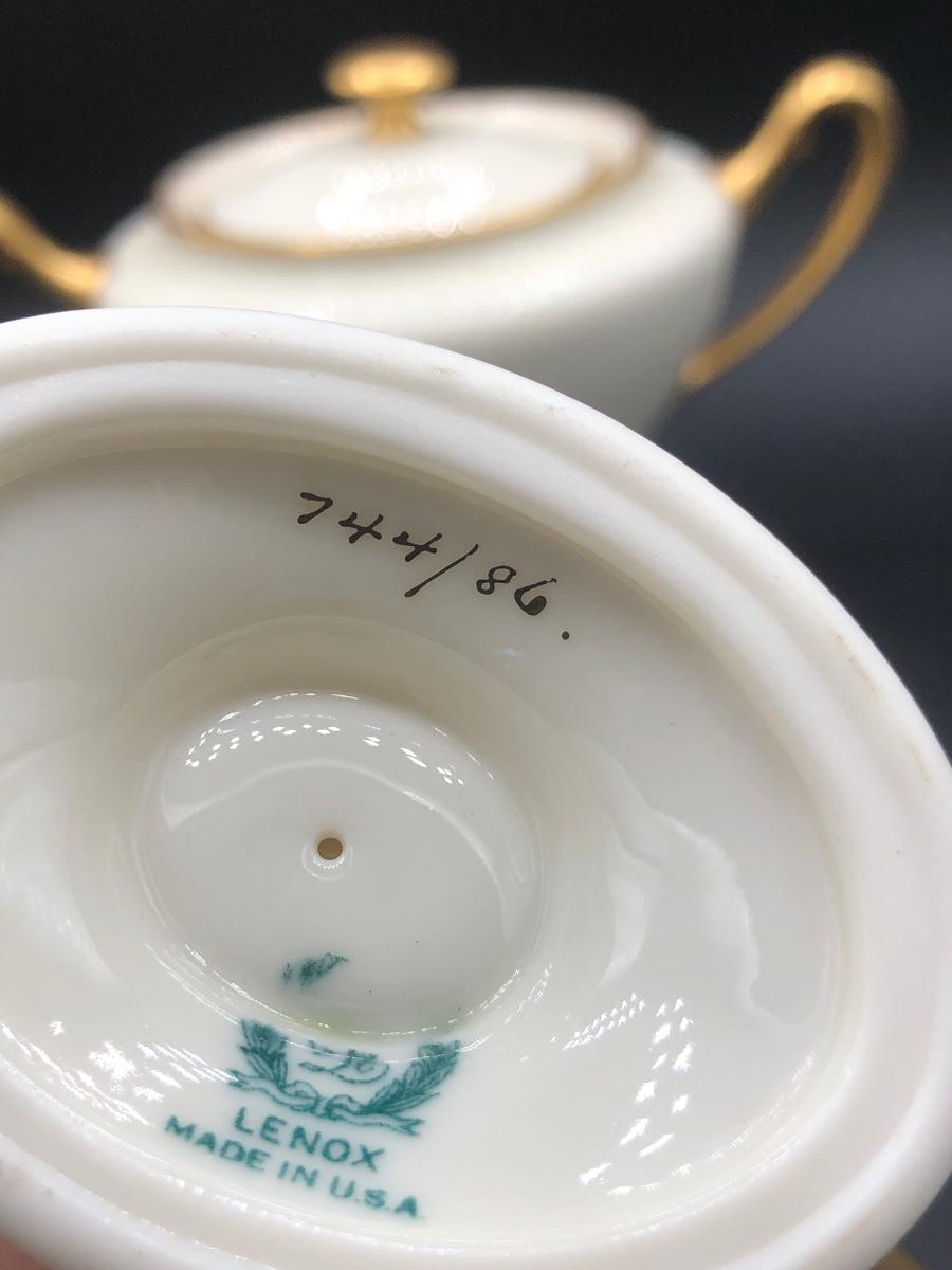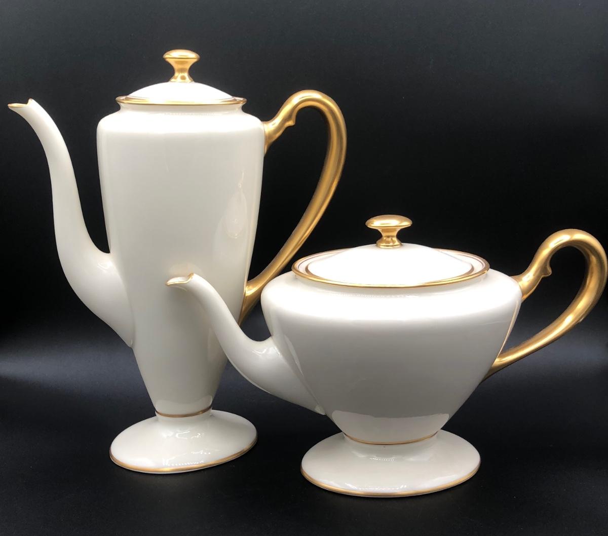 LOT 87D: Gold & White Coordinating China - Lenox Tea Pot, Coffee Pot, Sugar Bowl & Creamer w/ Tatler of Trenton NJ Teacups & Saucers (Service for 6)