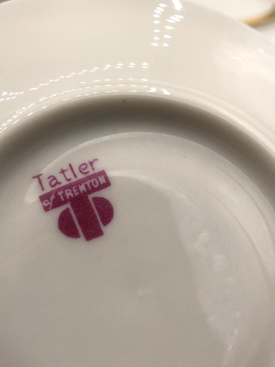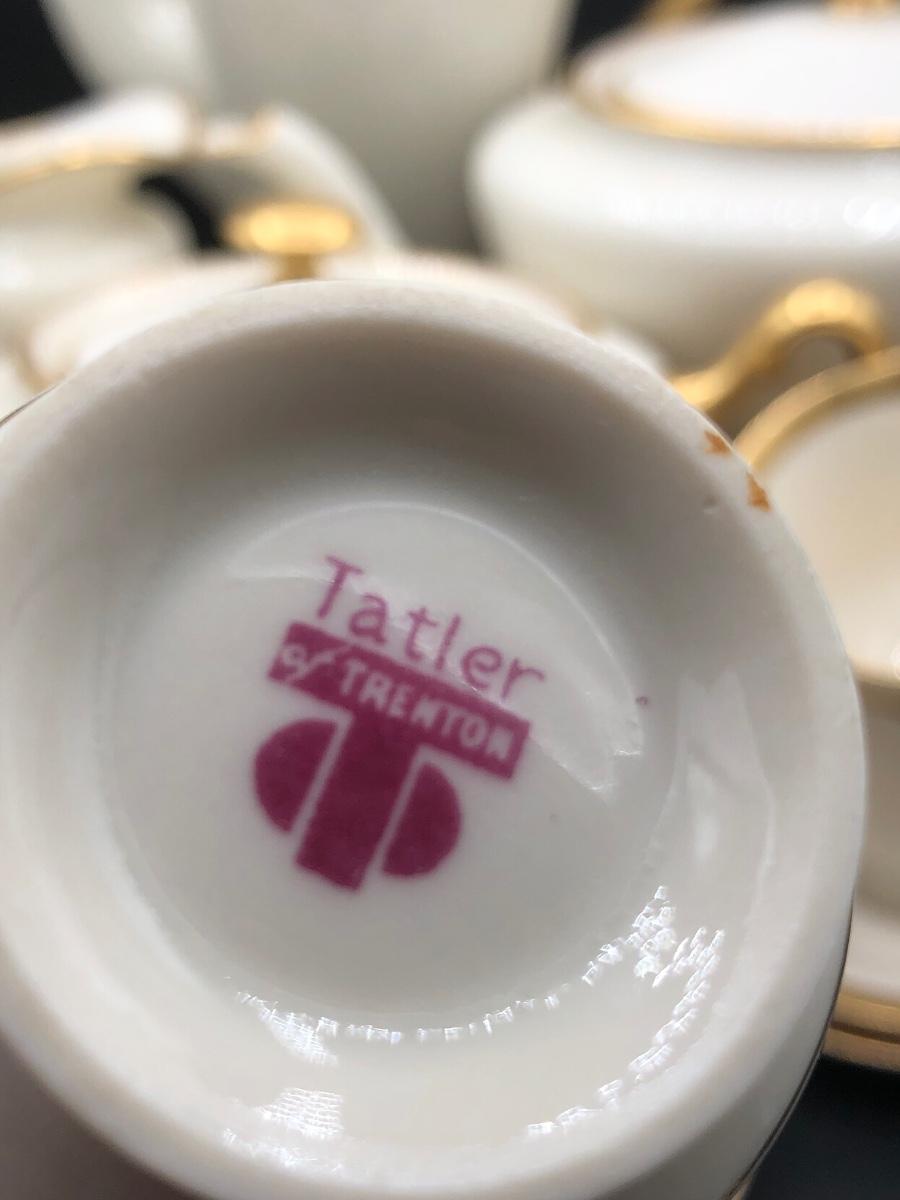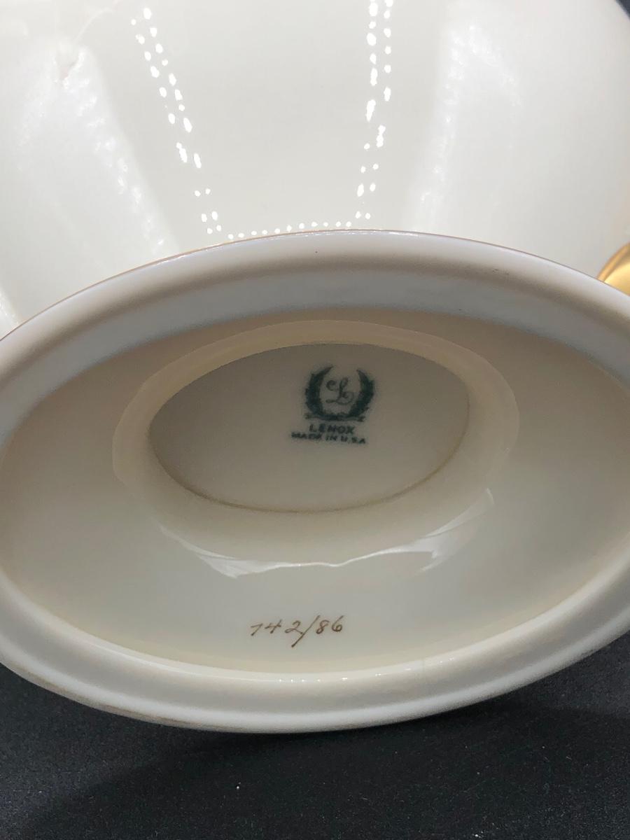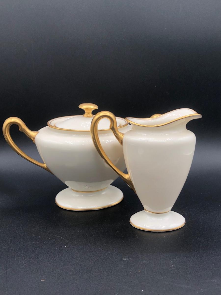 LOT 87D: Gold & White Coordinating China - Lenox Tea Pot, Coffee Pot, Sugar Bowl & Creamer w/ Tatler of Trenton NJ Teacups & Saucers (Service for 6)