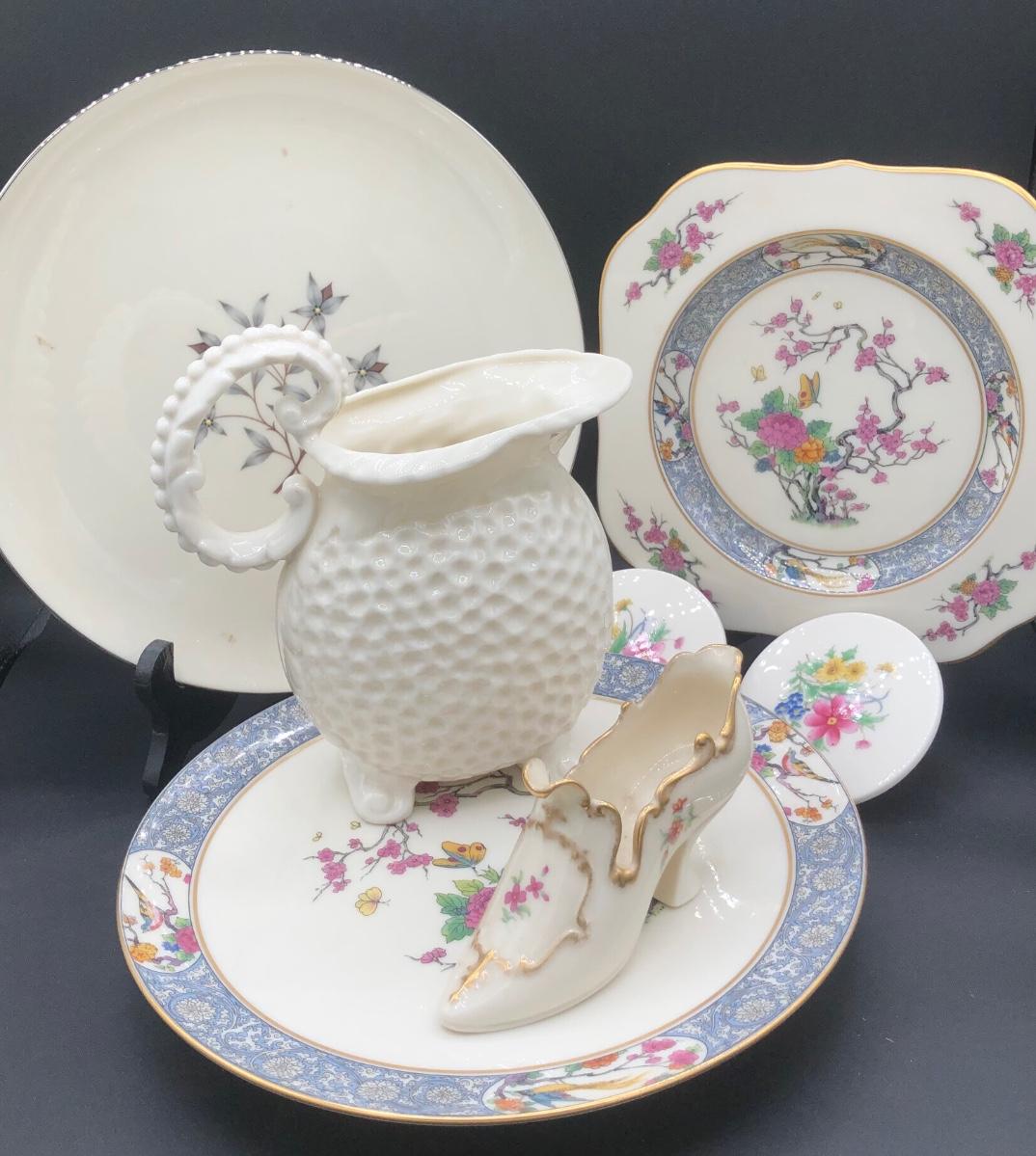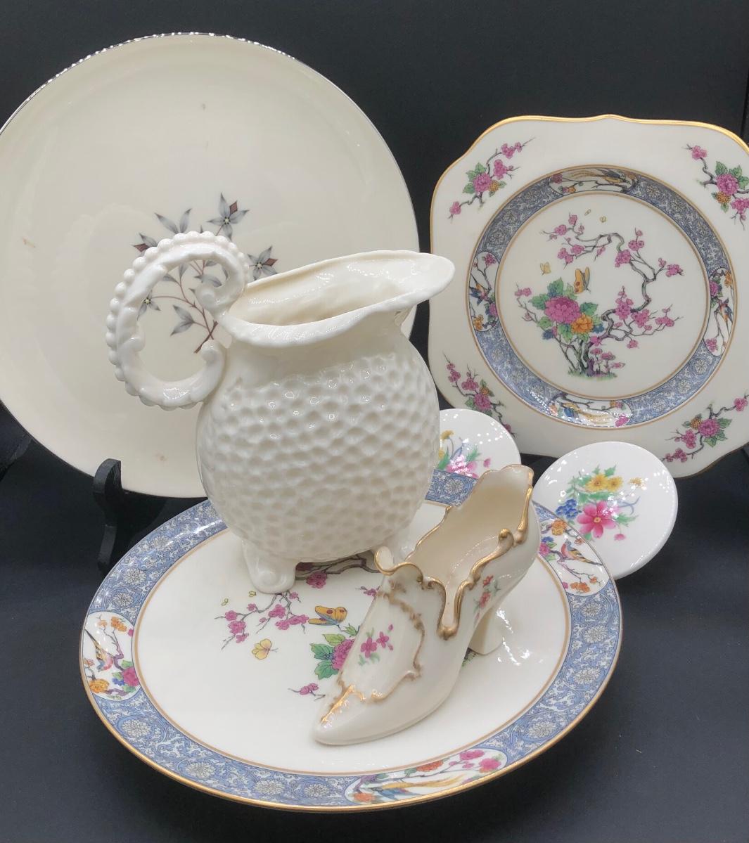 LOT 88D: Unique Lenox Collection - Victorian Shoe, Ming Plates, 10.5" Princess Plate (X516), Vintage Dimpled Footed Water Pitcher & Floral Coasters