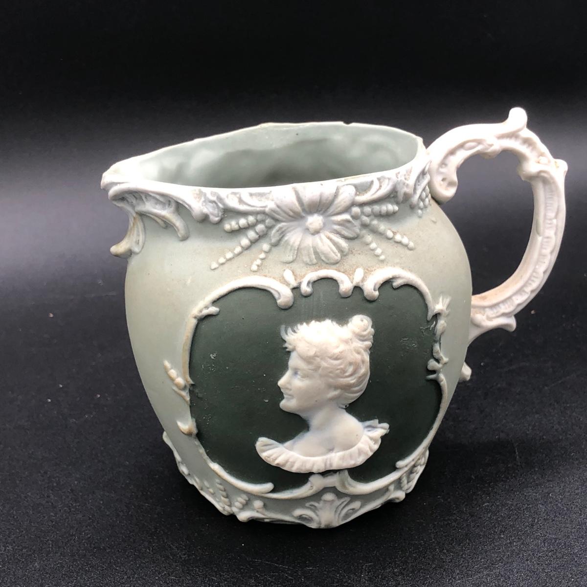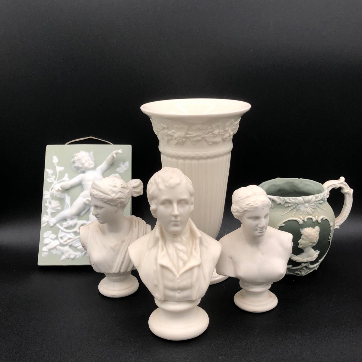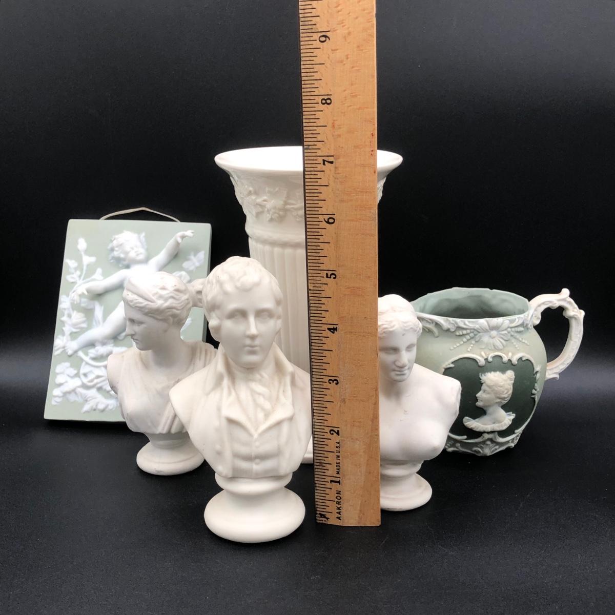 LOT 90D: Wedgwood Etruria & Barlaston Embossed Queen's Ware Vase, Vintage Porcelain Busts of Venus De Milo, Artemis Diana & Robert Burns, Bisque Cherub Wall Art & Vintage Victorian Cameo Cream Pitcher