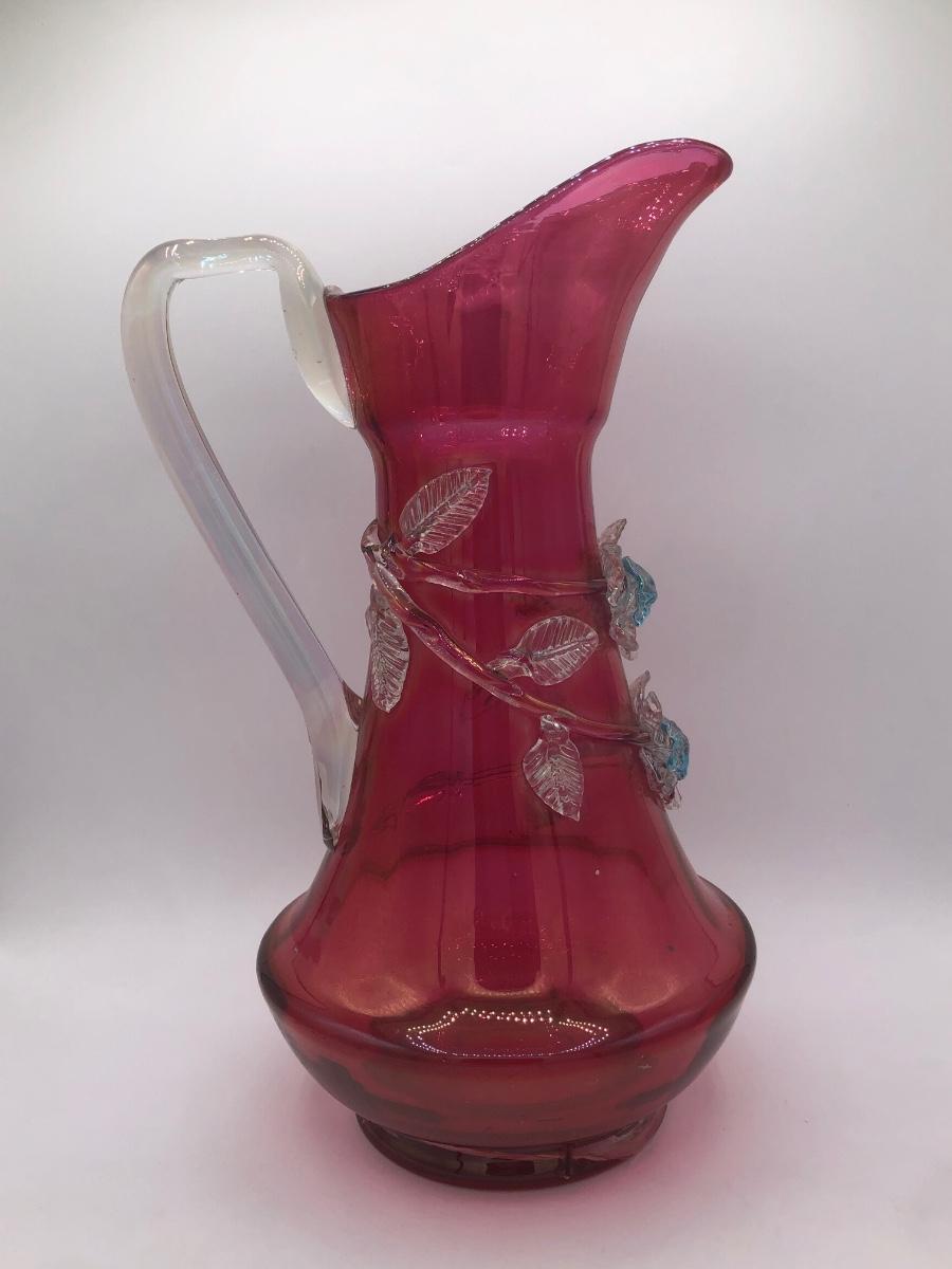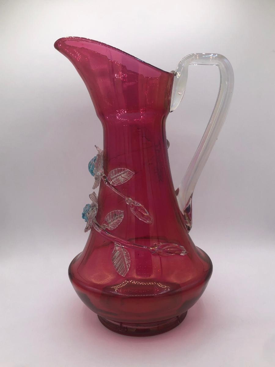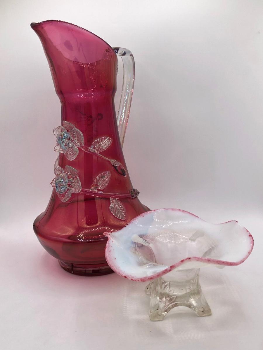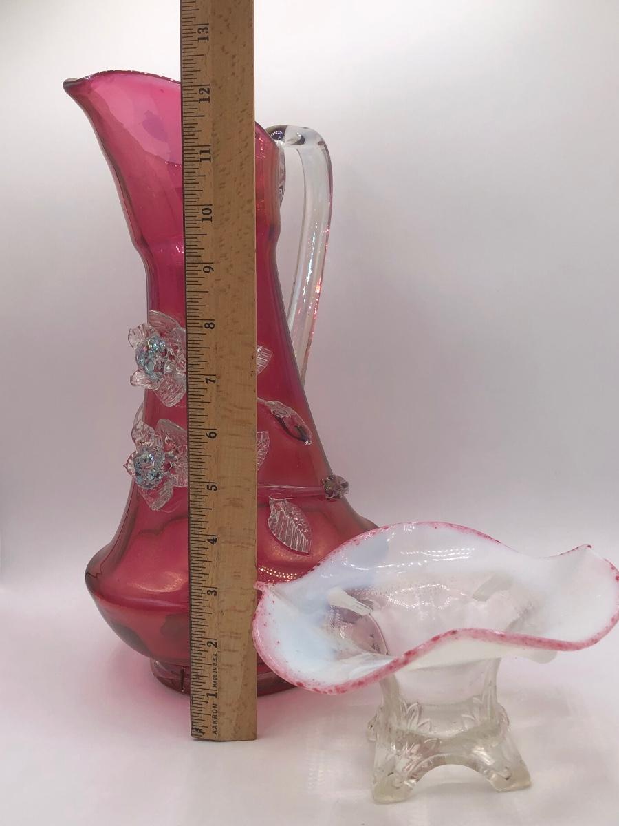 LOT 91D: Vintage Hand Blown Cranberry Glass Sculpted Flower Pitcher & Glass Wavy Edge Pedestal Compote